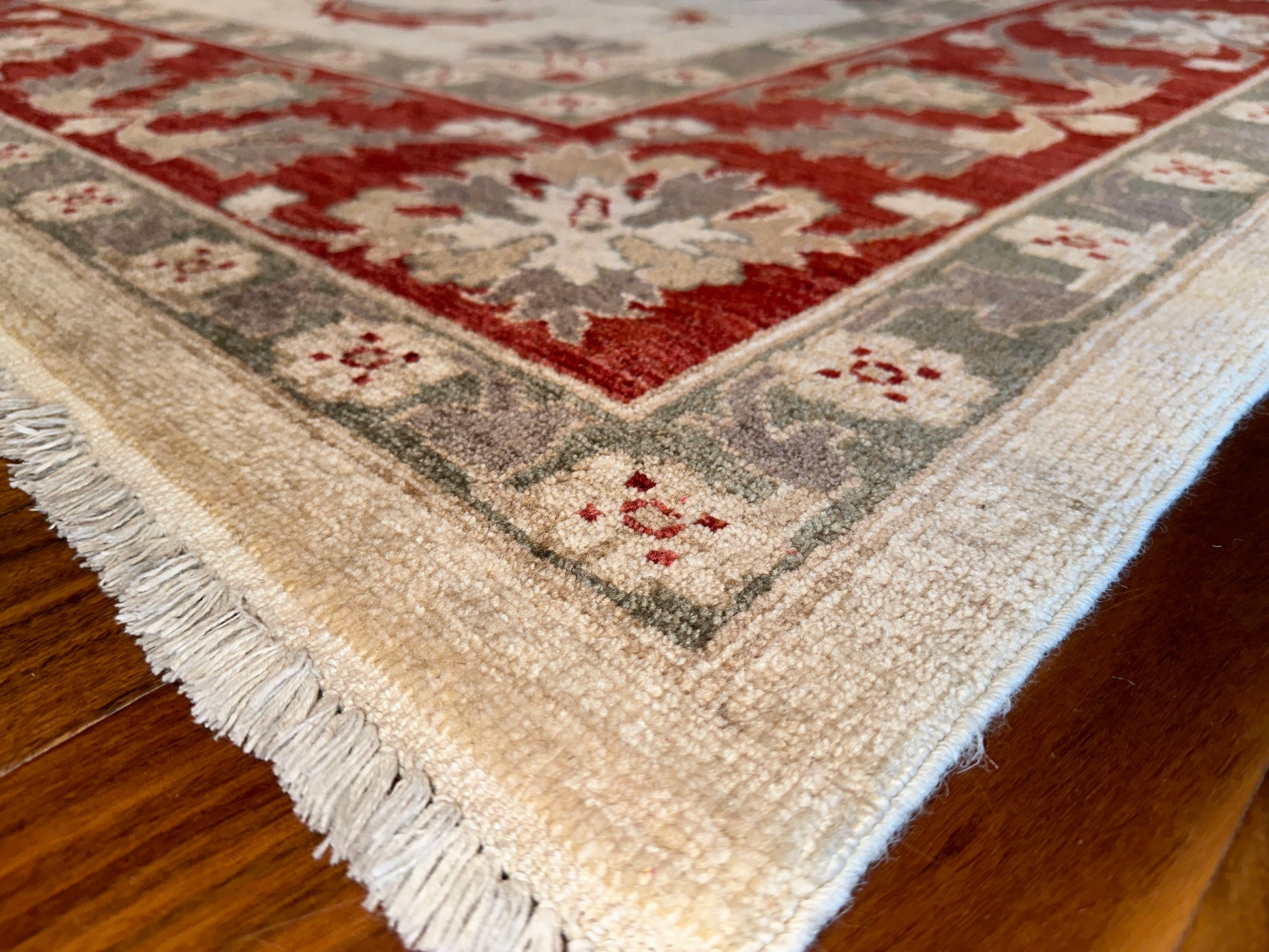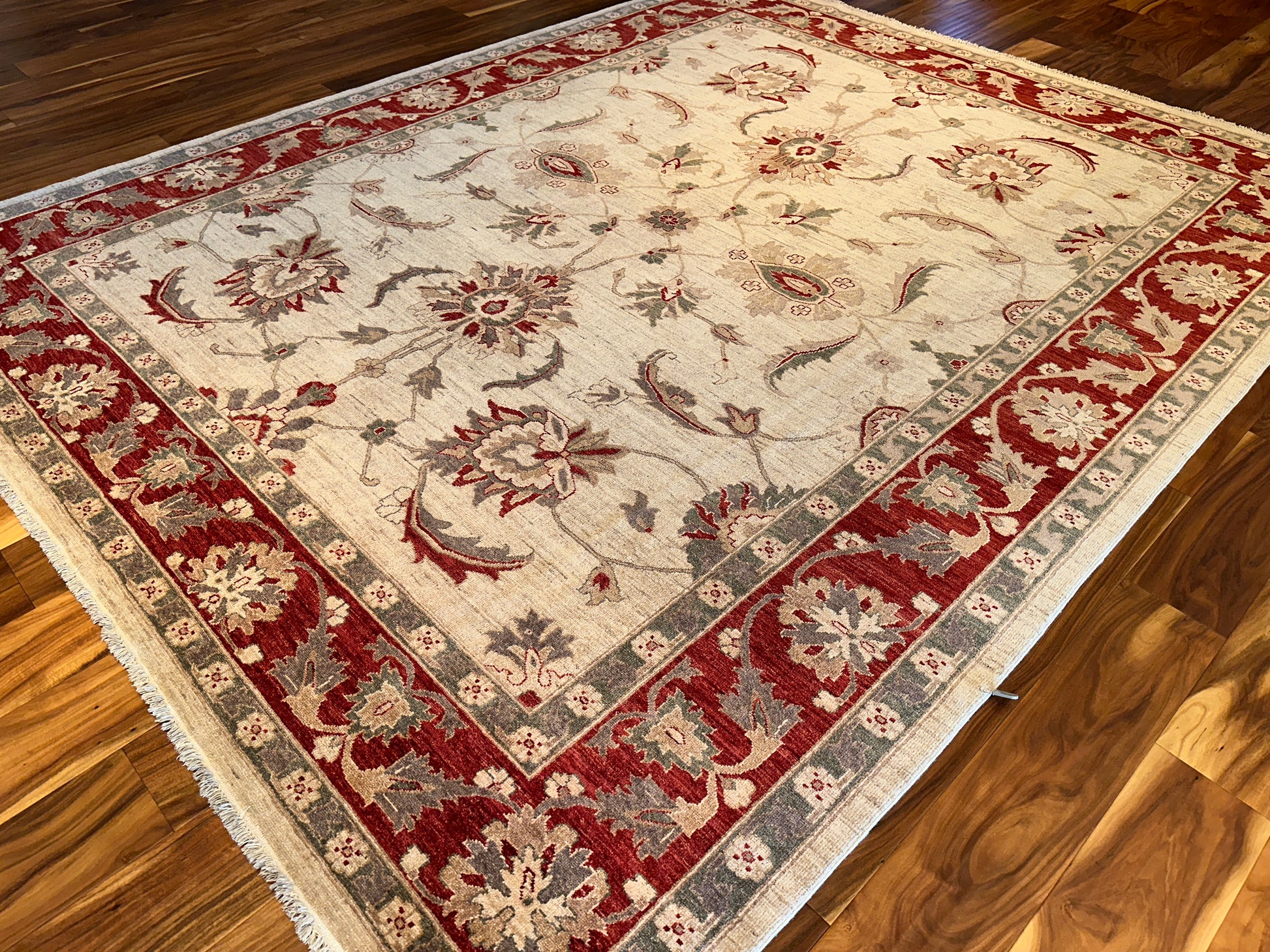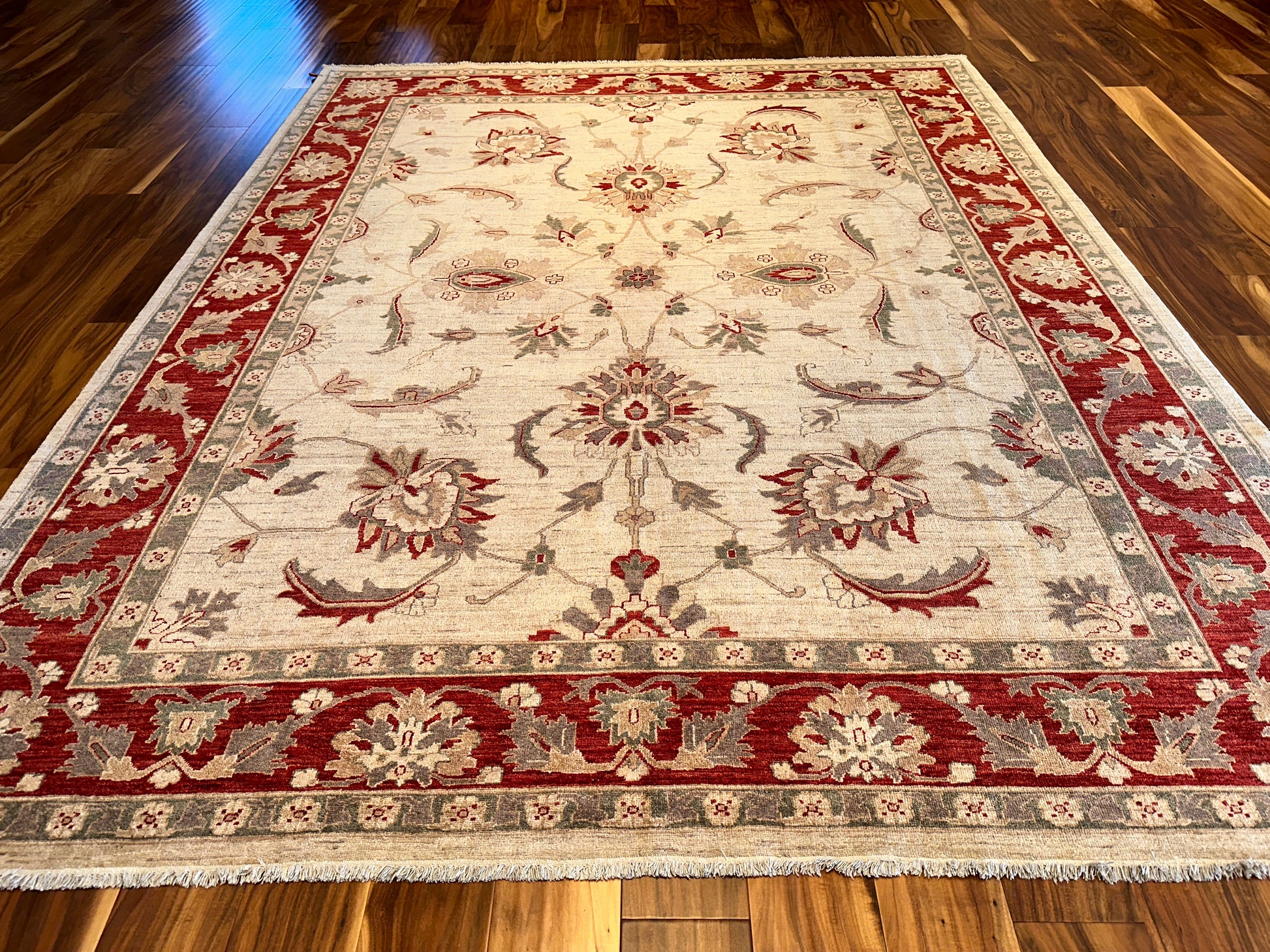 Graceful and grounded, this hand-knotted rug combines a soft ivory backdrop with a striking red border, framing a beautifully restrained floral design. Delicate vines and stylized blossoms in muted greys and warm reds weave gently across the field, creating a balance of elegance and calm. This piece would lend refinement to a formal dining room or a classic living area.