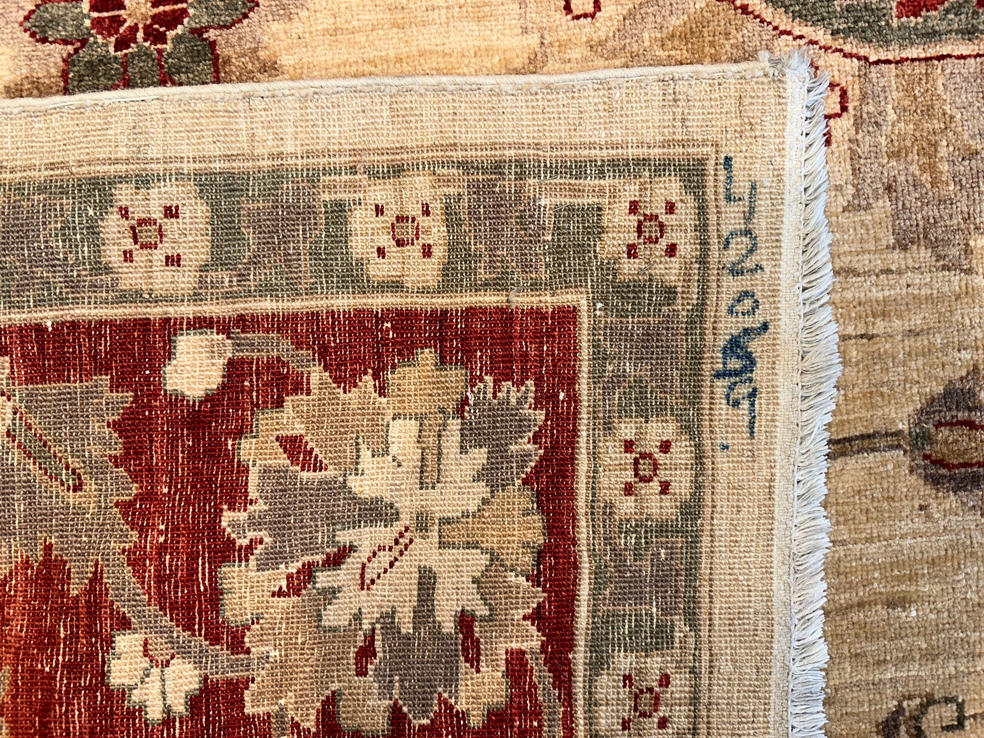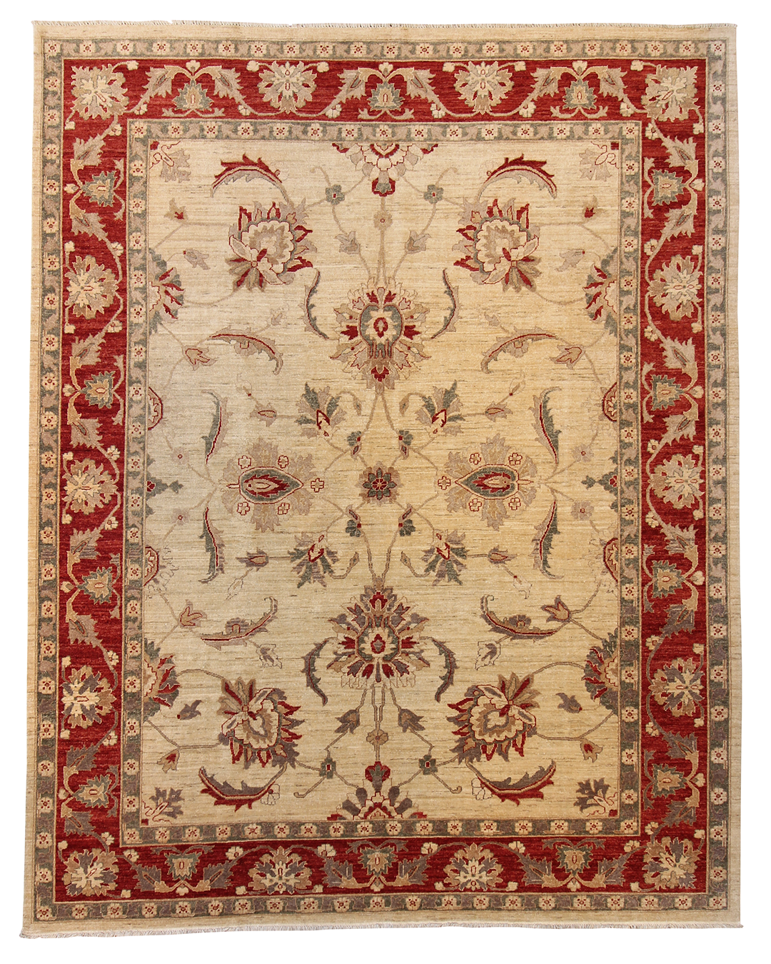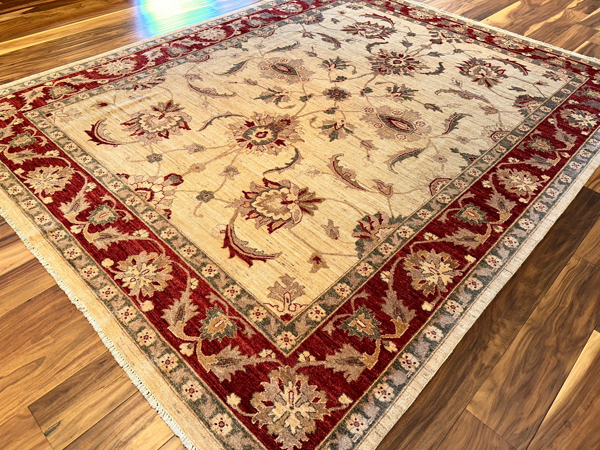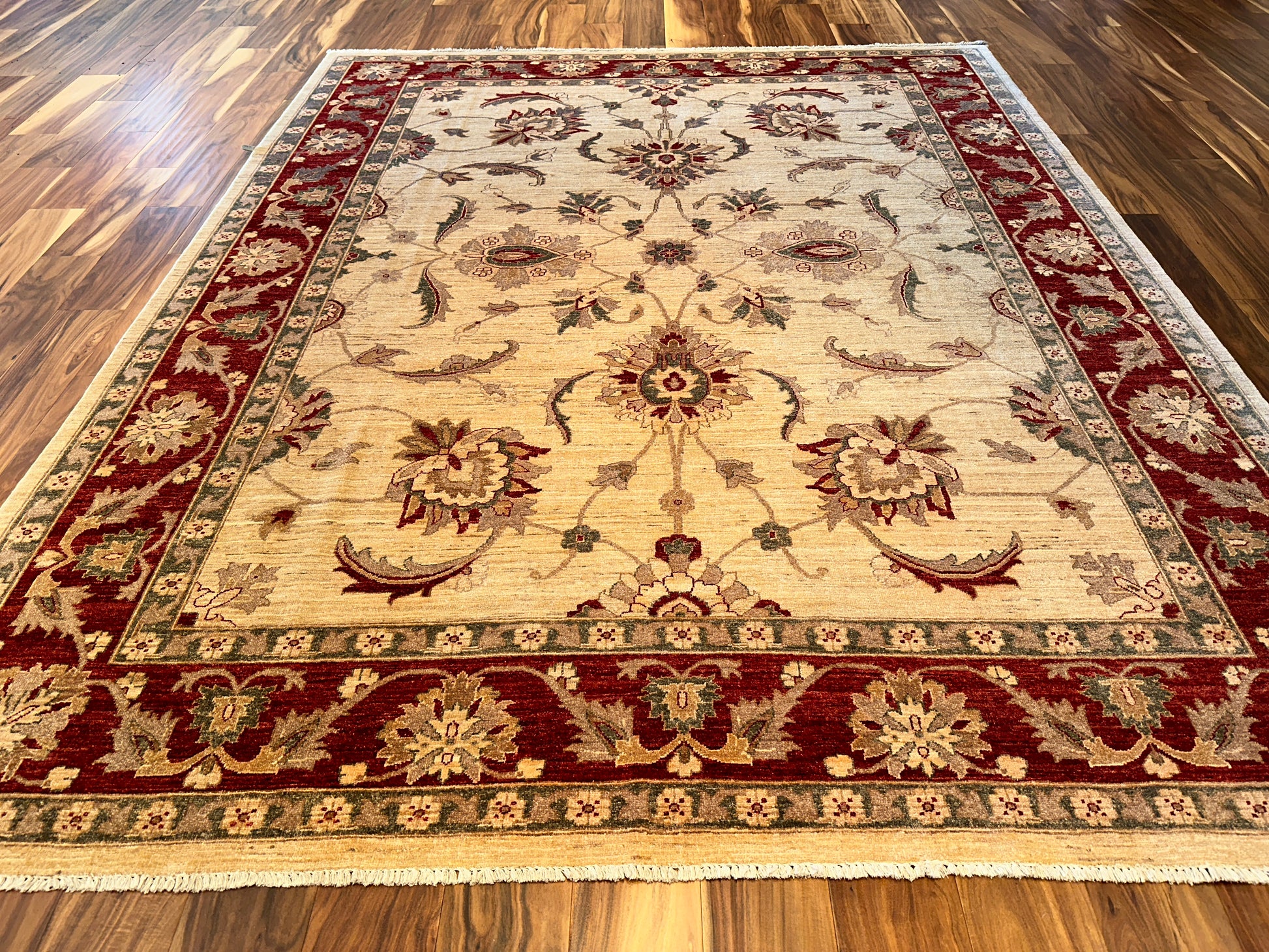 Graceful and grounded, this hand-knotted rug combines a soft ivory backdrop with a striking red border, framing a beautifully restrained floral design. Delicate vines and stylized blossoms in muted greys and warm reds weave gently across the field, creating a balance of elegance and calm. This piece would lend refinement to a formal dining room or a classic living area.