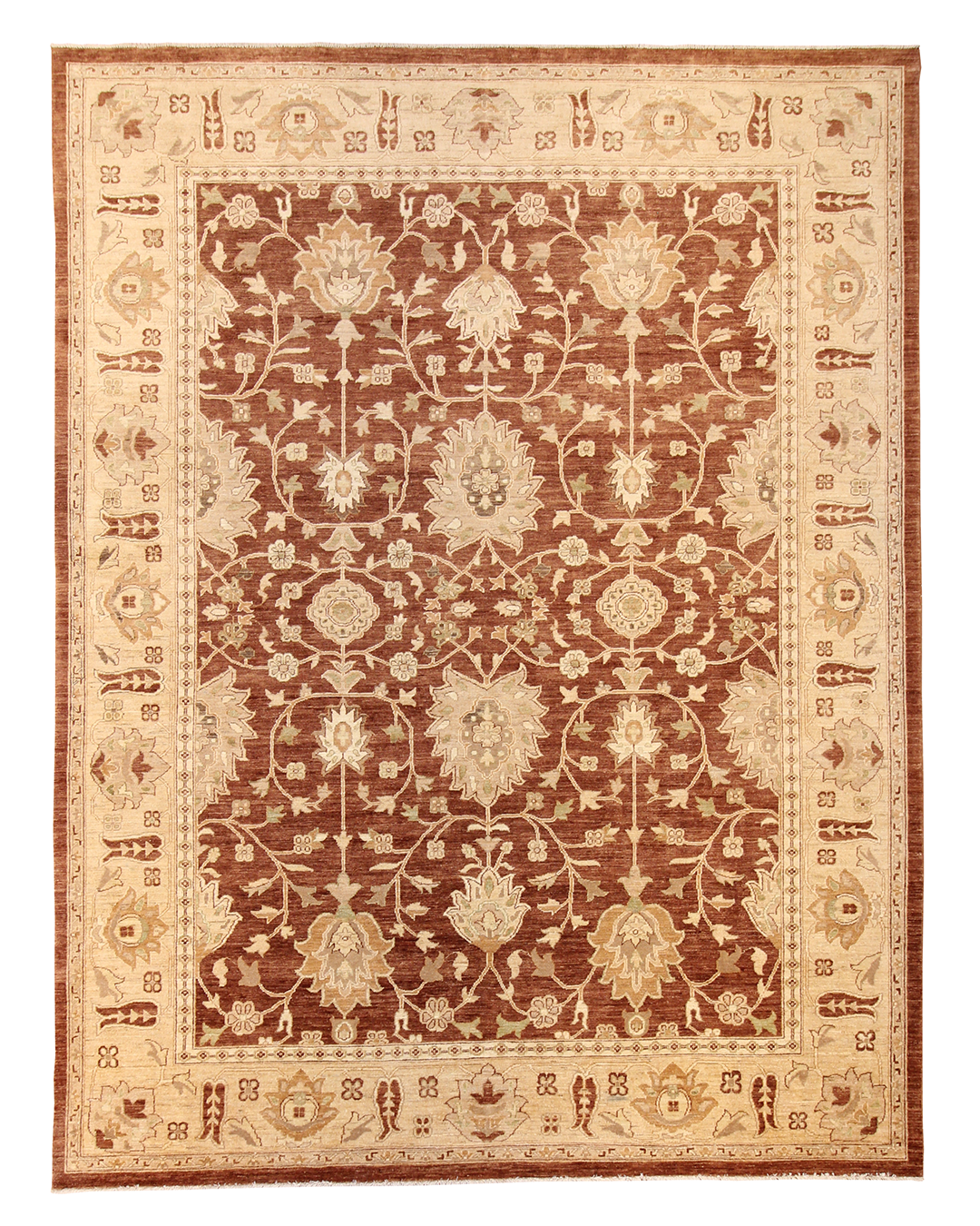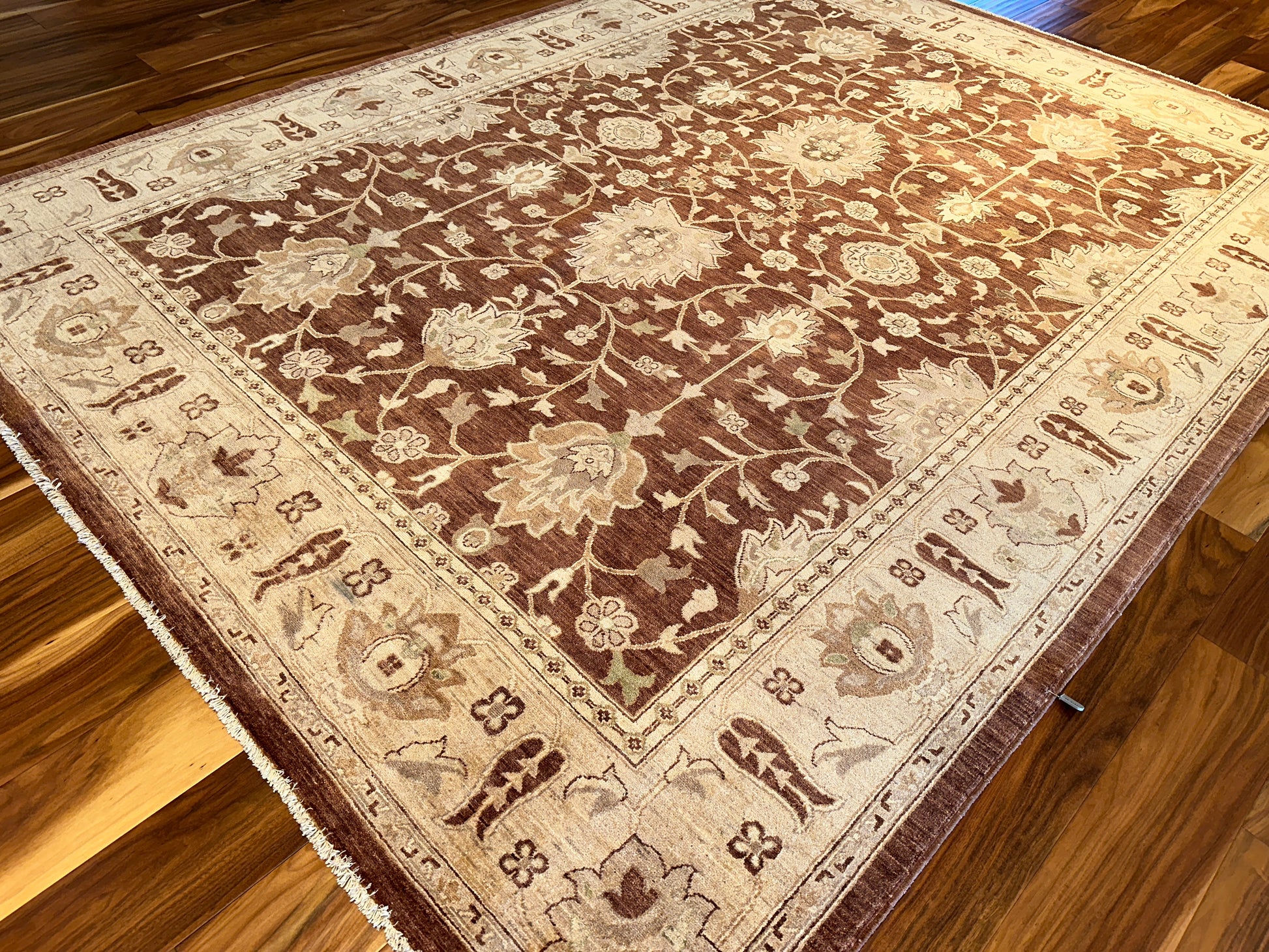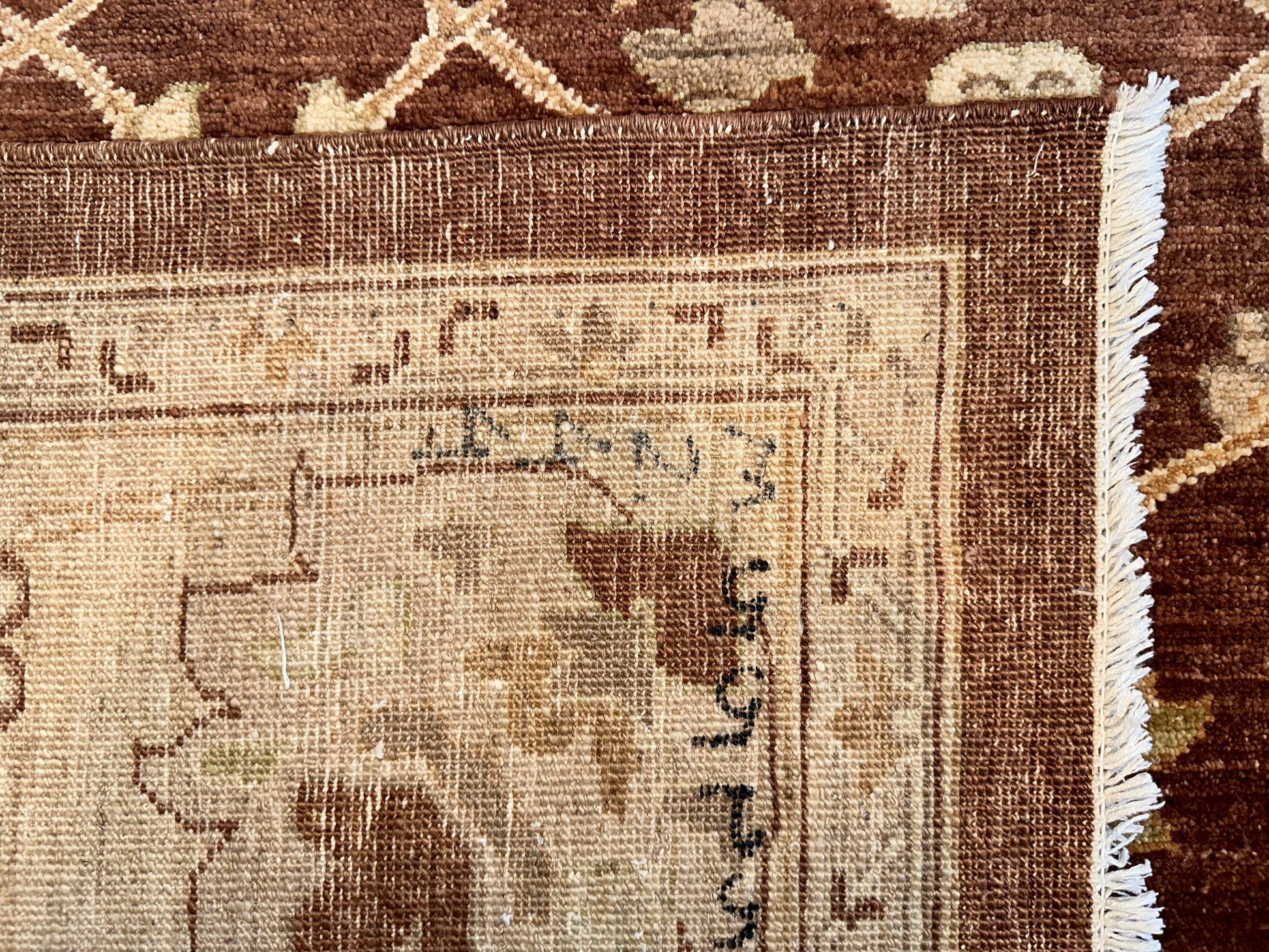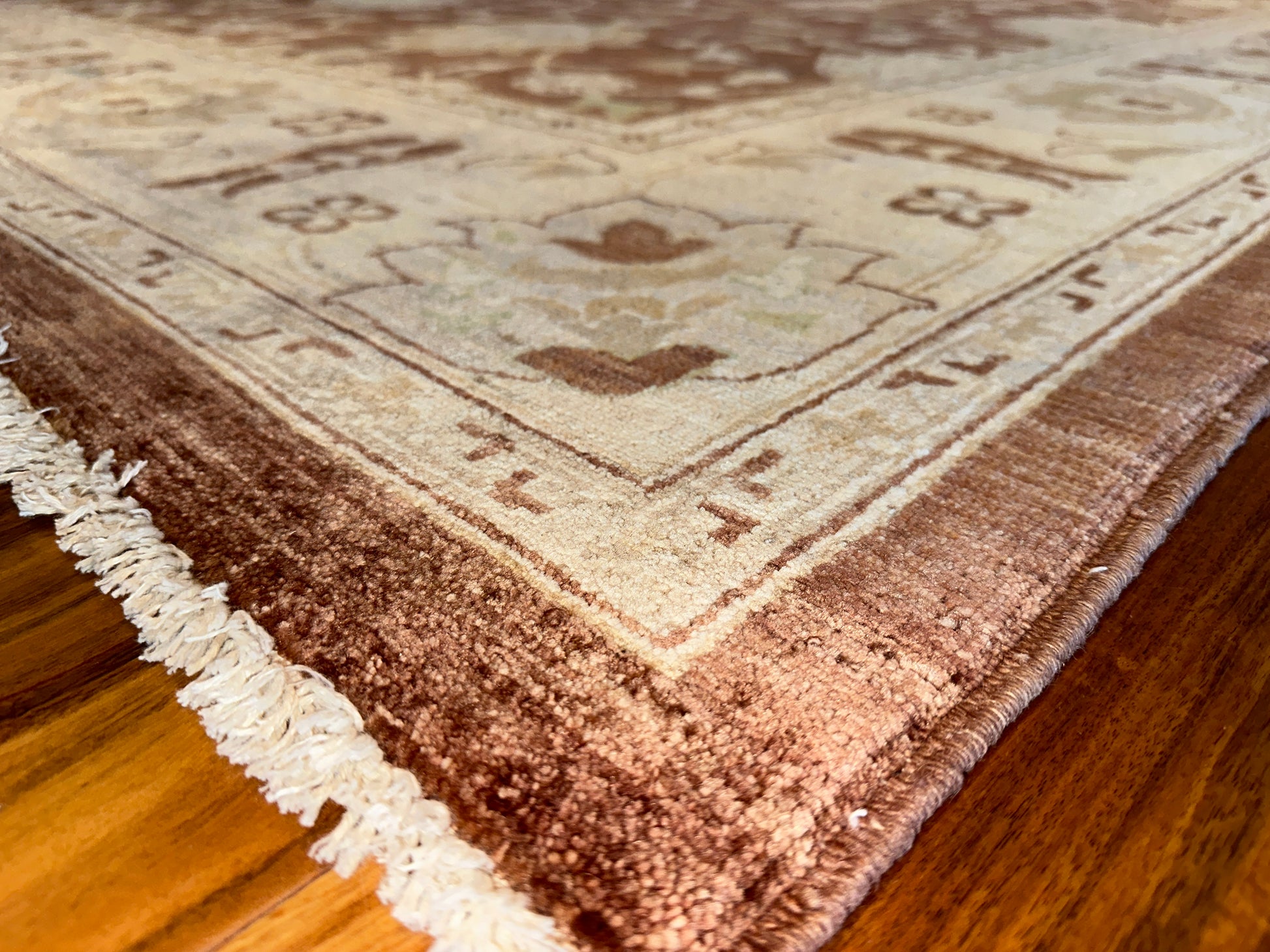 This handwoven rug displays a balanced and structured allover design, where large-scale palmettes and delicate vinery unfold across a warm terracotta-brown field. The soft beige border lightens the composition, framing the layout with botanical flourishes and fine, curving motifs. With its earthy palette and classic drawing, this piece creates a grounded, composed presence in any space.