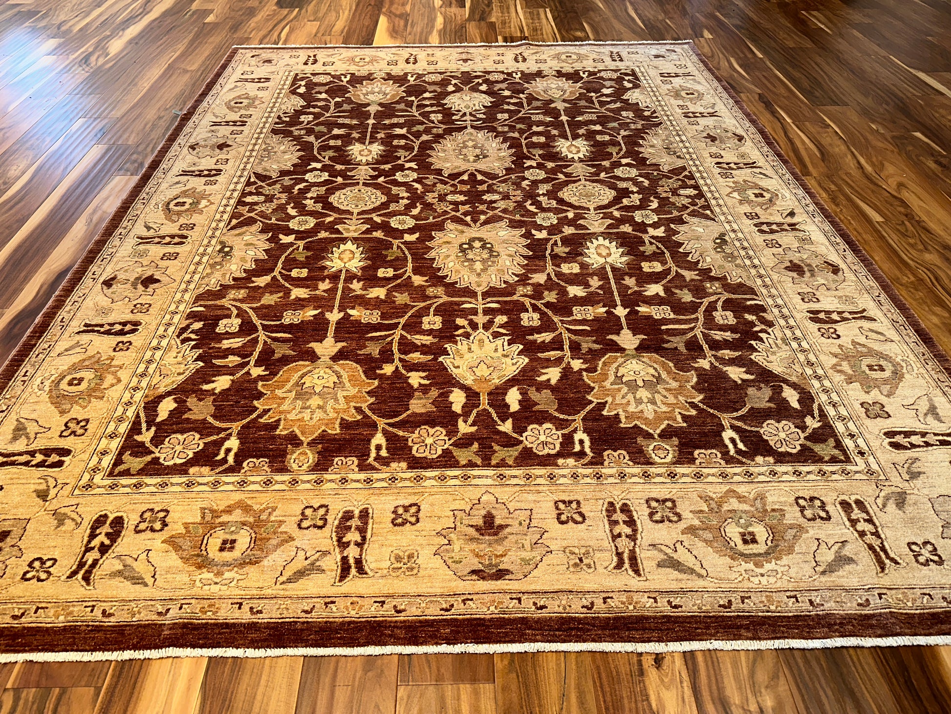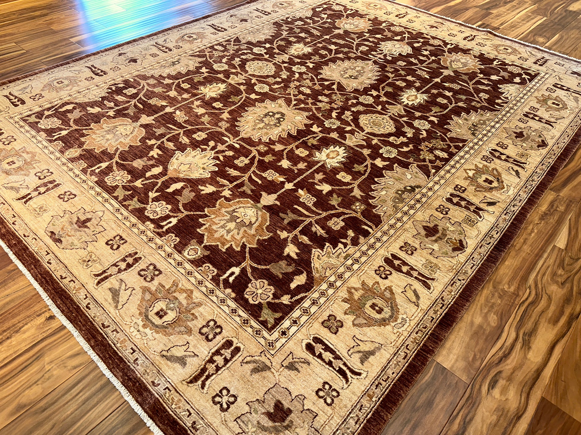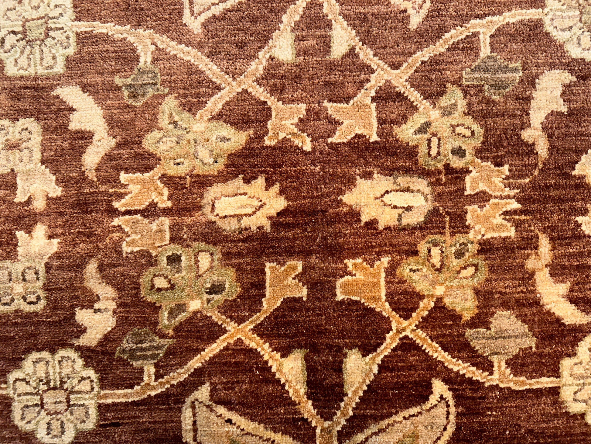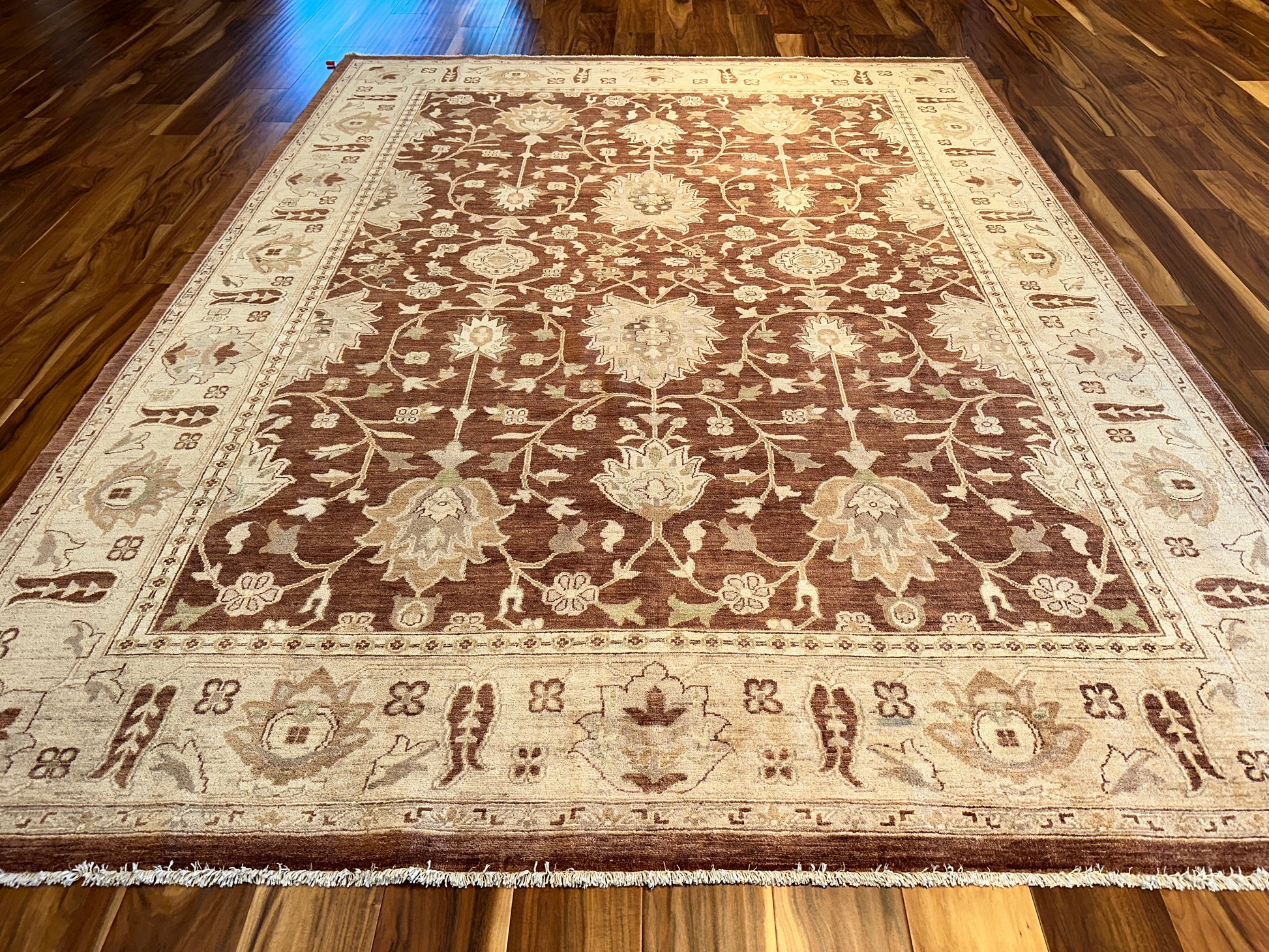This handwoven rug displays a balanced and structured allover design, where large-scale palmettes and delicate vinery unfold across a warm terracotta-brown field. The soft beige border lightens the composition, framing the layout with botanical flourishes and fine, curving motifs. With its earthy palette and classic drawing, this piece creates a grounded, composed presence in any space.