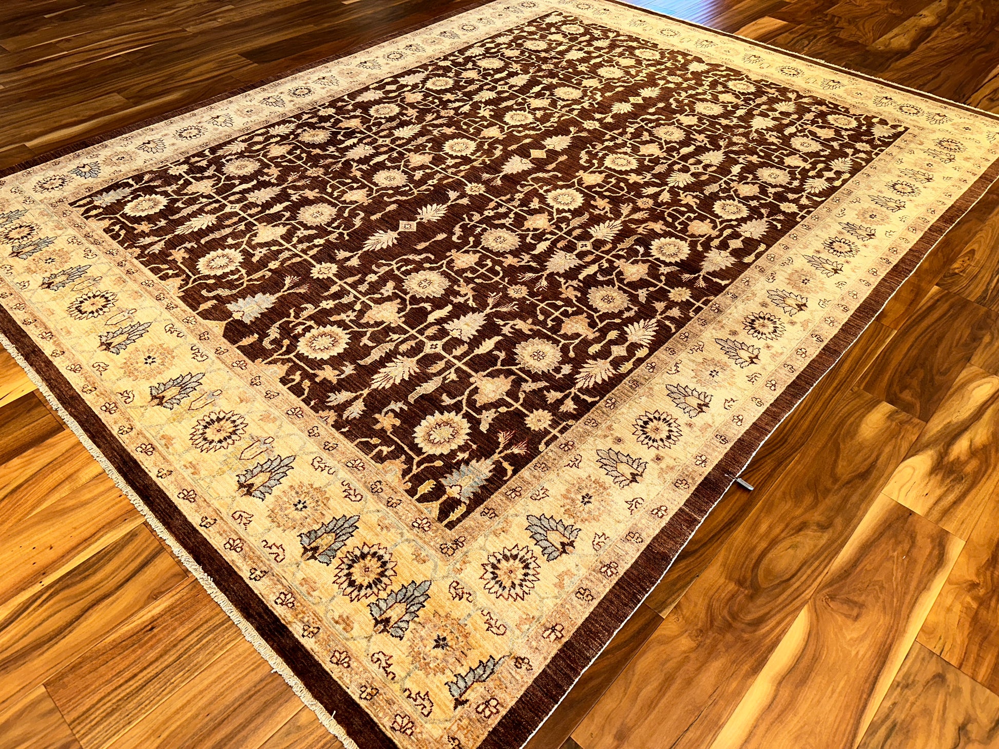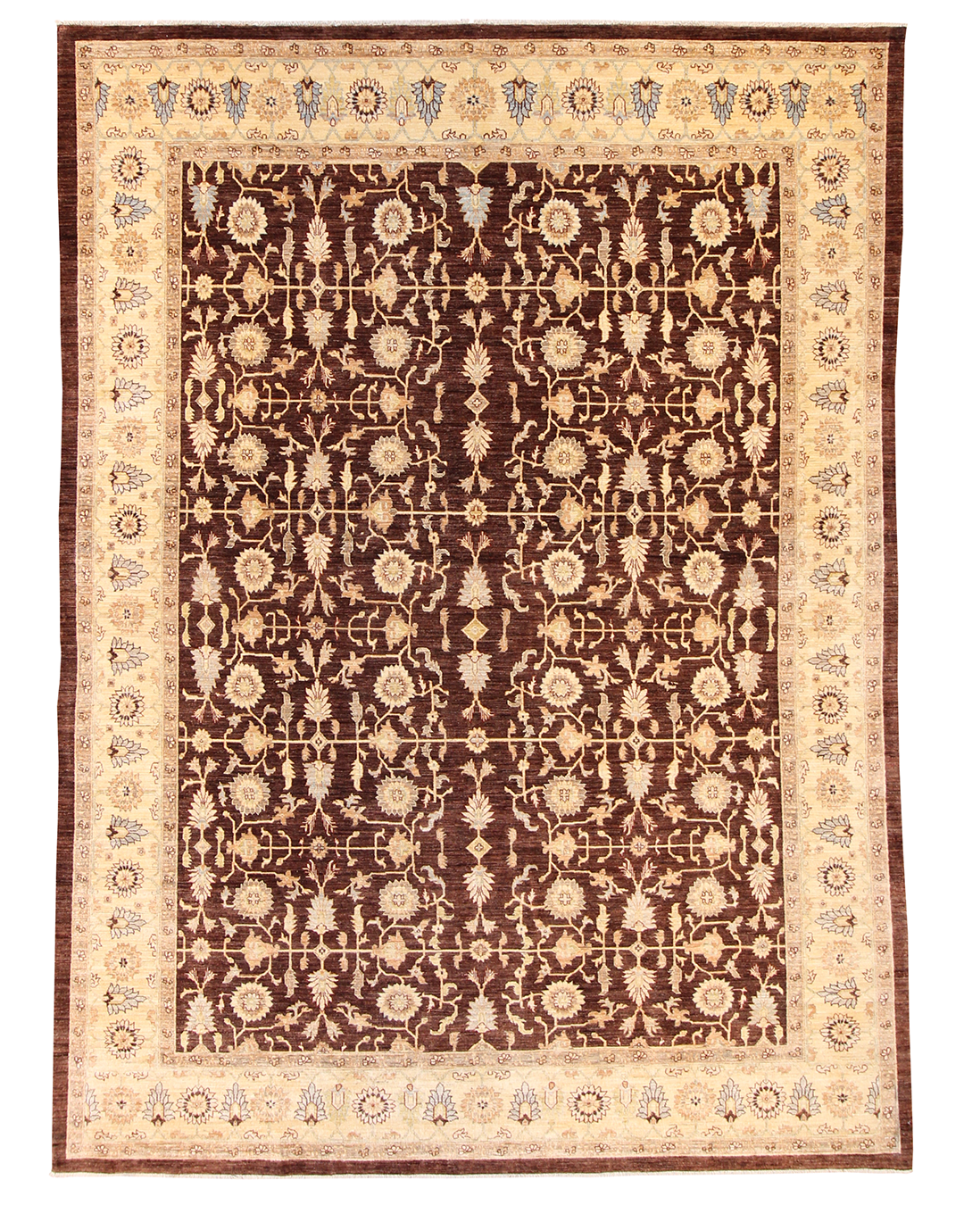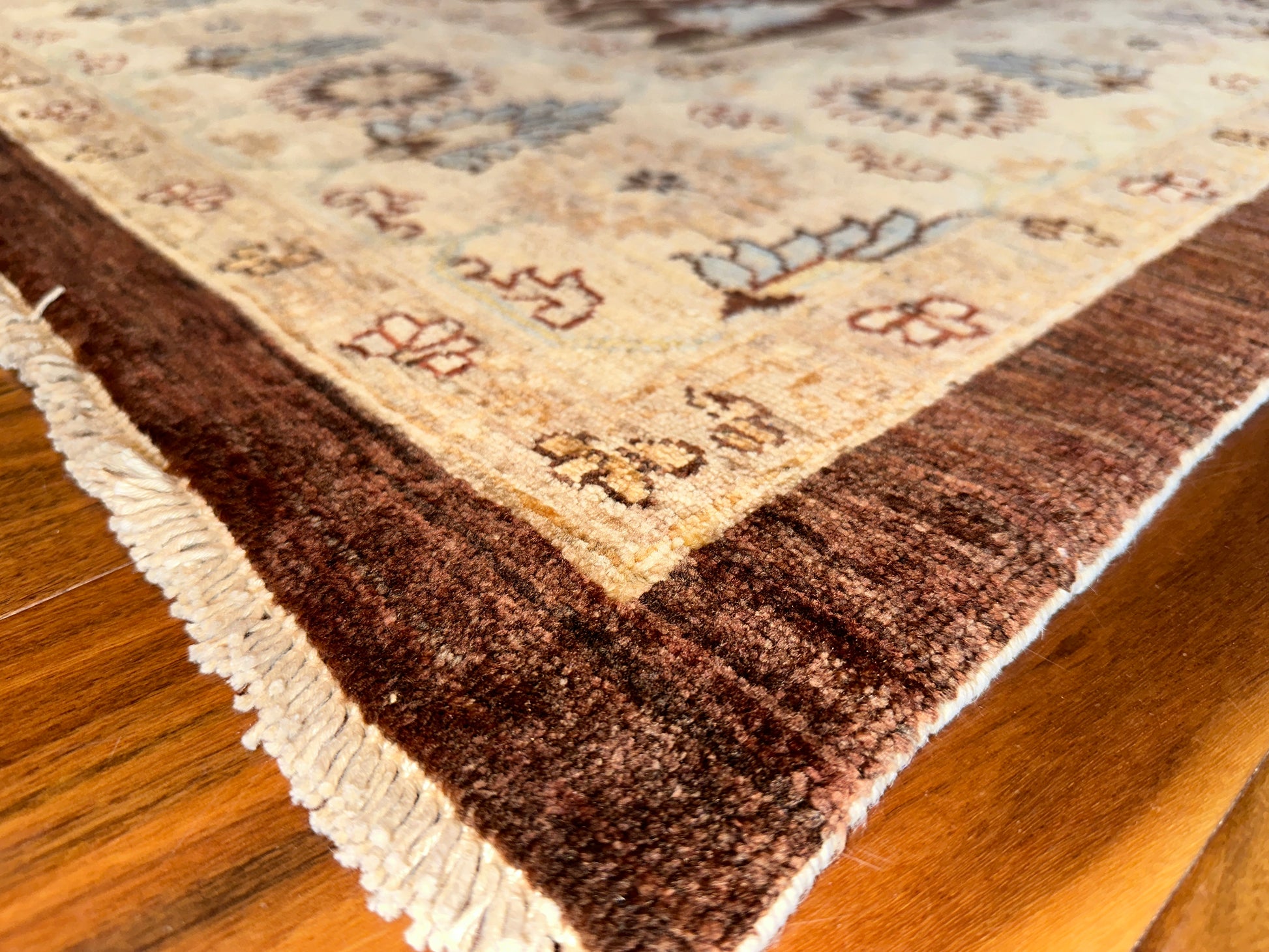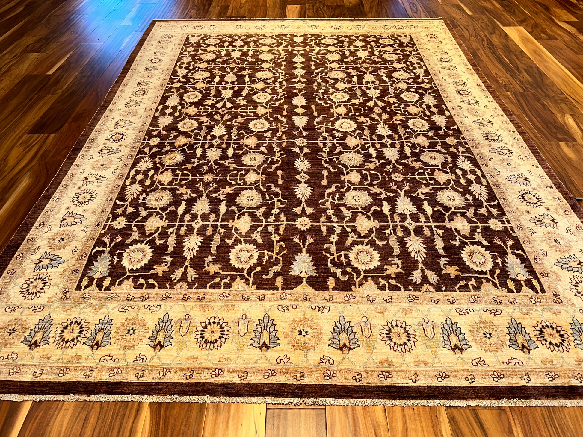 This striking handwoven rug features a bold interplay of deep chocolate brown and muted beige, arranged in a classically inspired allover floral lattice. The symmetry of the botanical motifs lends a formal rhythm, while the warm contrast between field and border creates definition without harshness. Delicate sky blue accents add a cool, balanced lift to the otherwise rich, earthy palette.