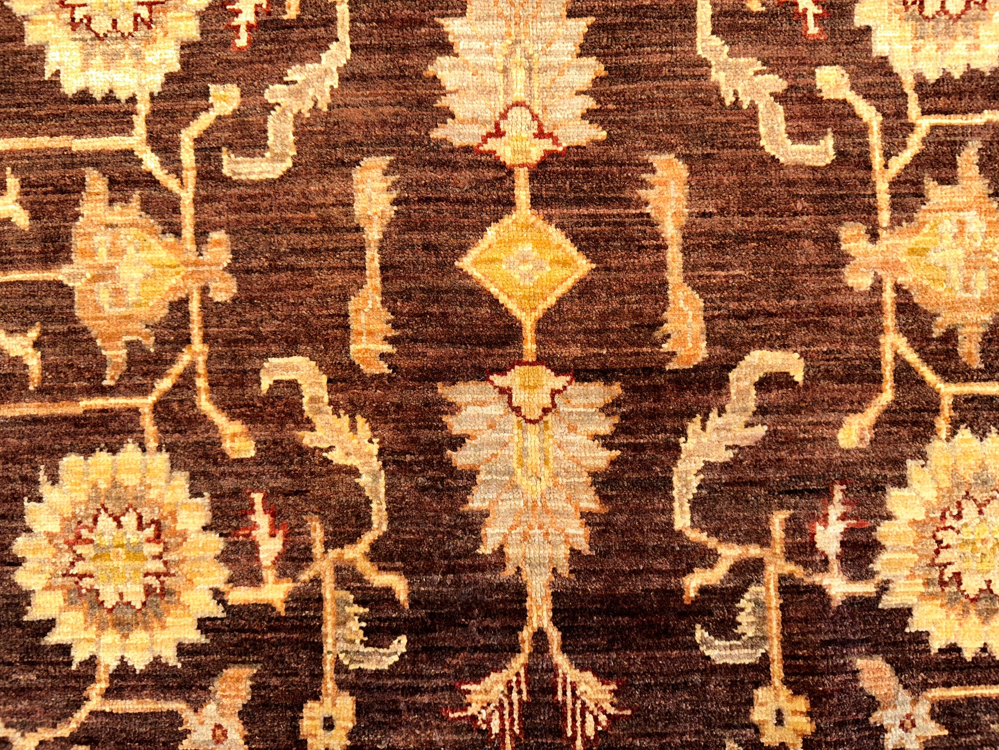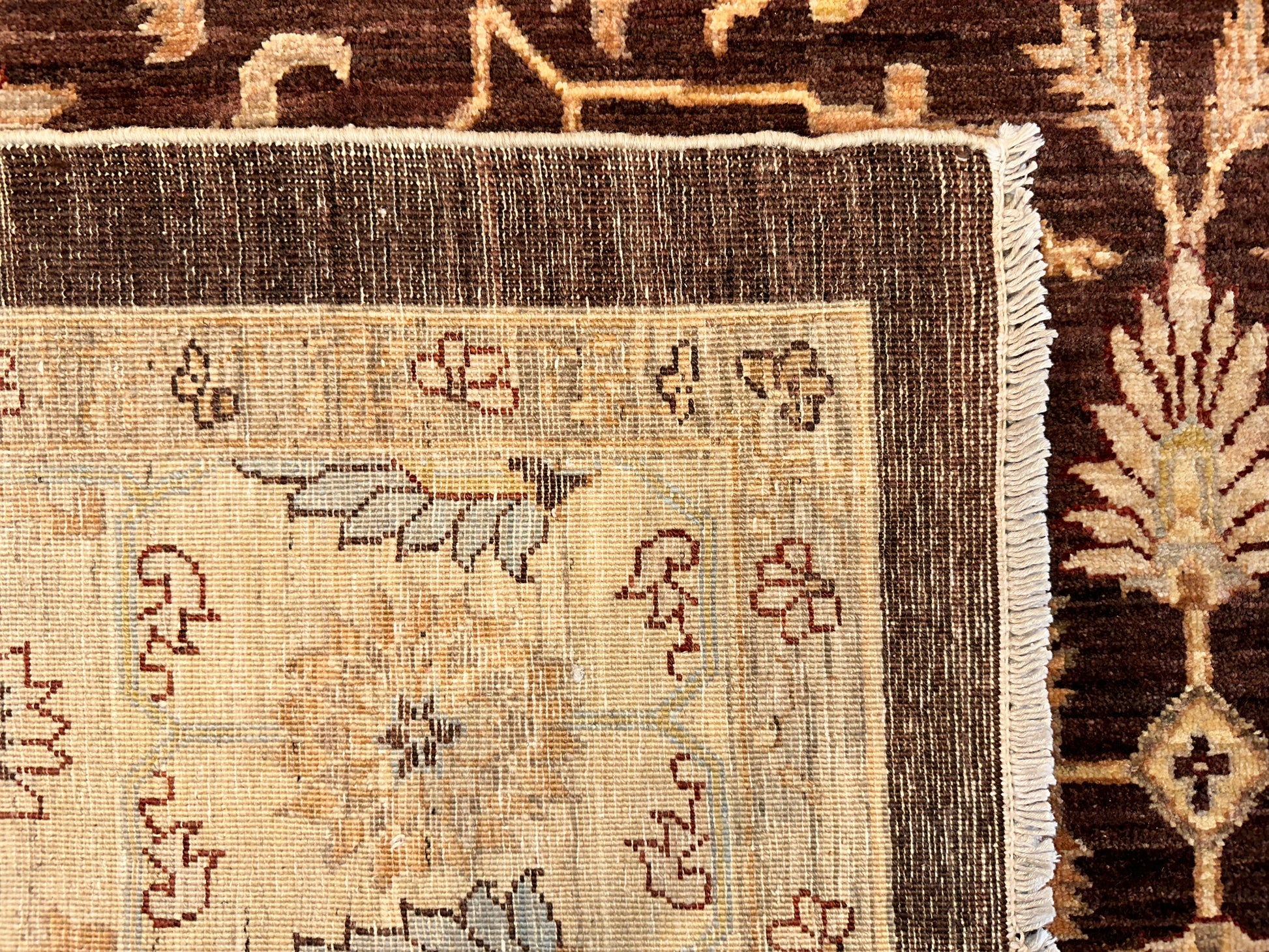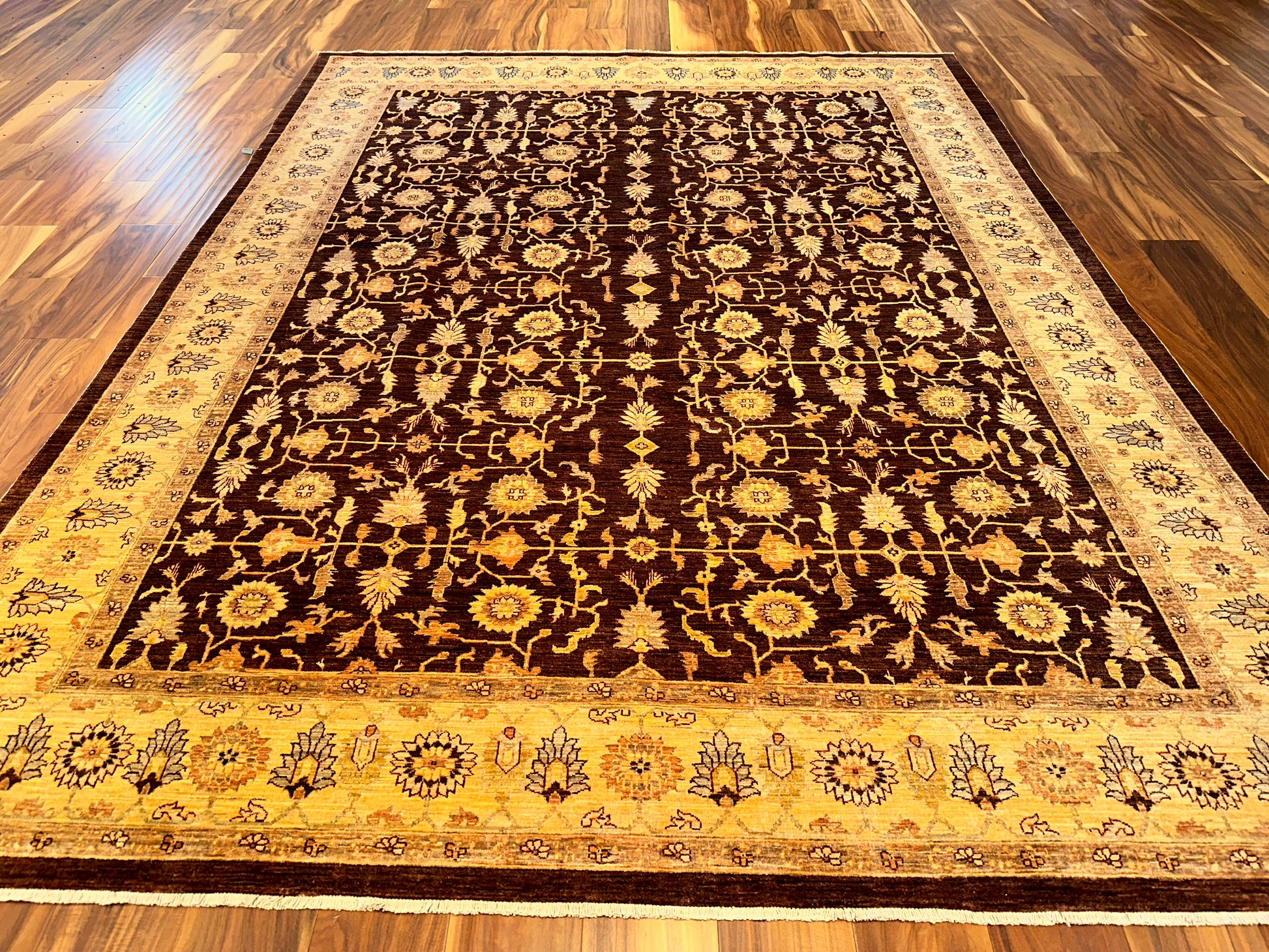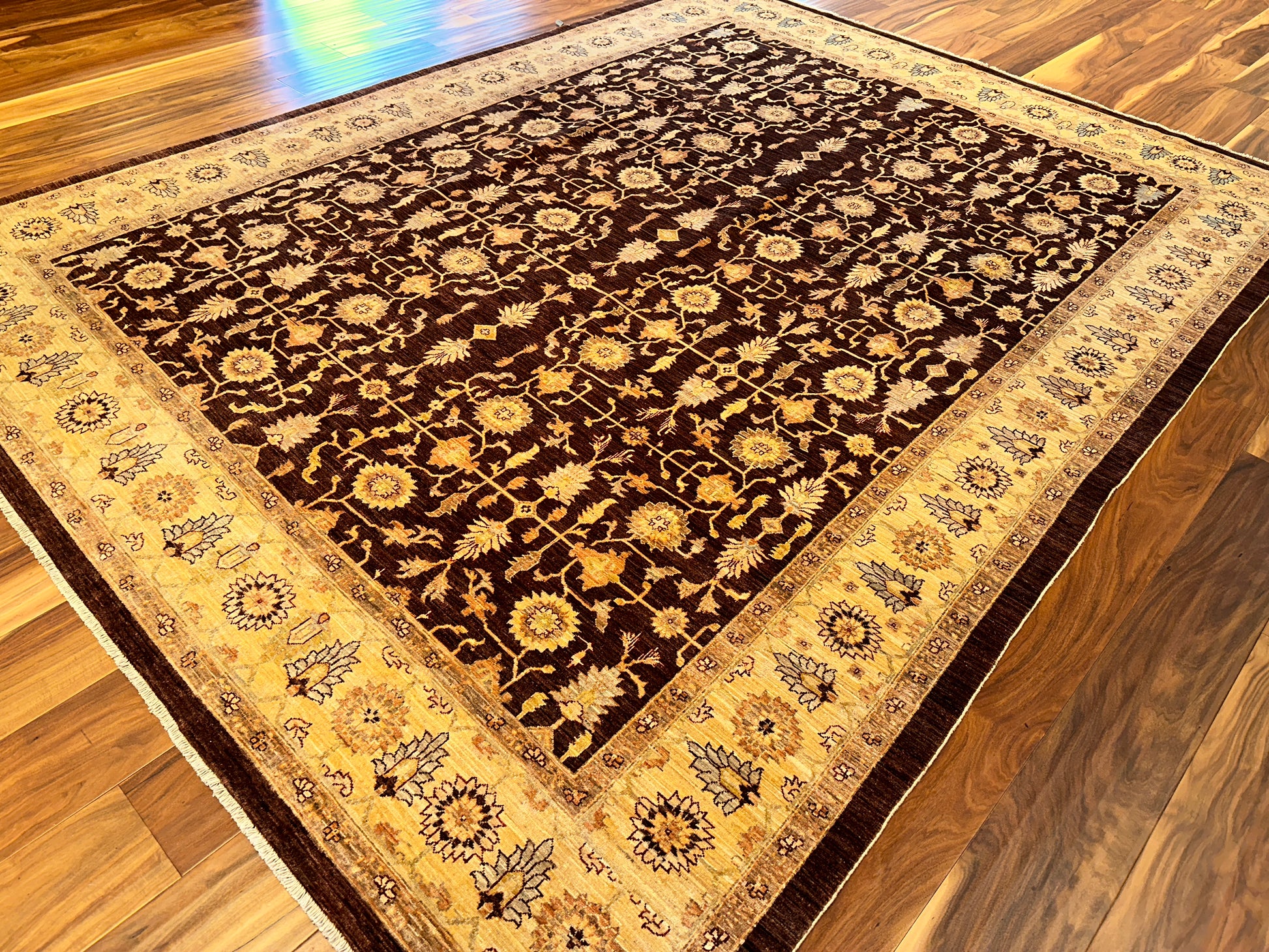 This striking handwoven rug features a bold interplay of deep chocolate brown and muted beige, arranged in a classically inspired allover floral lattice. The symmetry of the botanical motifs lends a formal rhythm, while the warm contrast between field and border creates definition without harshness. Delicate sky blue accents add a cool, balanced lift to the otherwise rich, earthy palette.