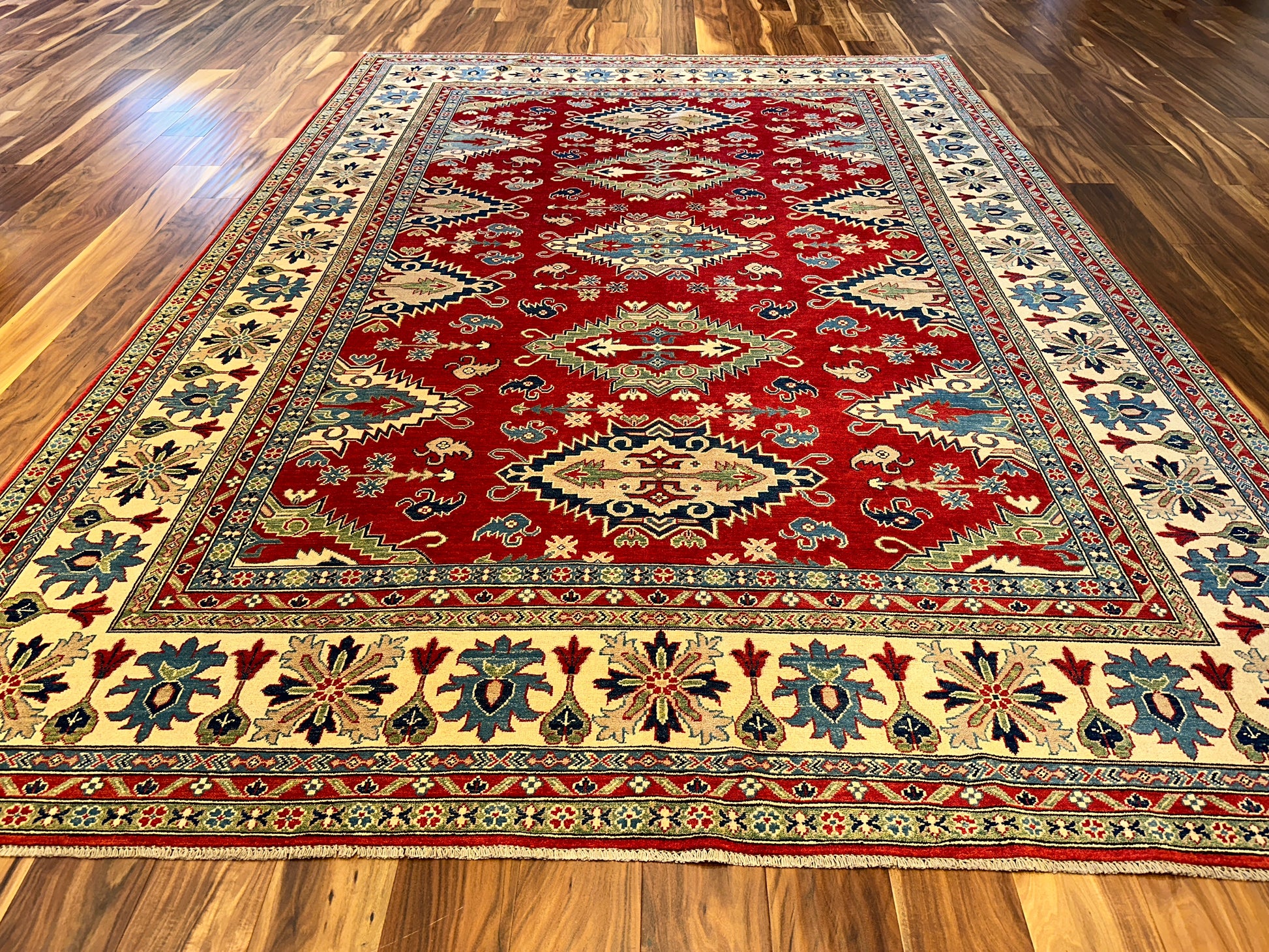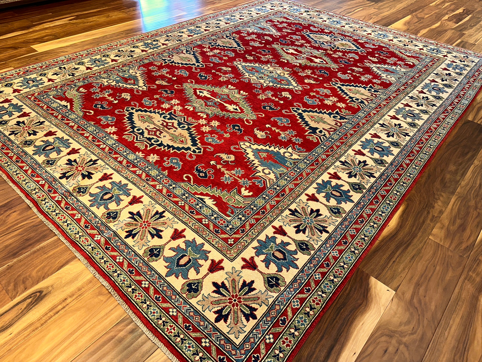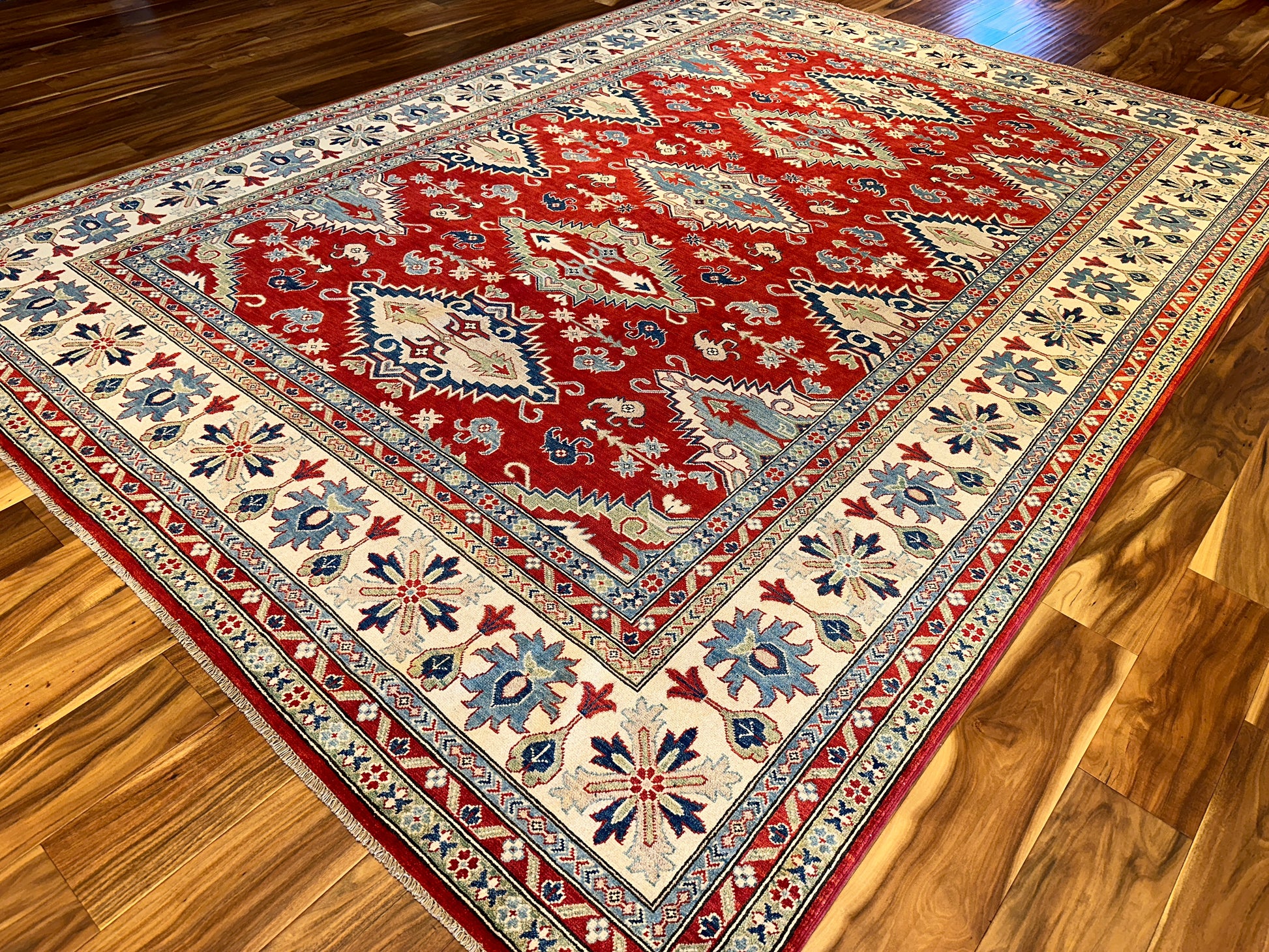 This vibrant hand-knotted rug boasts a striking red field enriched with a bold series of medallions and surrounded by an intricate ivory border of floral motifs. Its geometric design and rich, high-contrast palette of deep red, ivory, navy, and soft sky blue evoke a sense of heritage and liveliness, making it a standout centerpiece. Perfect for large rooms in need of both energy and tradition, it balances classic design with an uplifting spirit.