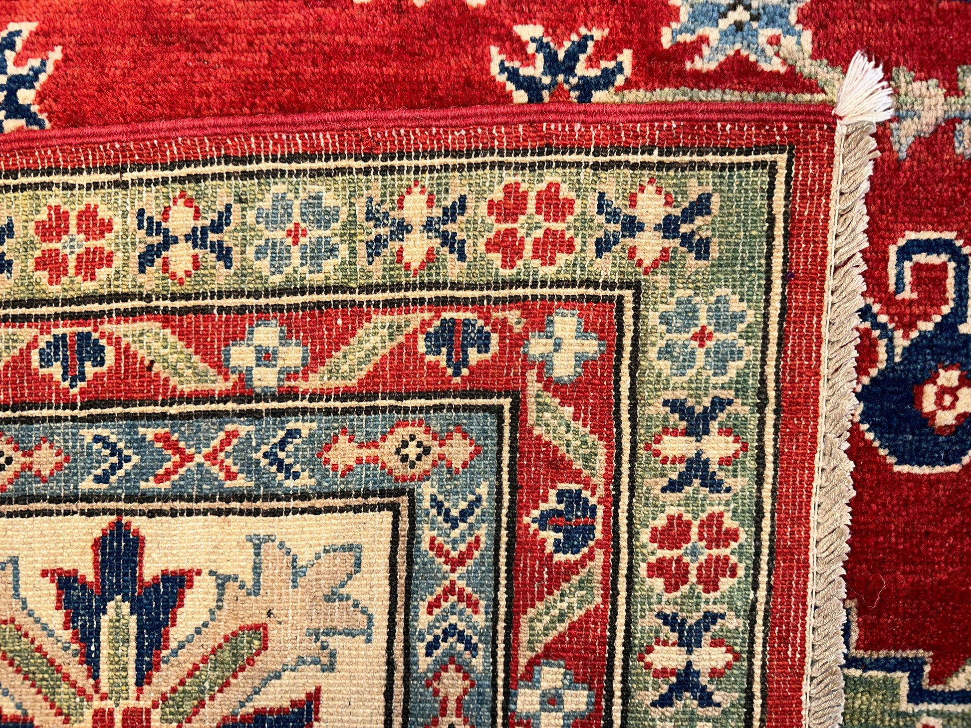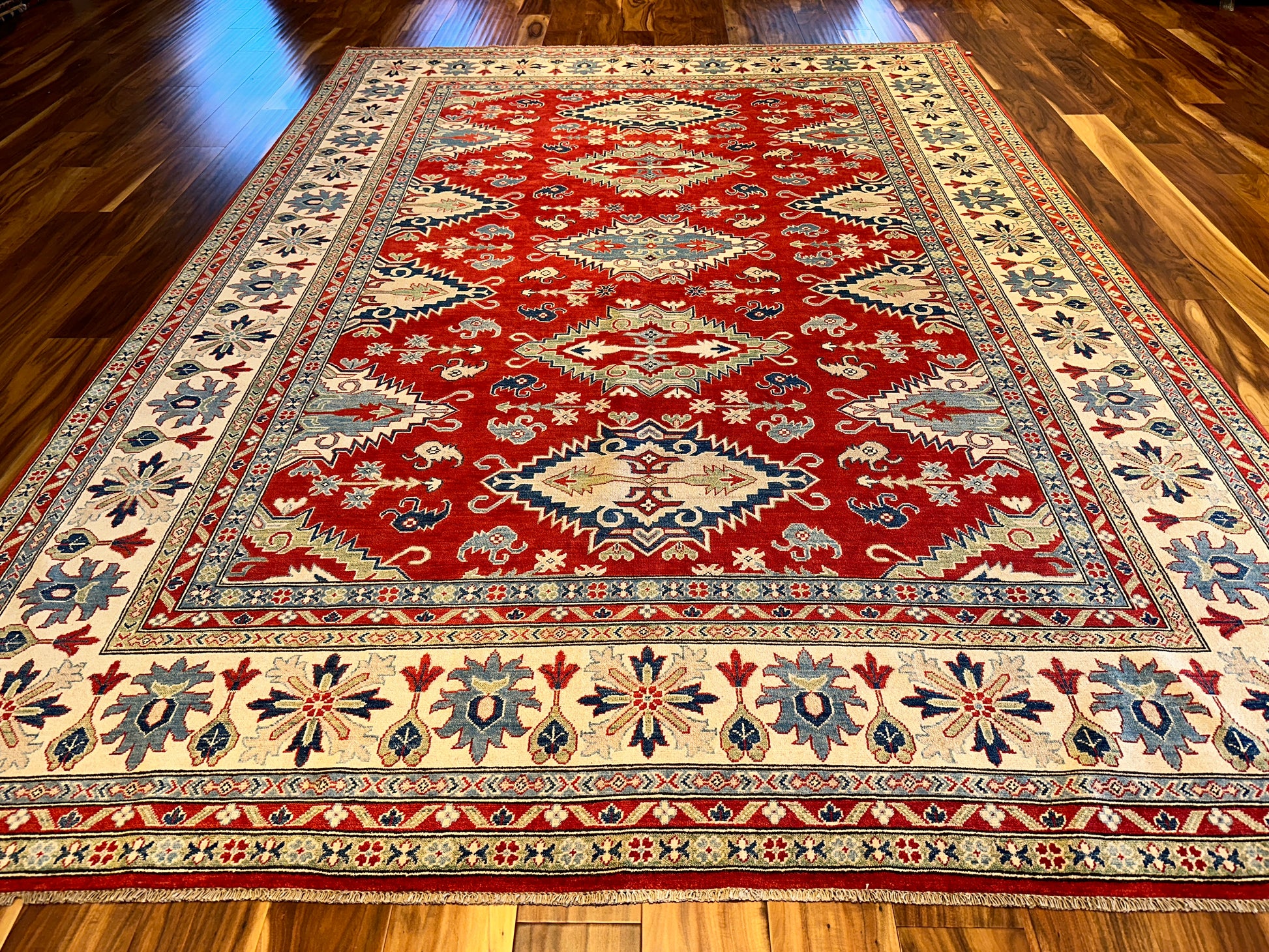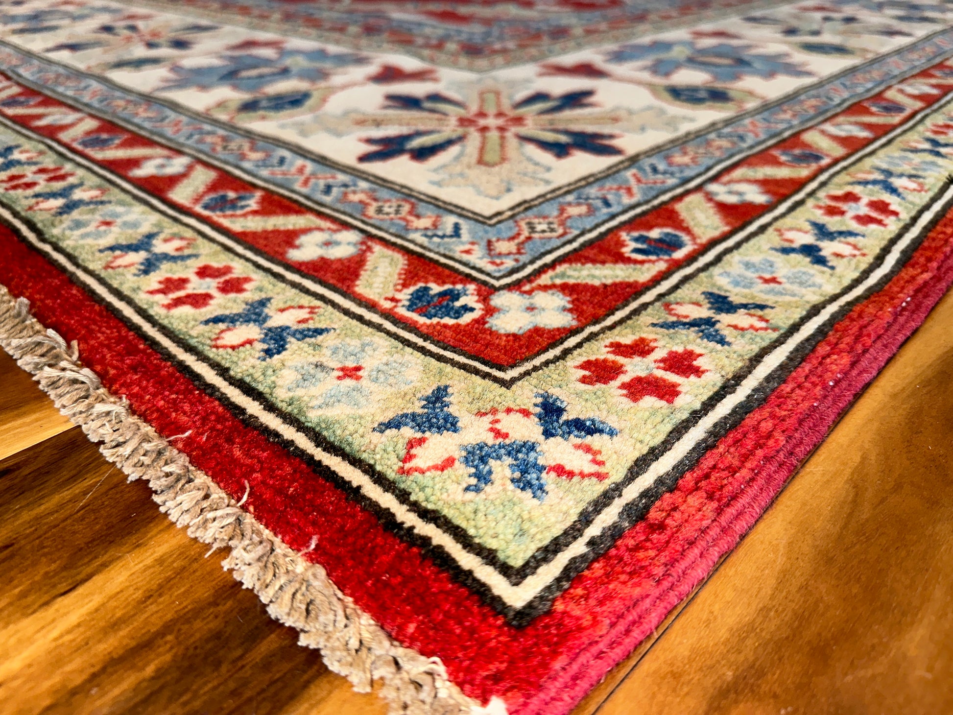 This vibrant hand-knotted rug boasts a striking red field enriched with a bold series of medallions and surrounded by an intricate ivory border of floral motifs. Its geometric design and rich, high-contrast palette of deep red, ivory, navy, and soft sky blue evoke a sense of heritage and liveliness, making it a standout centerpiece. Perfect for large rooms in need of both energy and tradition, it balances classic design with an uplifting spirit.