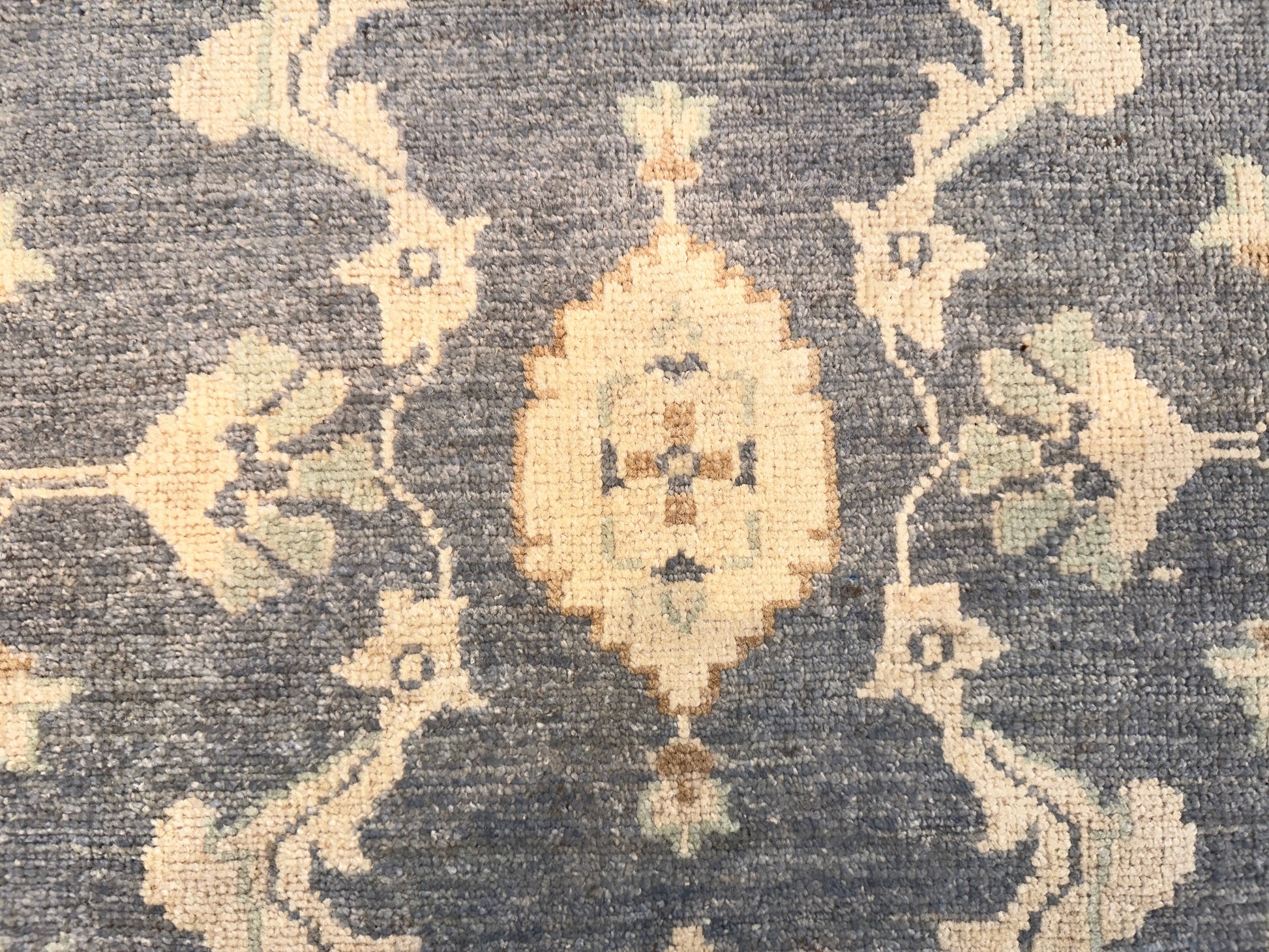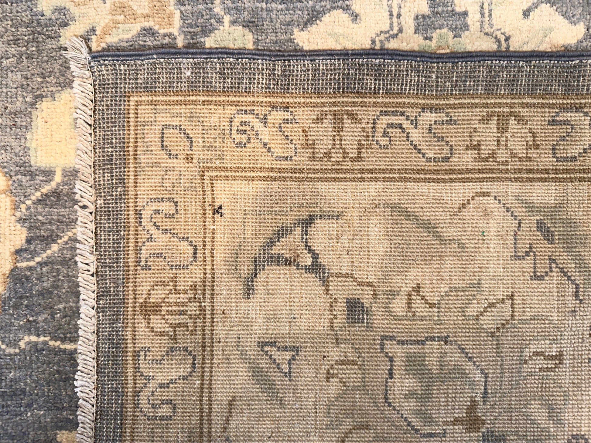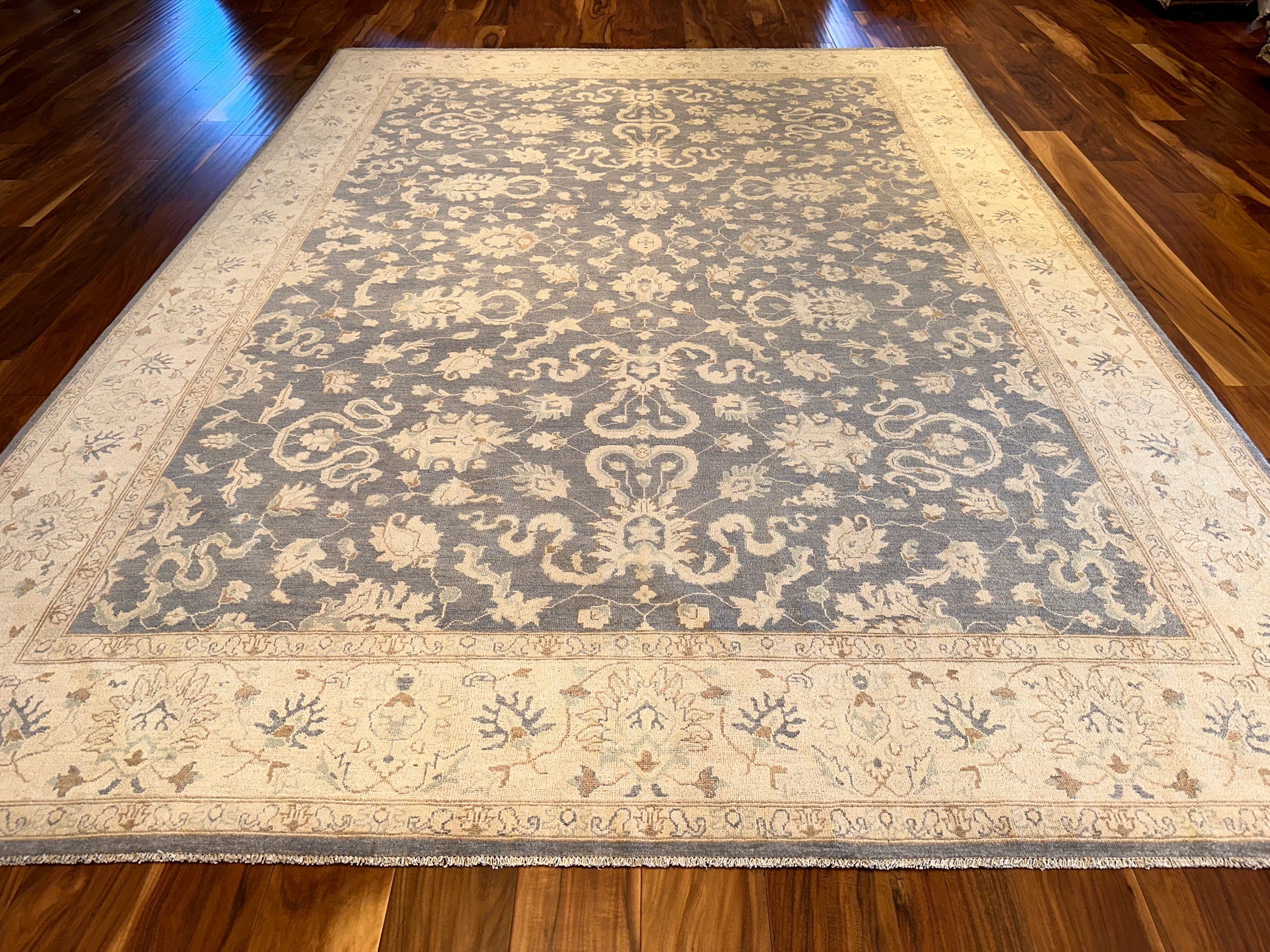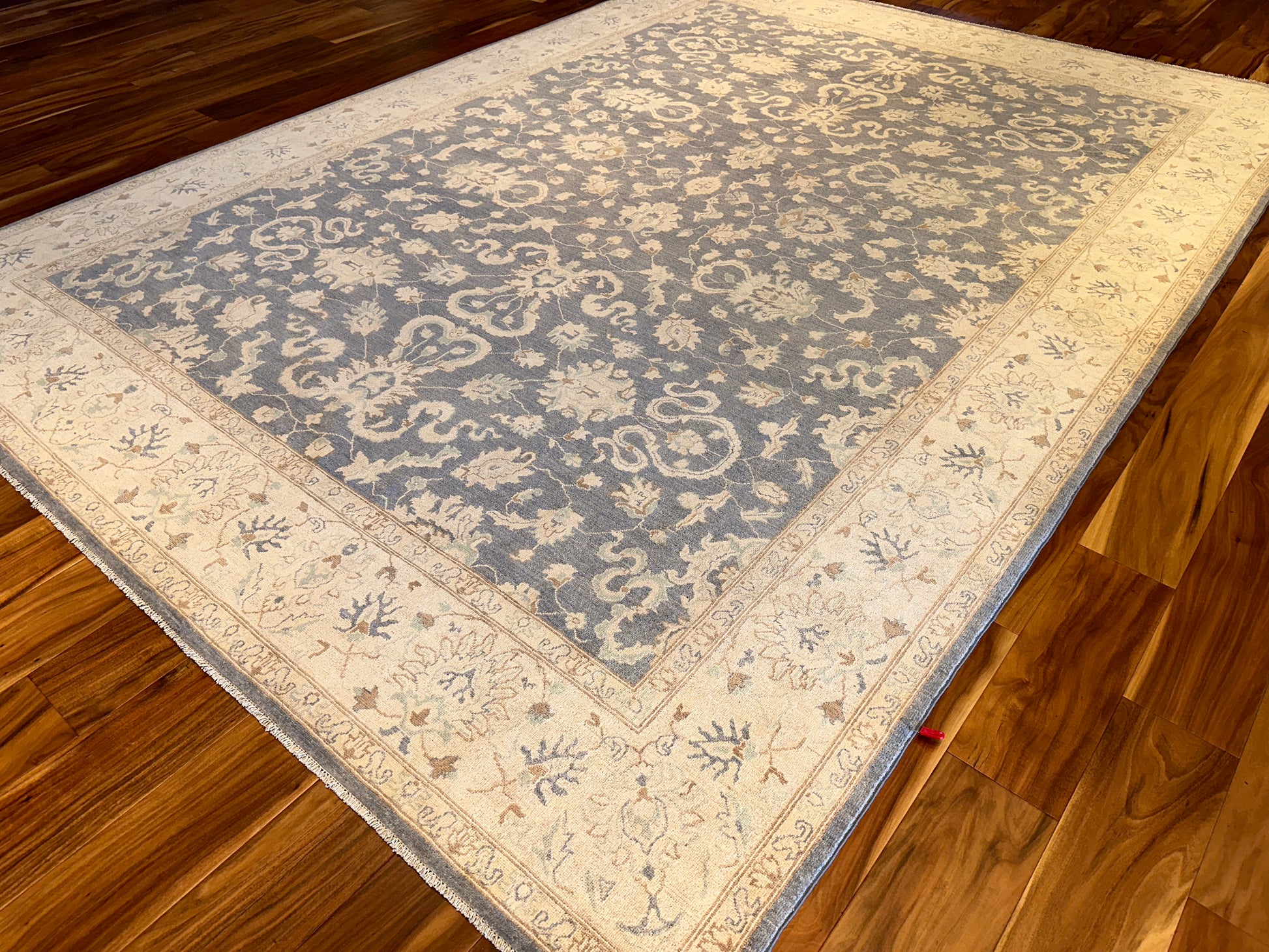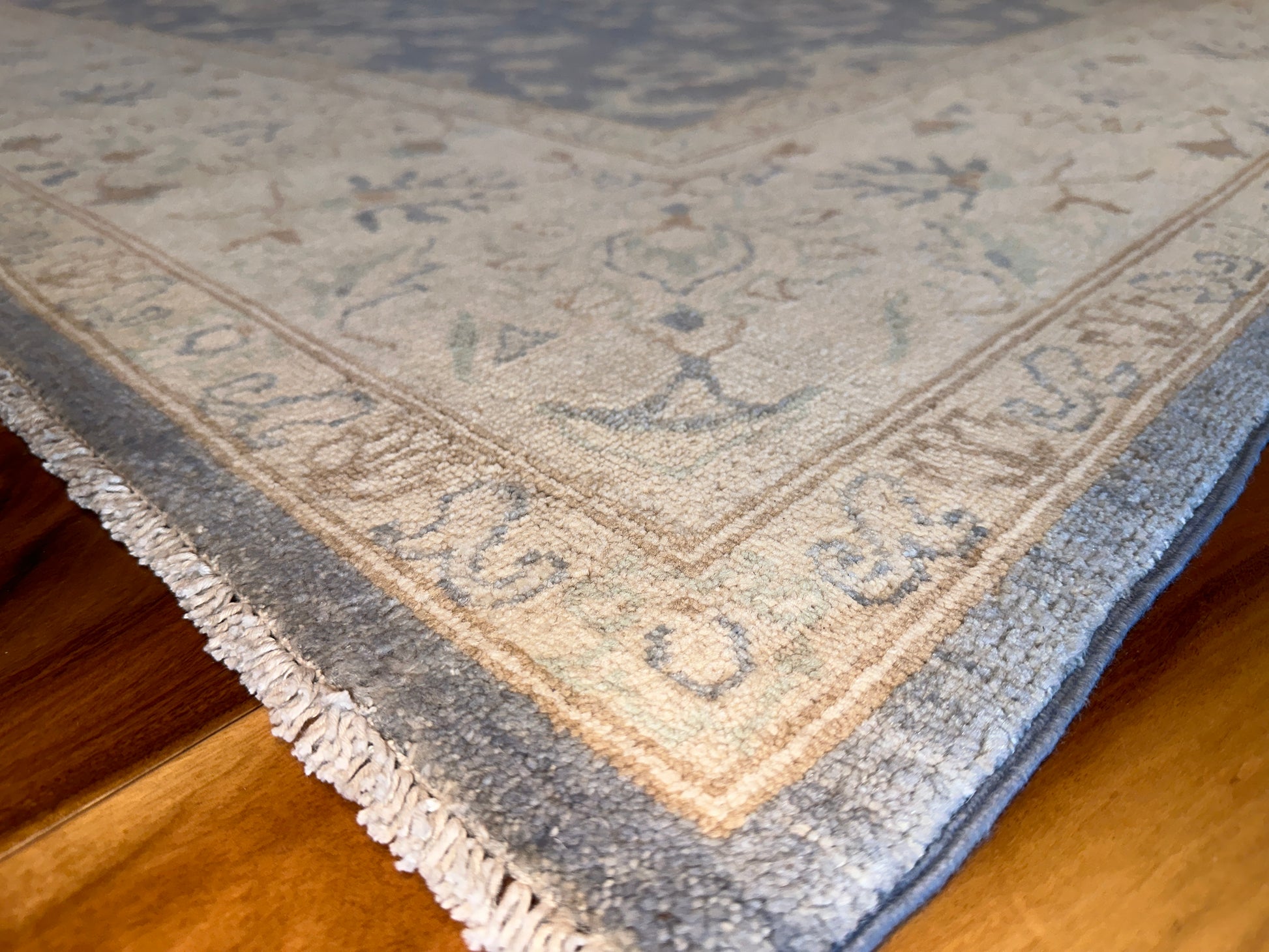 Elegant and quietly regal, this handwoven rug presents a classic botanical motif with curling vines and floral medallions blooming across a misty slate-blue field. The wide cream border adds warmth and balance, framing the composition in a soft glow. Its harmonious palette and graceful details bring timeless refinement to traditional or transitional interiors.