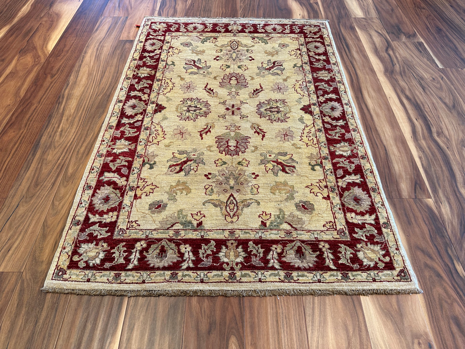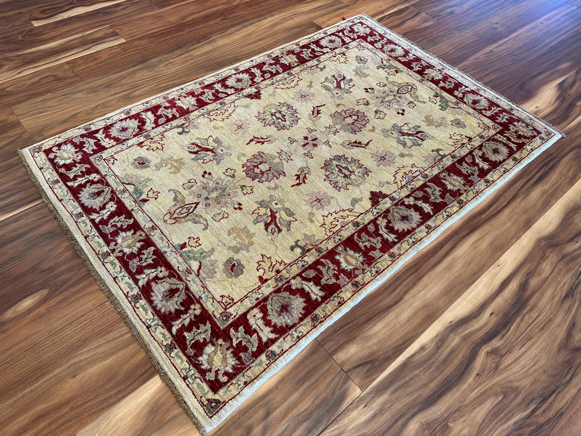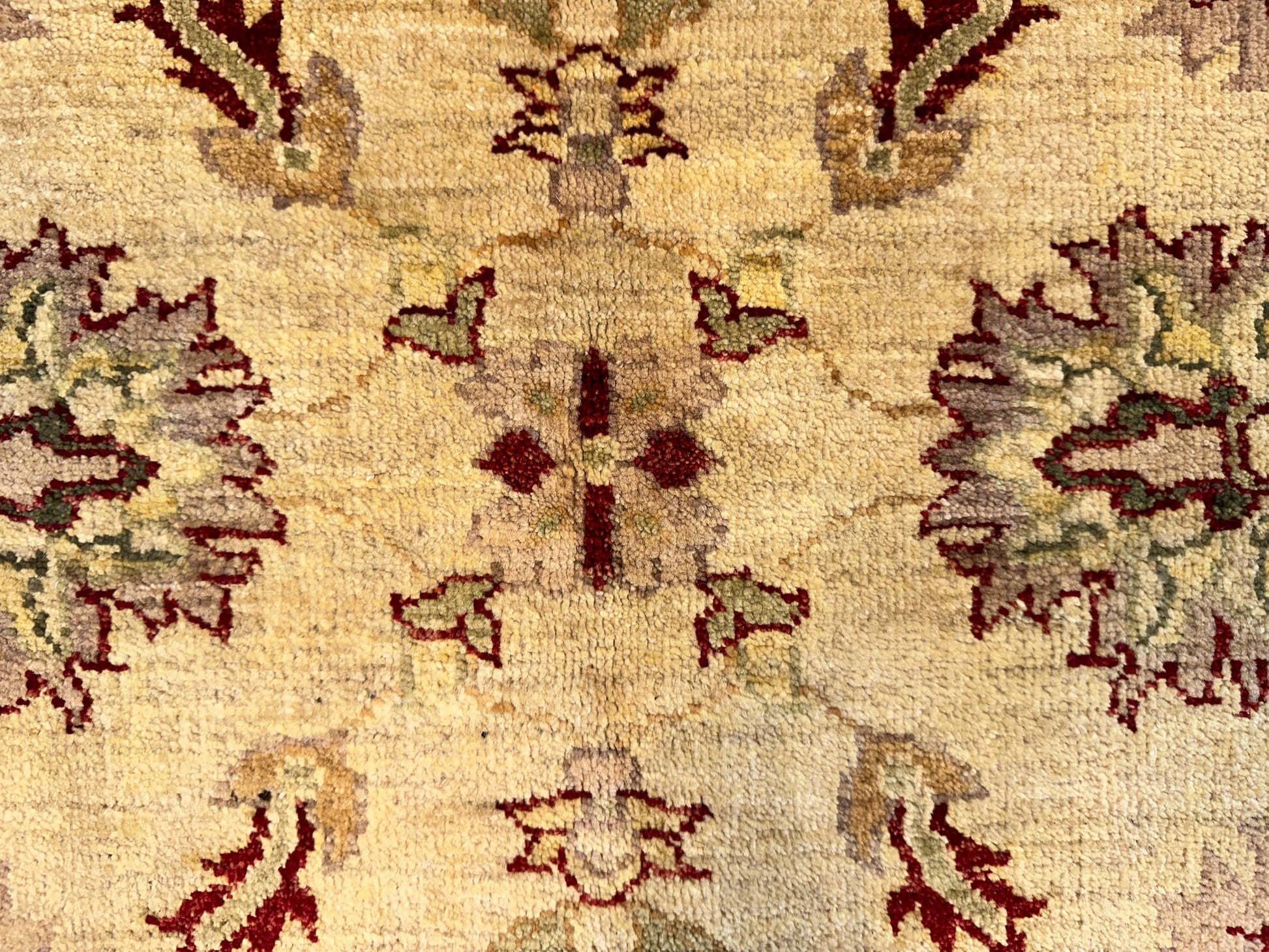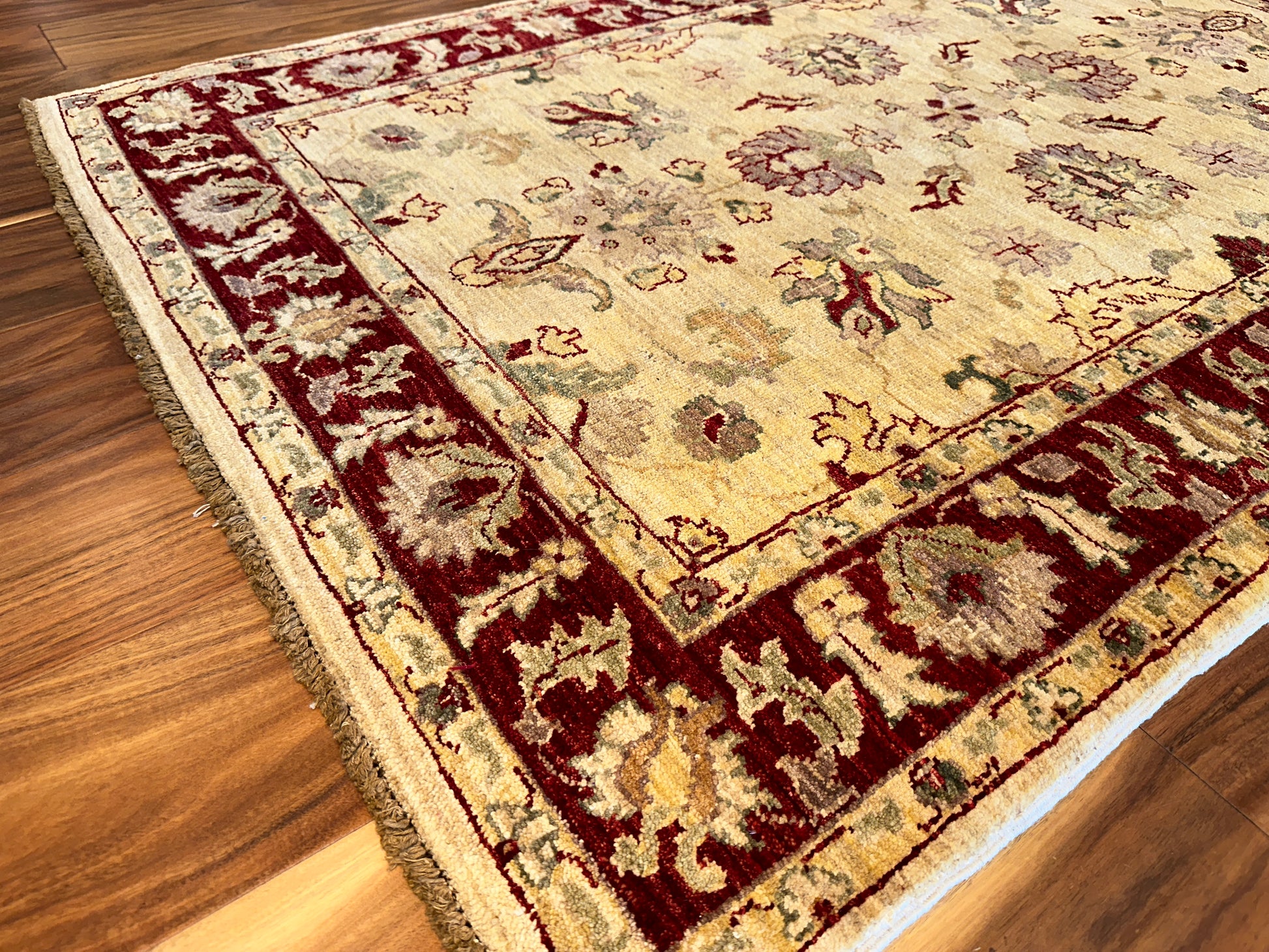 Richly detailed with timeless elegance, this rug features a classic allover floral pattern framed by a deep red border that enhances its regal appeal. The soft beige background provides warmth and balance, while accents of sage, gold, and rose add depth and refinement. Its traditional design lends a sense of history and harmony to any room it graces.