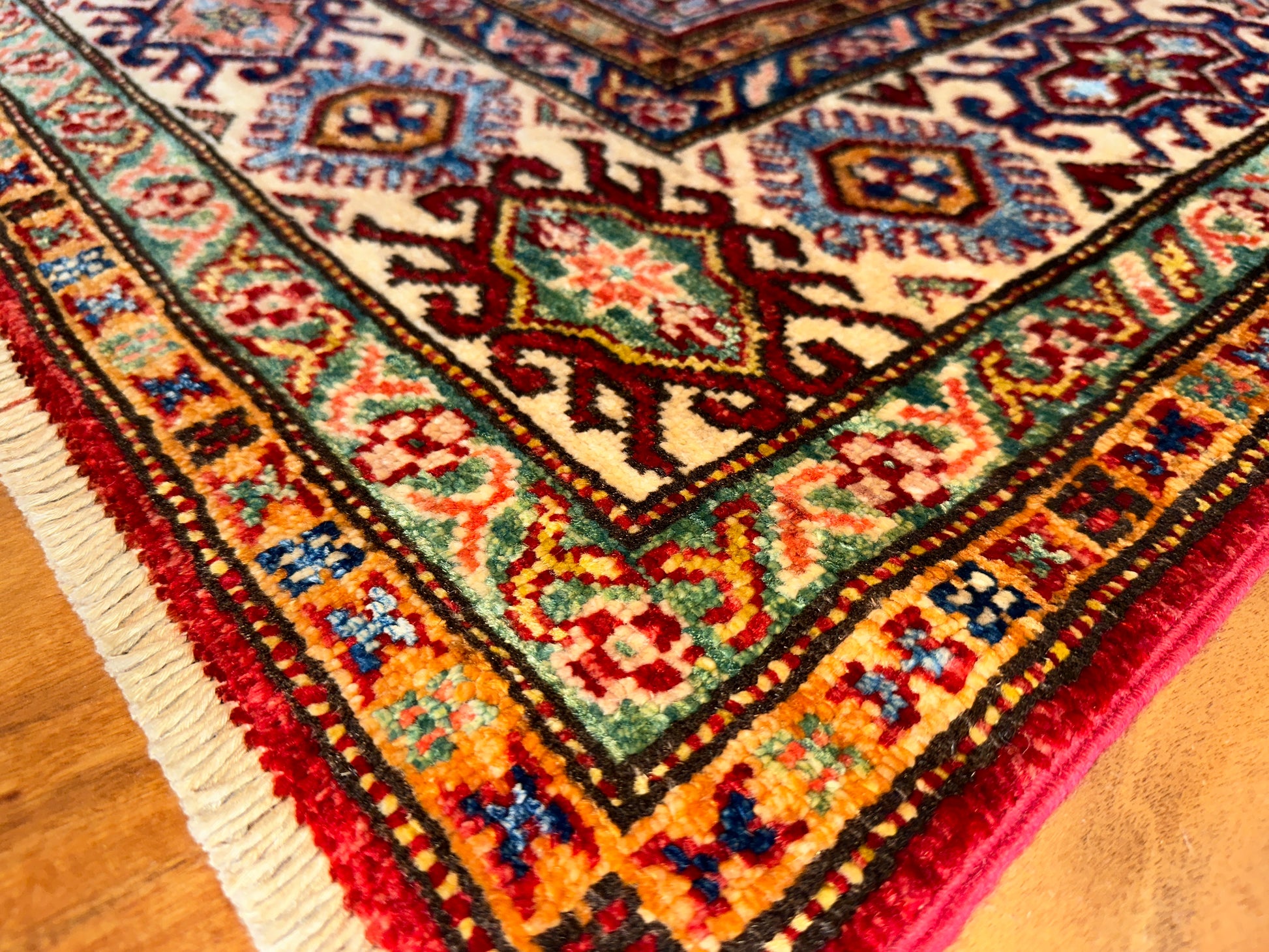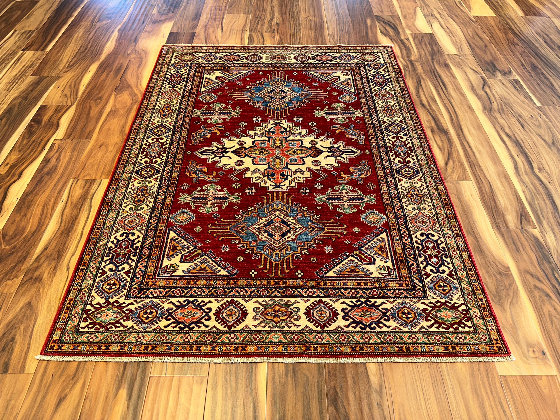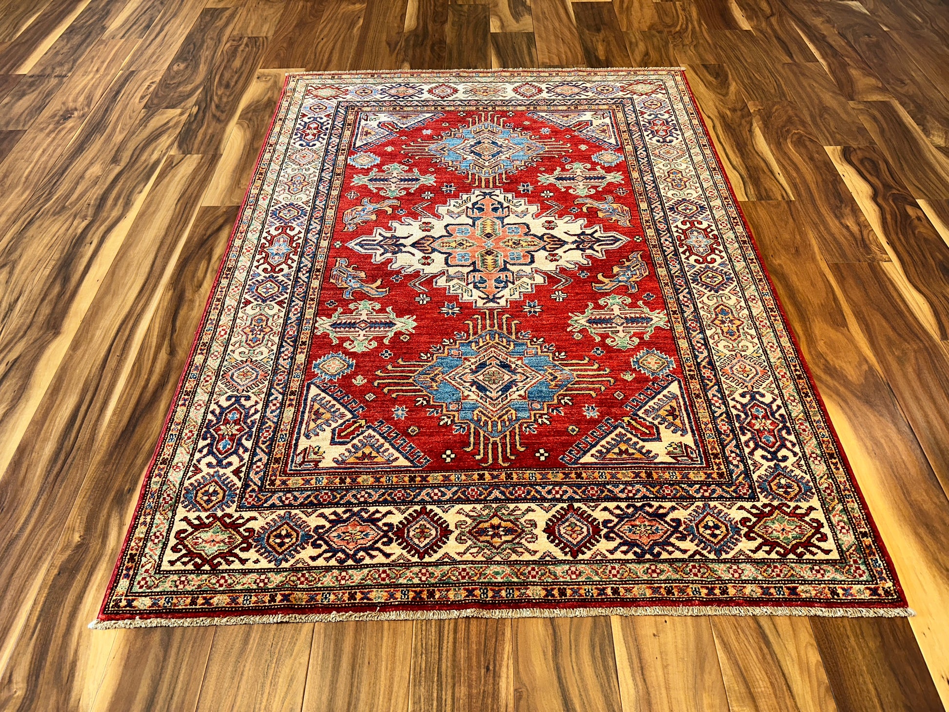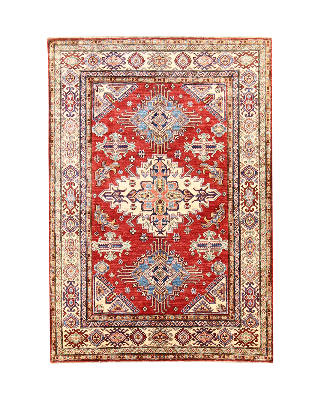 Bold and commanding, this handmade rug features a striking geometric medallion layout set against a vivid red field, accented with sky blue, cream, and deep navy tones. Rich in tribal motifs and angular forms, the layered borders add intricate framing that enhances its dynamic and traditional feel.