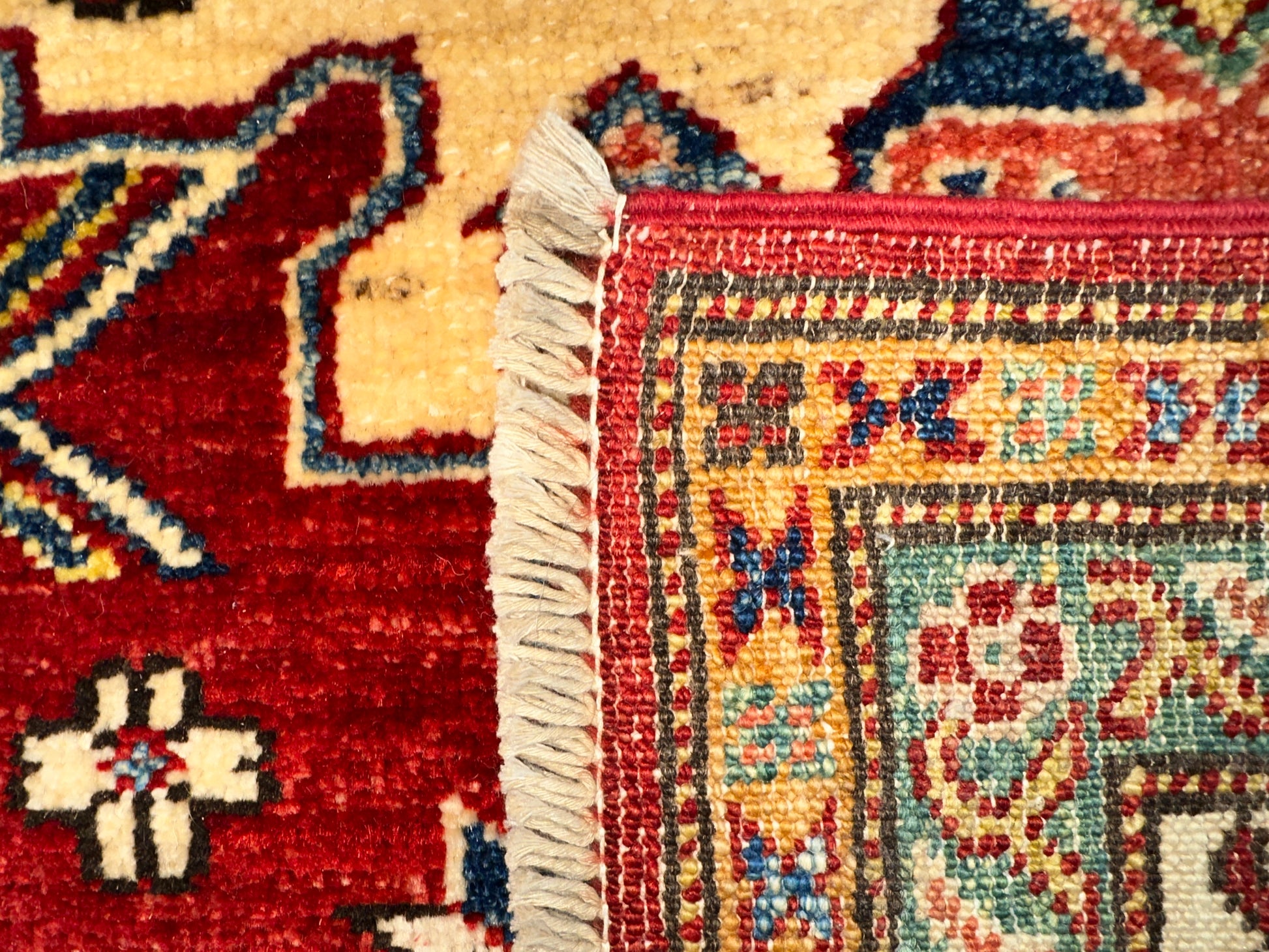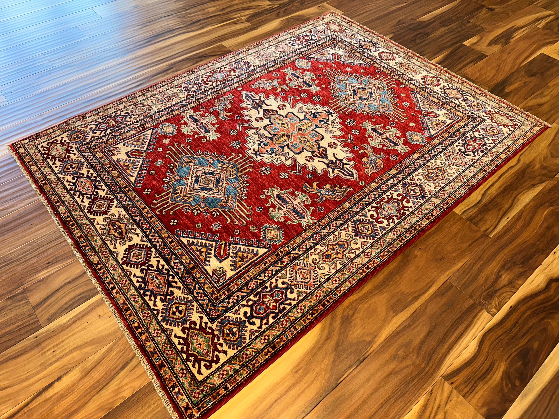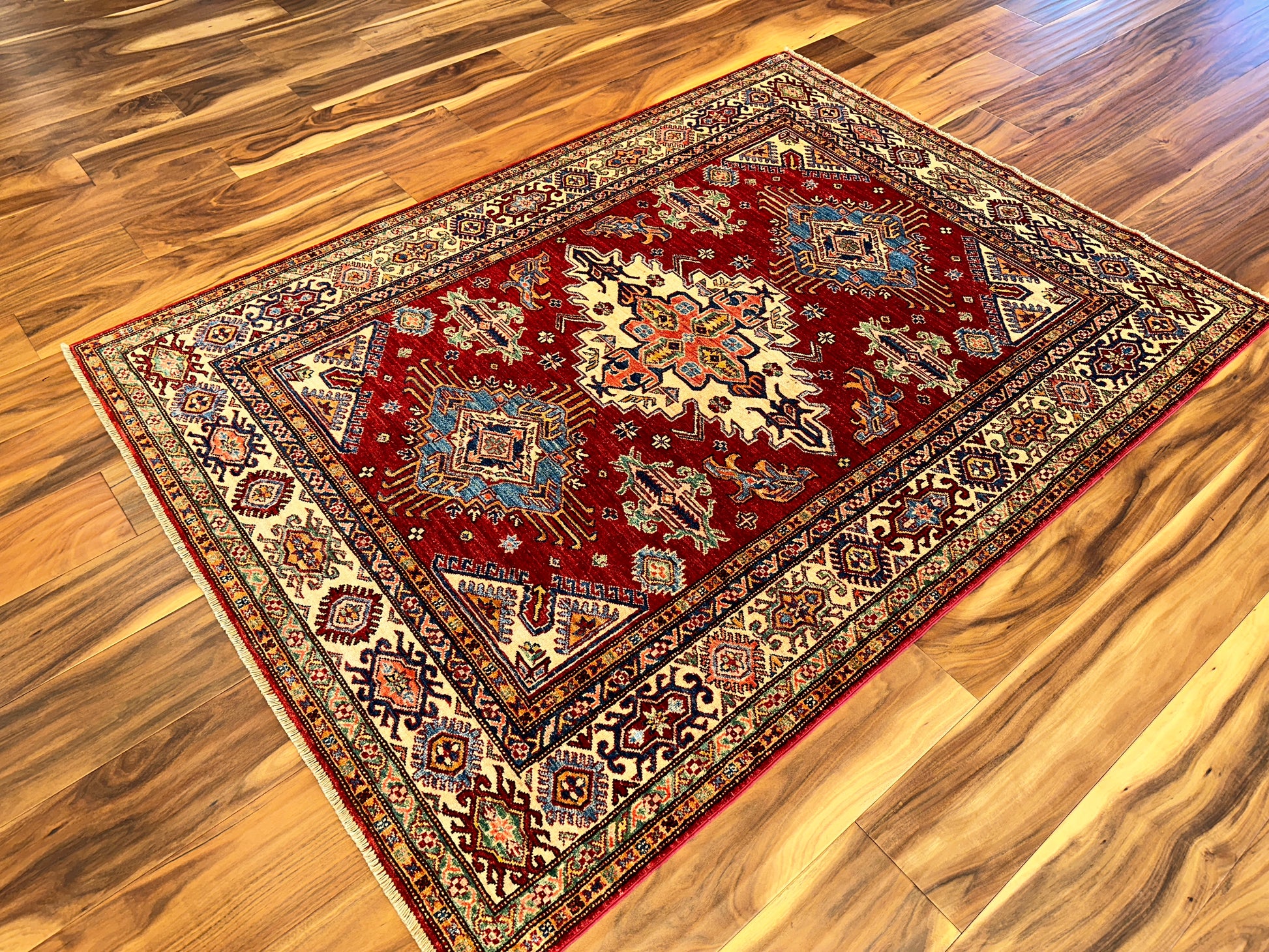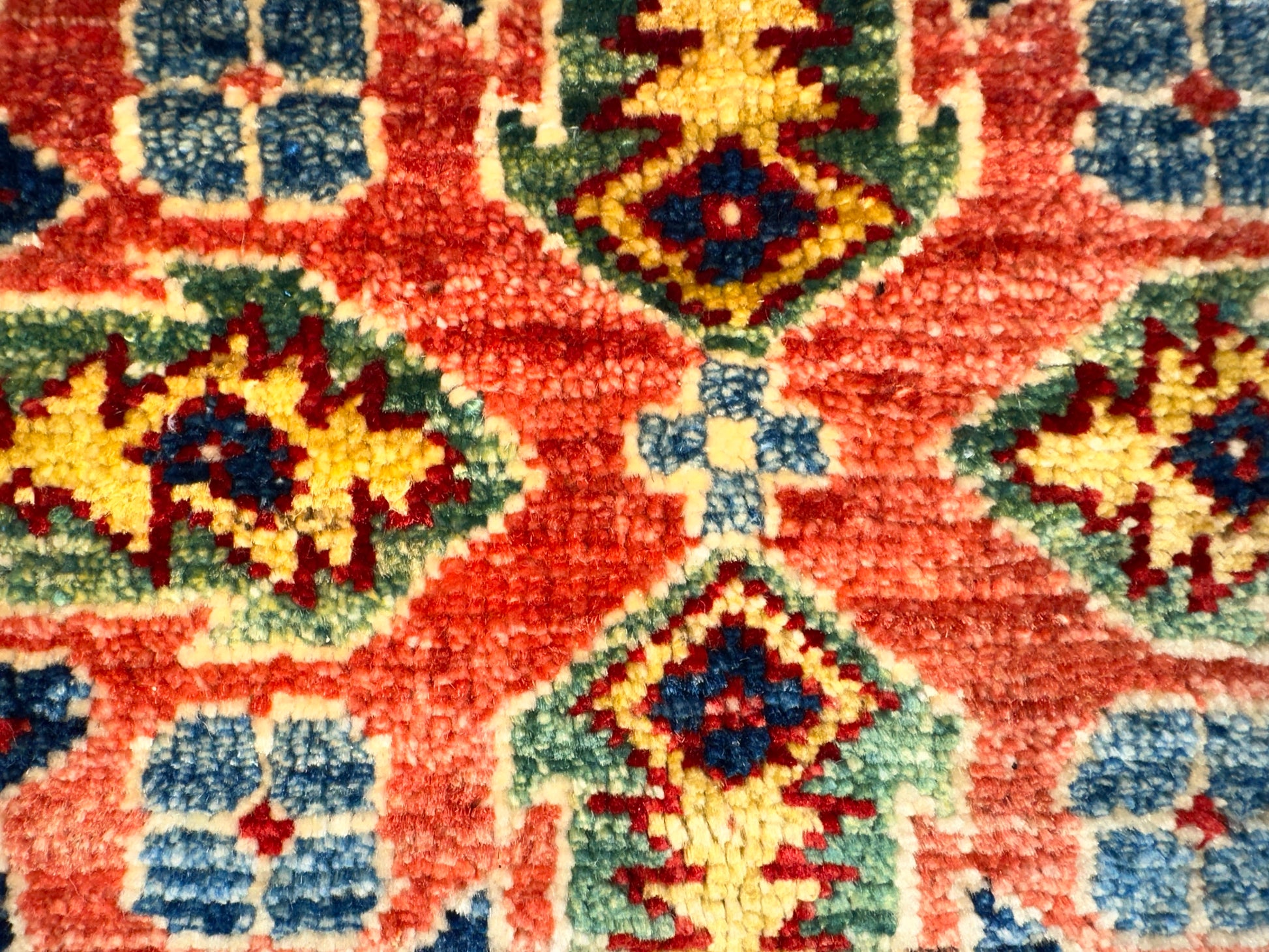 Bold and commanding, this handmade rug features a striking geometric medallion layout set against a vivid red field, accented with sky blue, cream, and deep navy tones. Rich in tribal motifs and angular forms, the layered borders add intricate framing that enhances its dynamic and traditional feel.