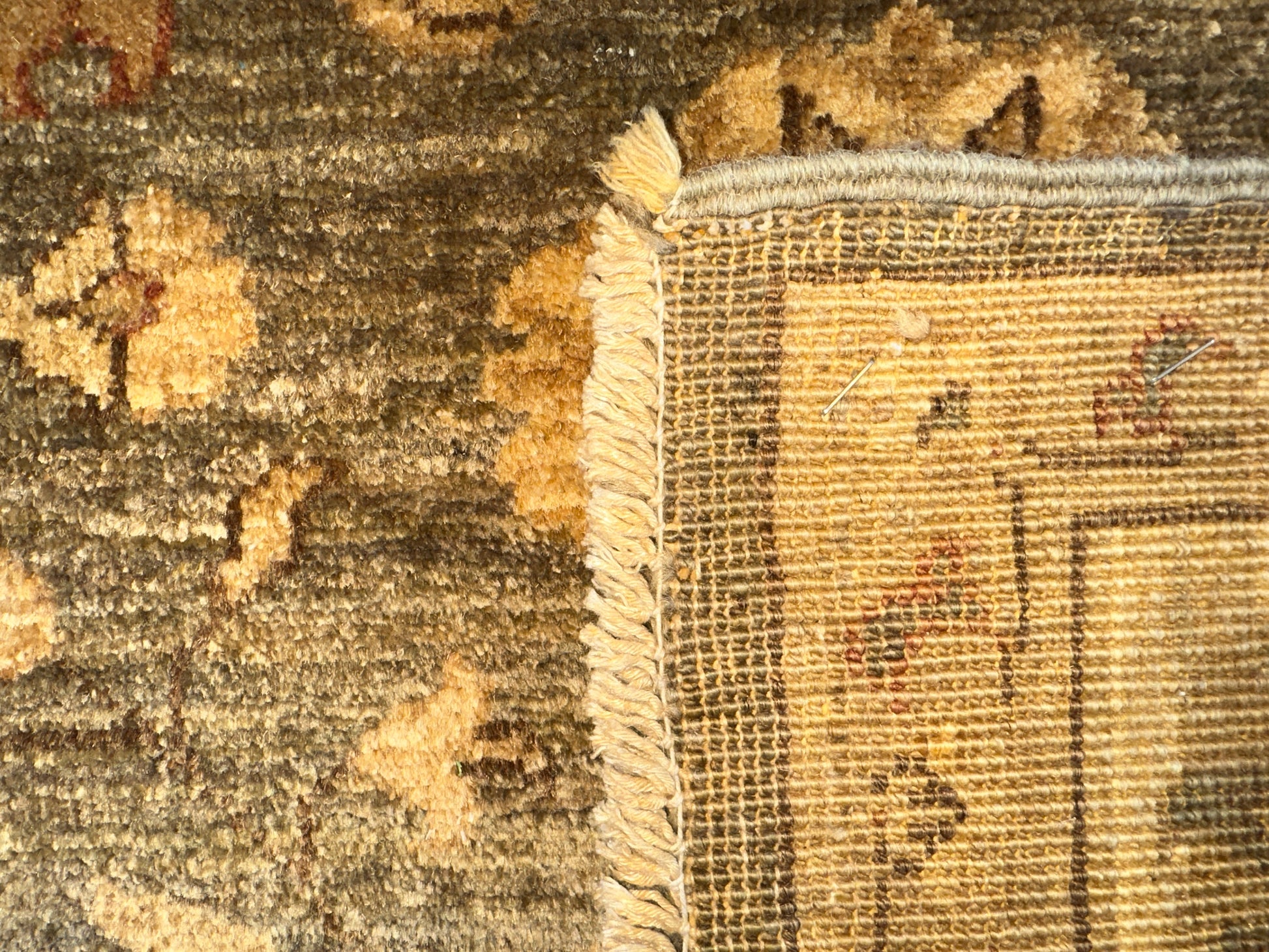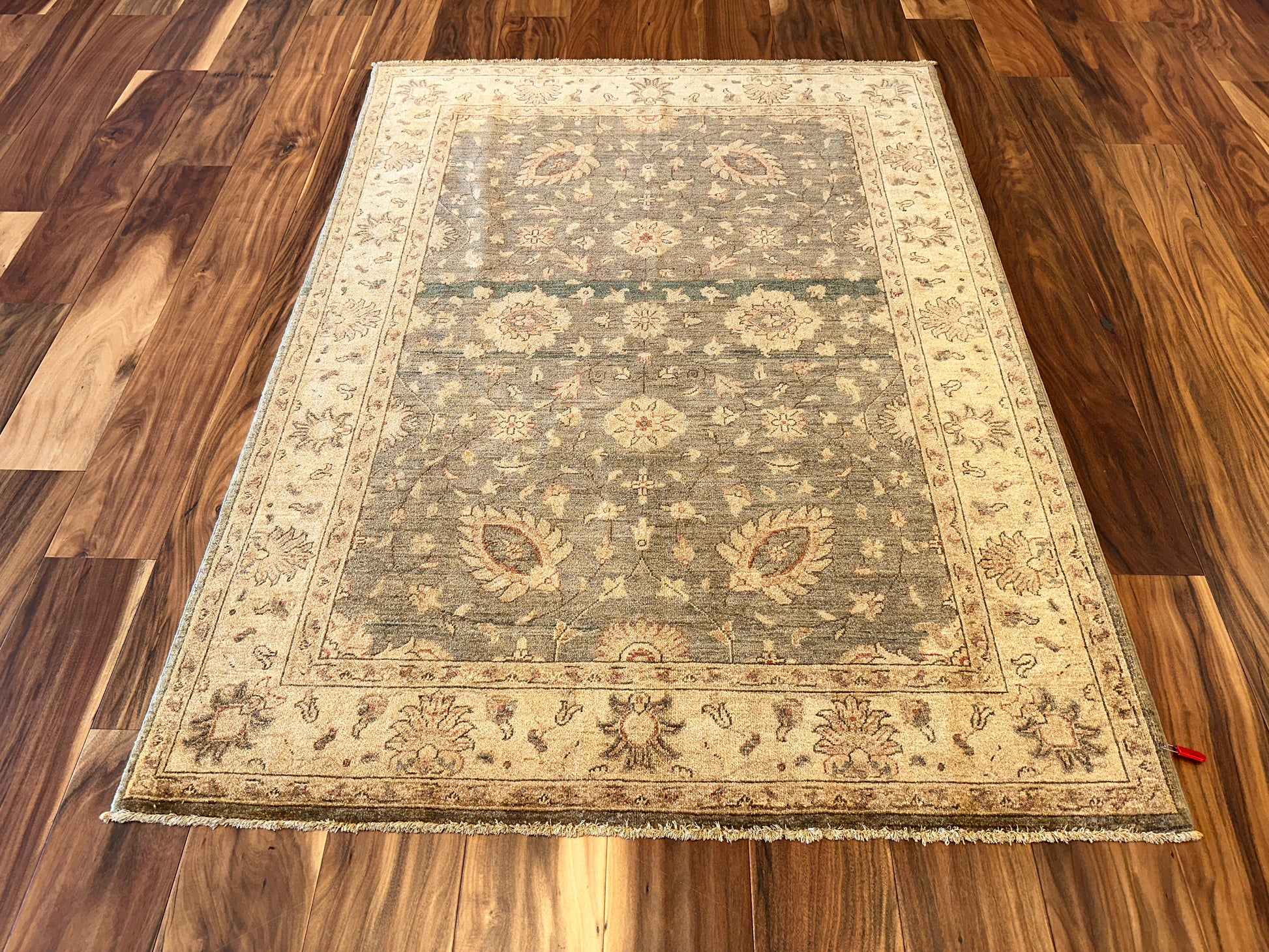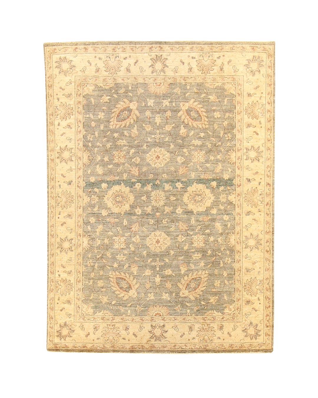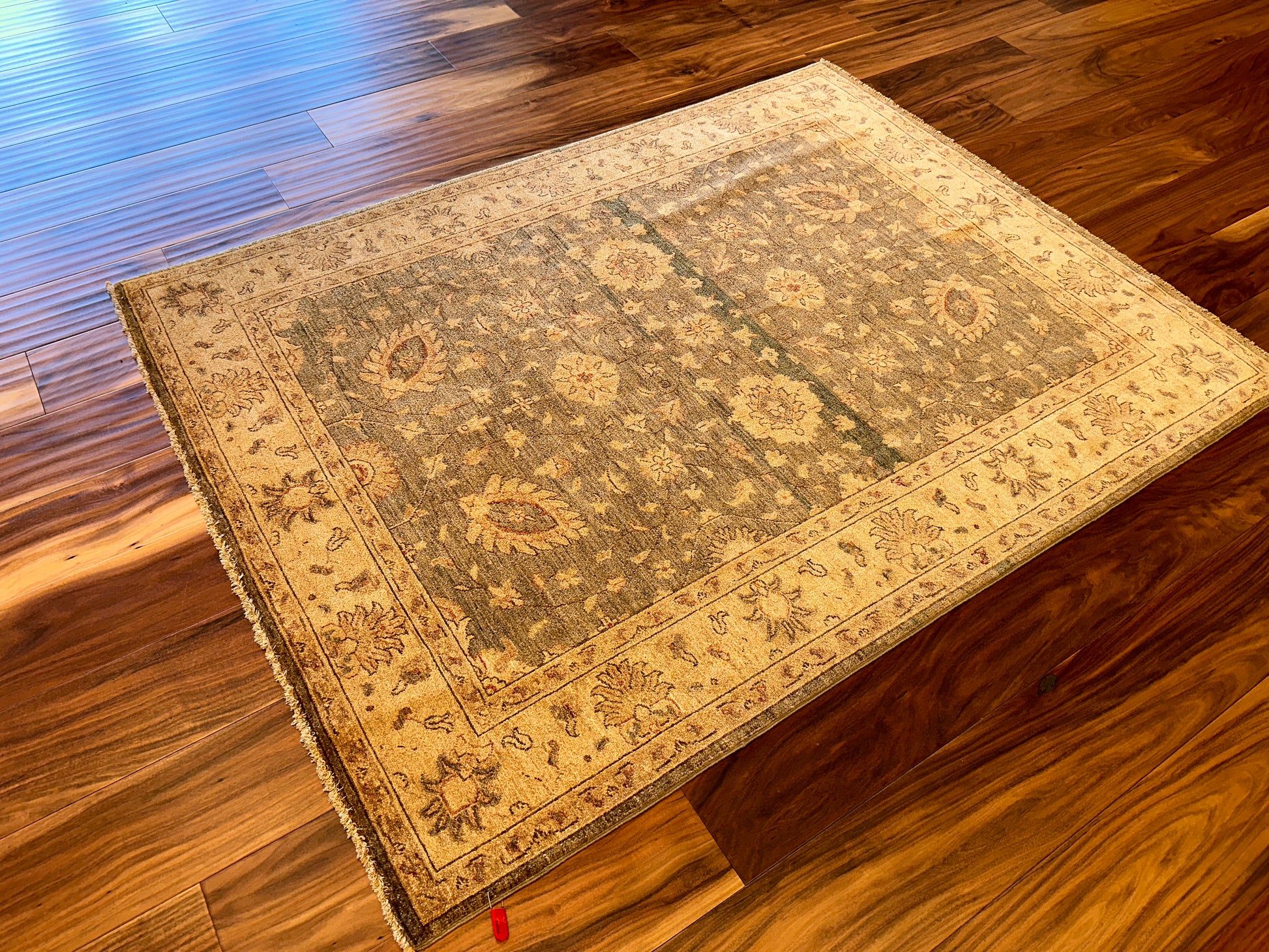 With its soft, weathered look and harmonious palette, this handmade rug features a calming green field filled with palmettes, rosettes, and leafy vines, framed by a wide floral border in gentle beige tones. The overall design is both airy and grounded, offering a perfect blend of subtle elegance and classic tradition.