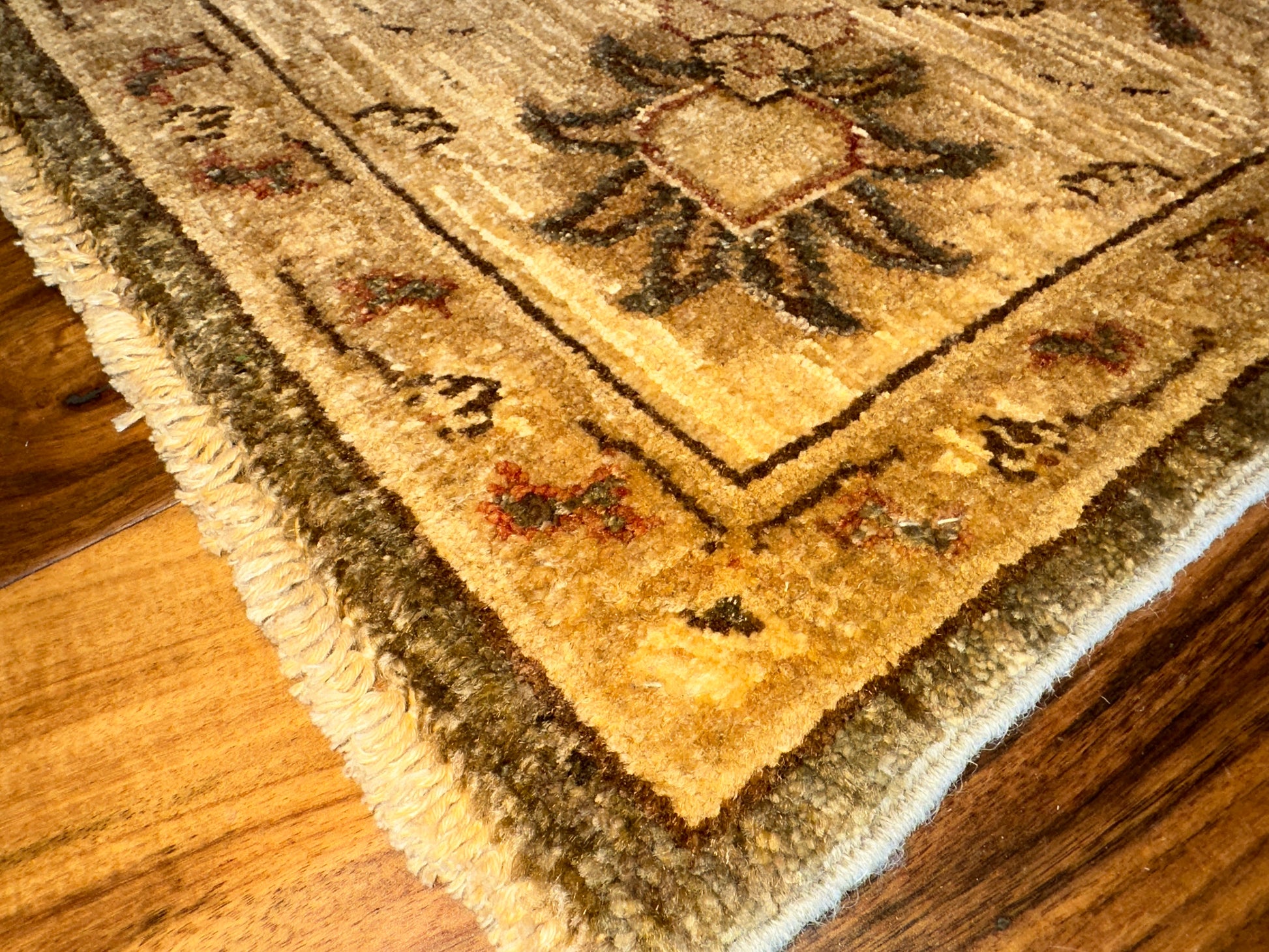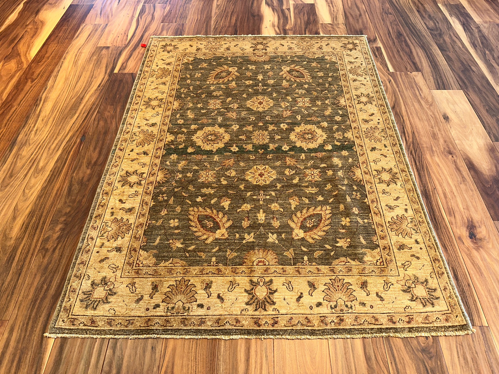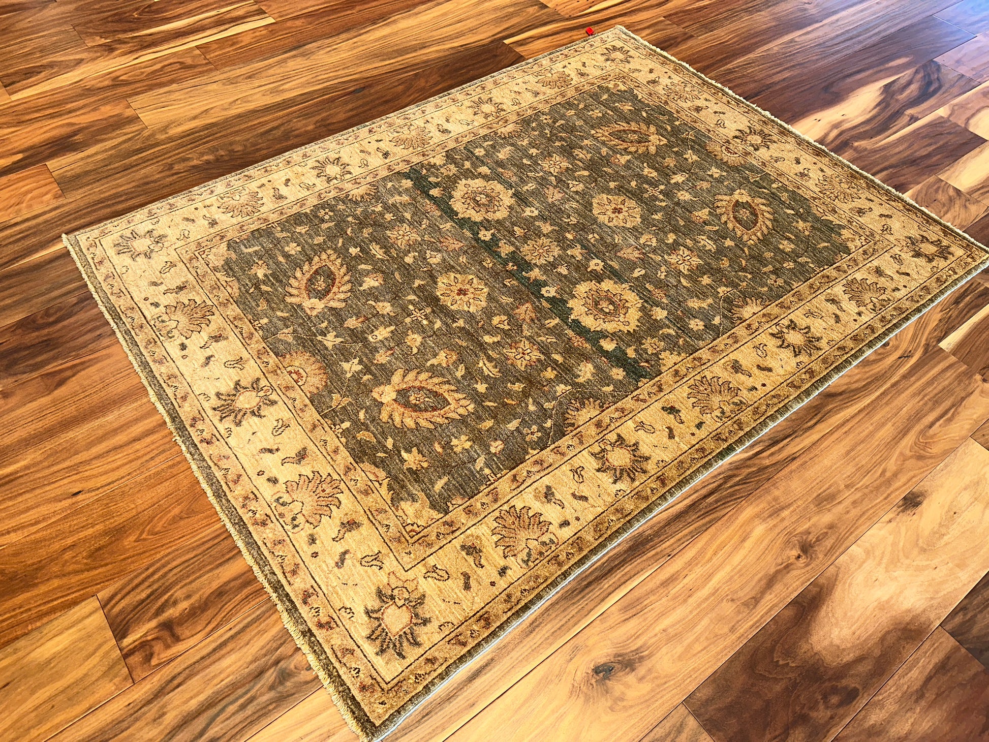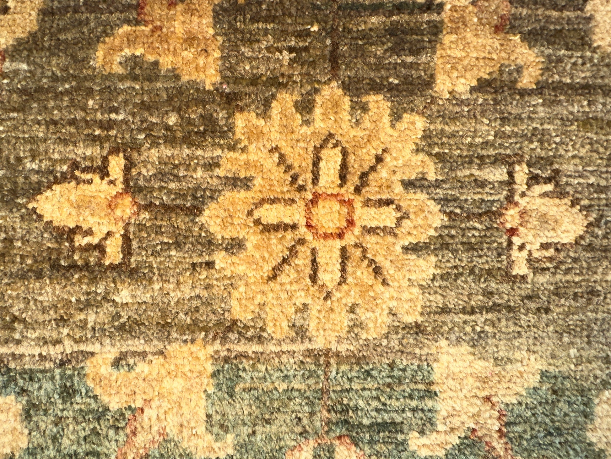 With its soft, weathered look and harmonious palette, this handmade rug features a calming green field filled with palmettes, rosettes, and leafy vines, framed by a wide floral border in gentle beige tones. The overall design is both airy and grounded, offering a perfect blend of subtle elegance and classic tradition.