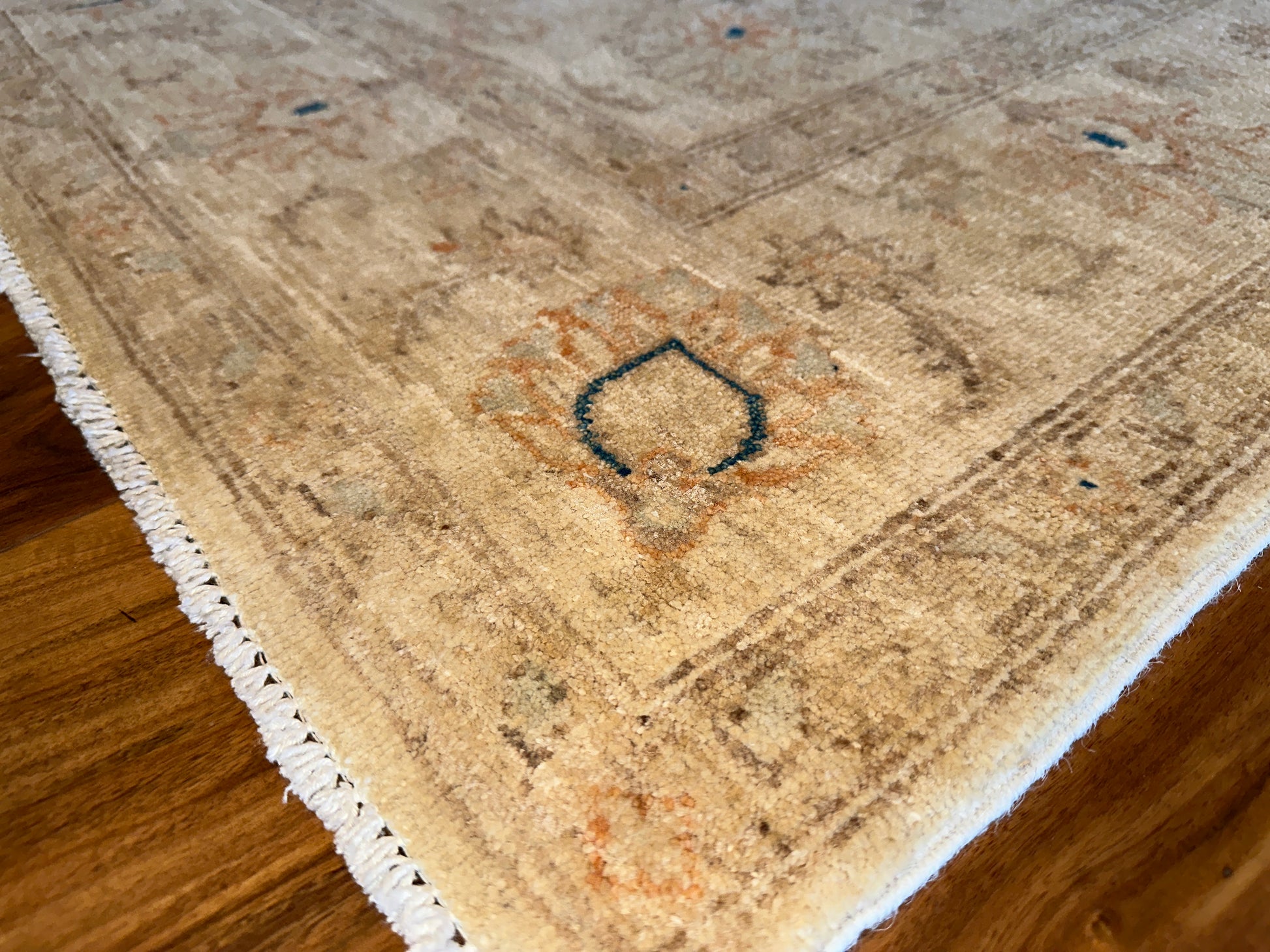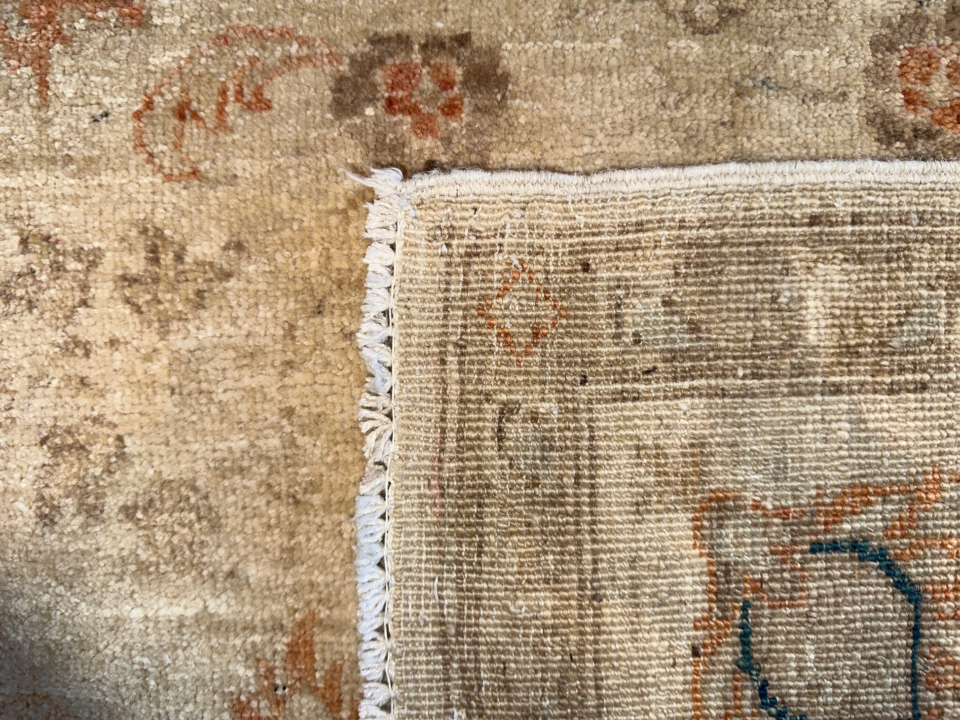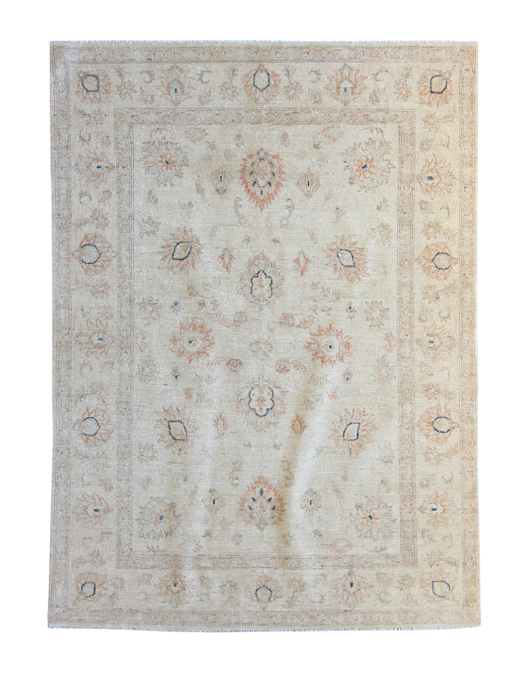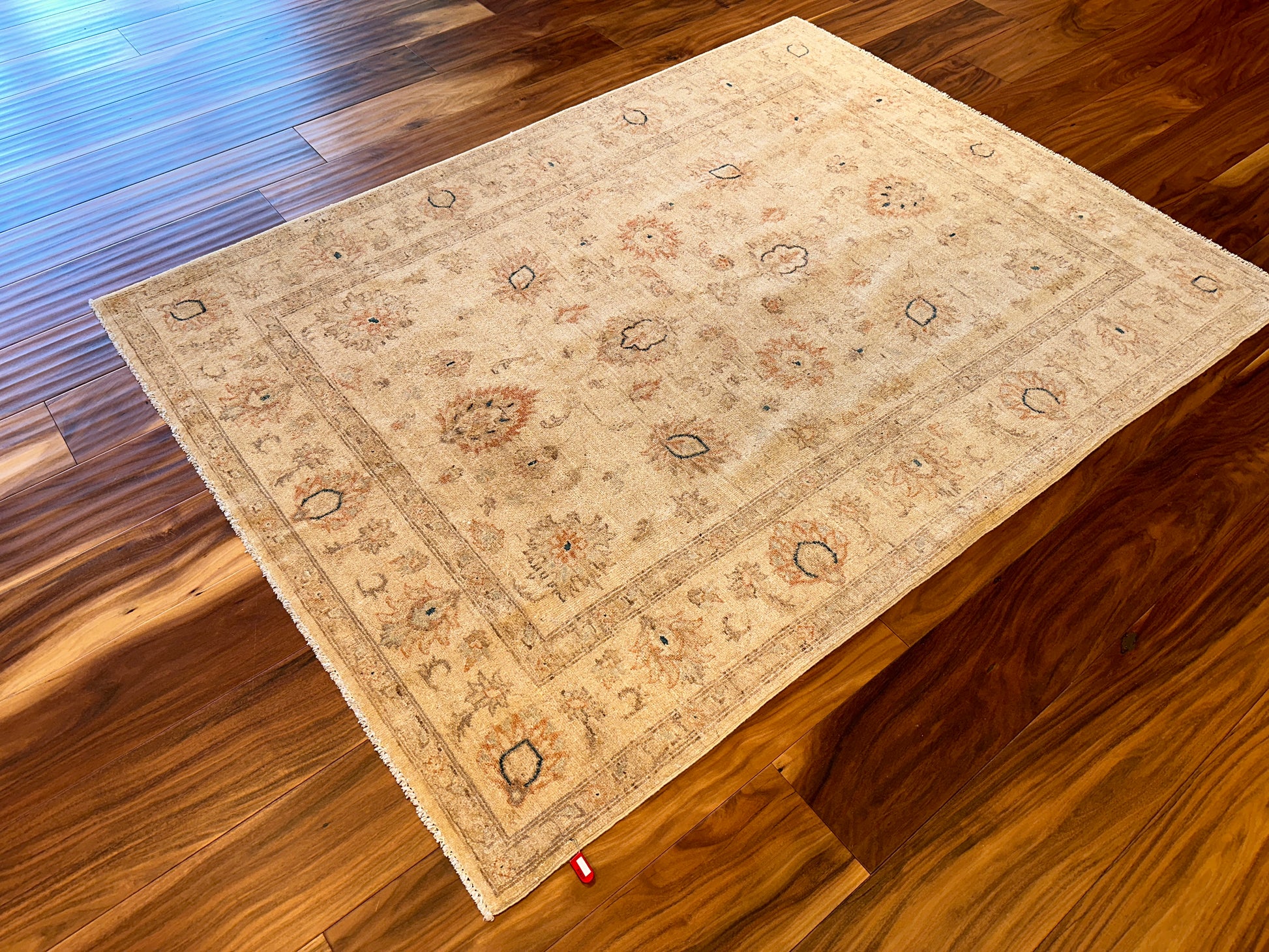 Soft and understated, this handmade rug features a subtly faded floral design with delicate vines and palmettes gently dispersed across a warm beige ground. Muted terracotta and light blue accents bring a touch of color without overpowering the composition, creating a tranquil, lived-in elegance perfect for relaxed interiors.