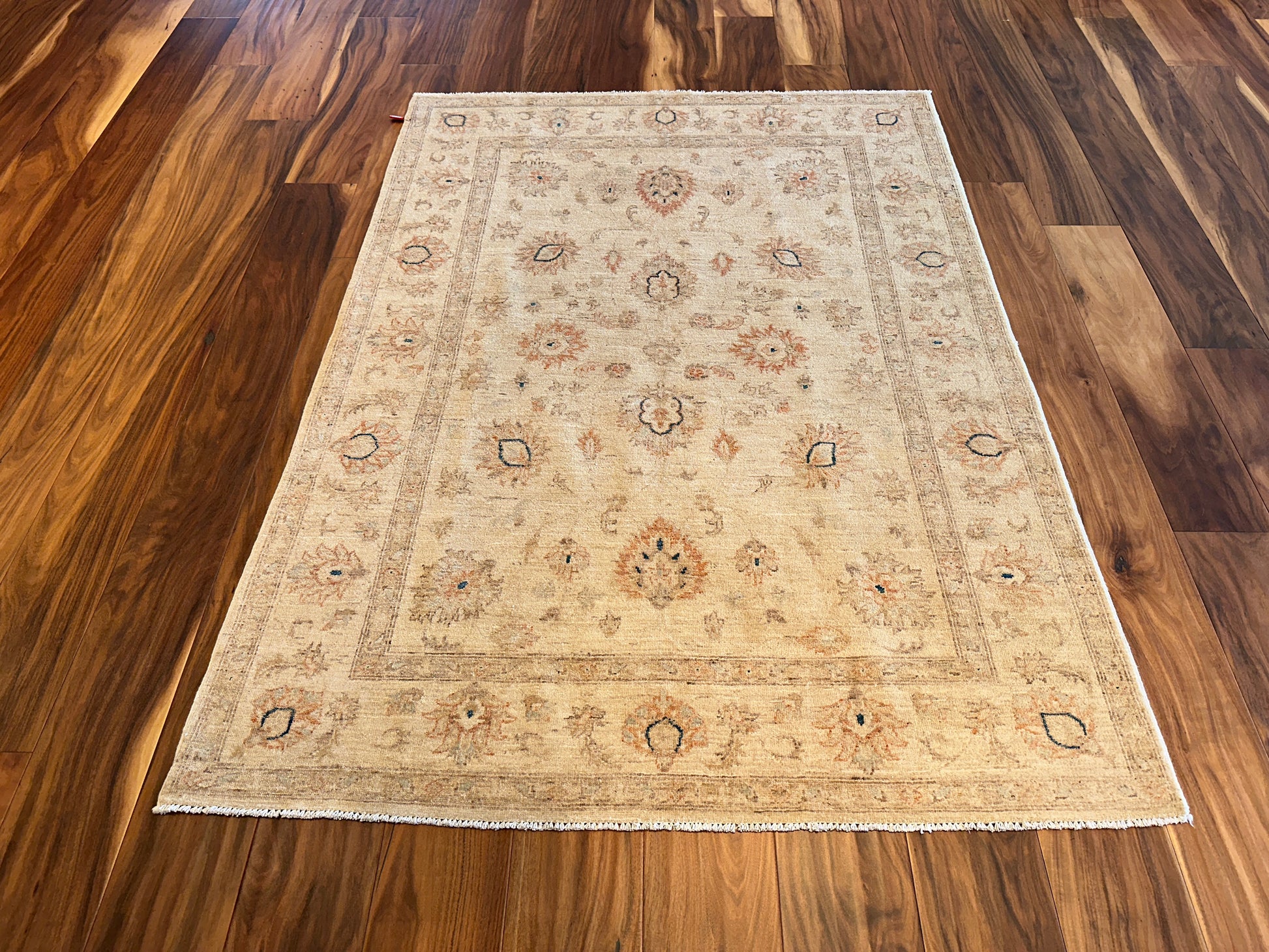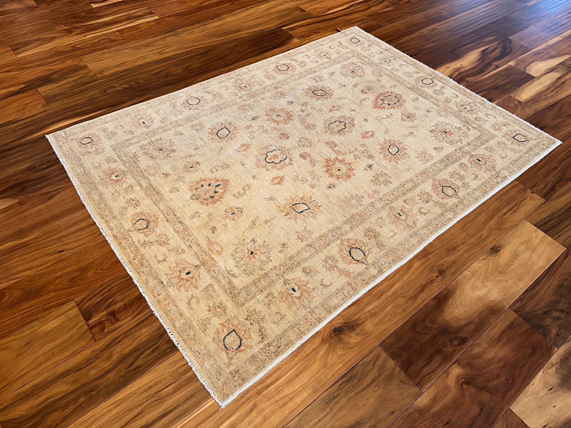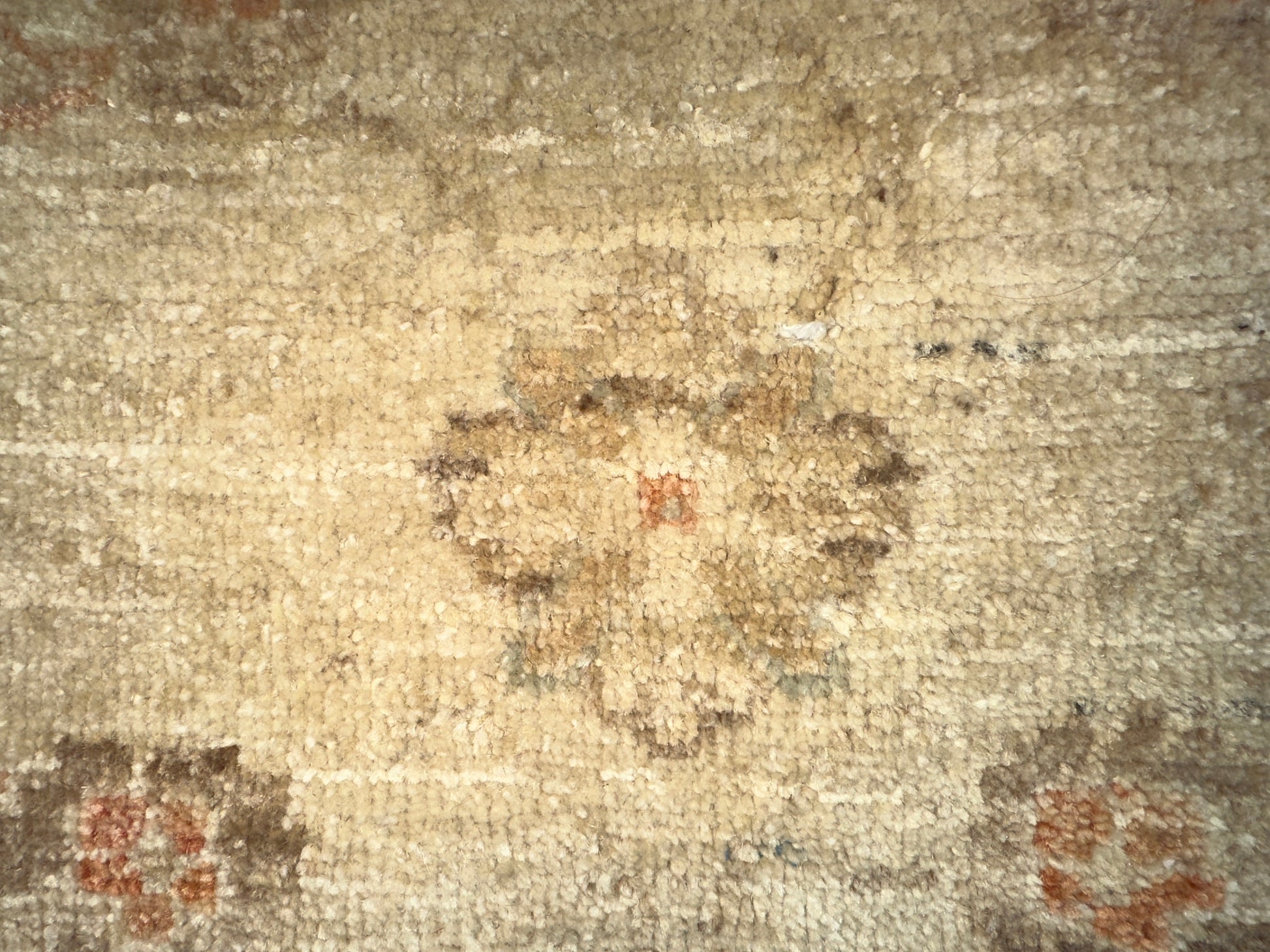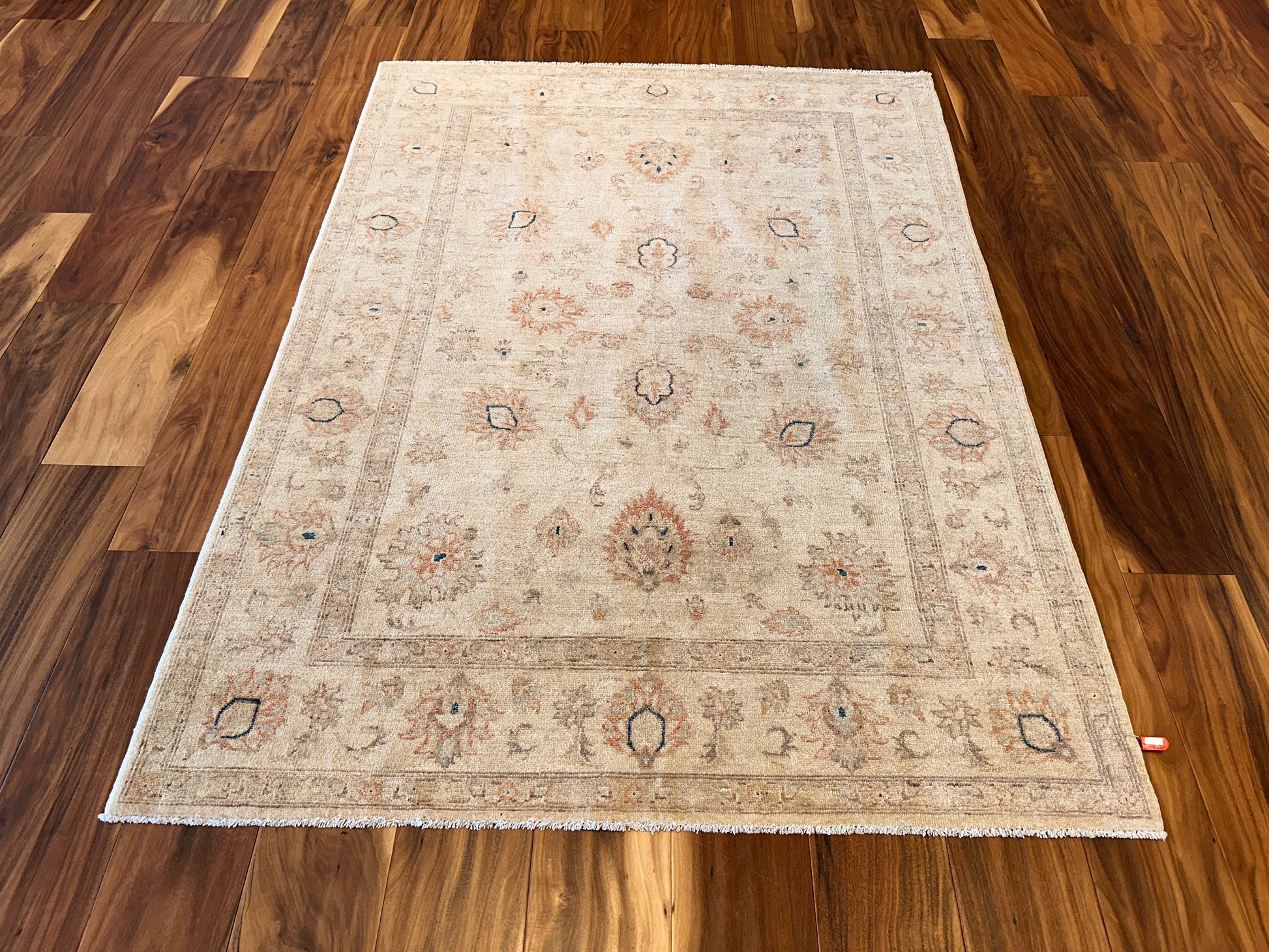 Soft and understated, this handmade rug features a subtly faded floral design with delicate vines and palmettes gently dispersed across a warm beige ground. Muted terracotta and light blue accents bring a touch of color without overpowering the composition, creating a tranquil, lived-in elegance perfect for relaxed interiors.