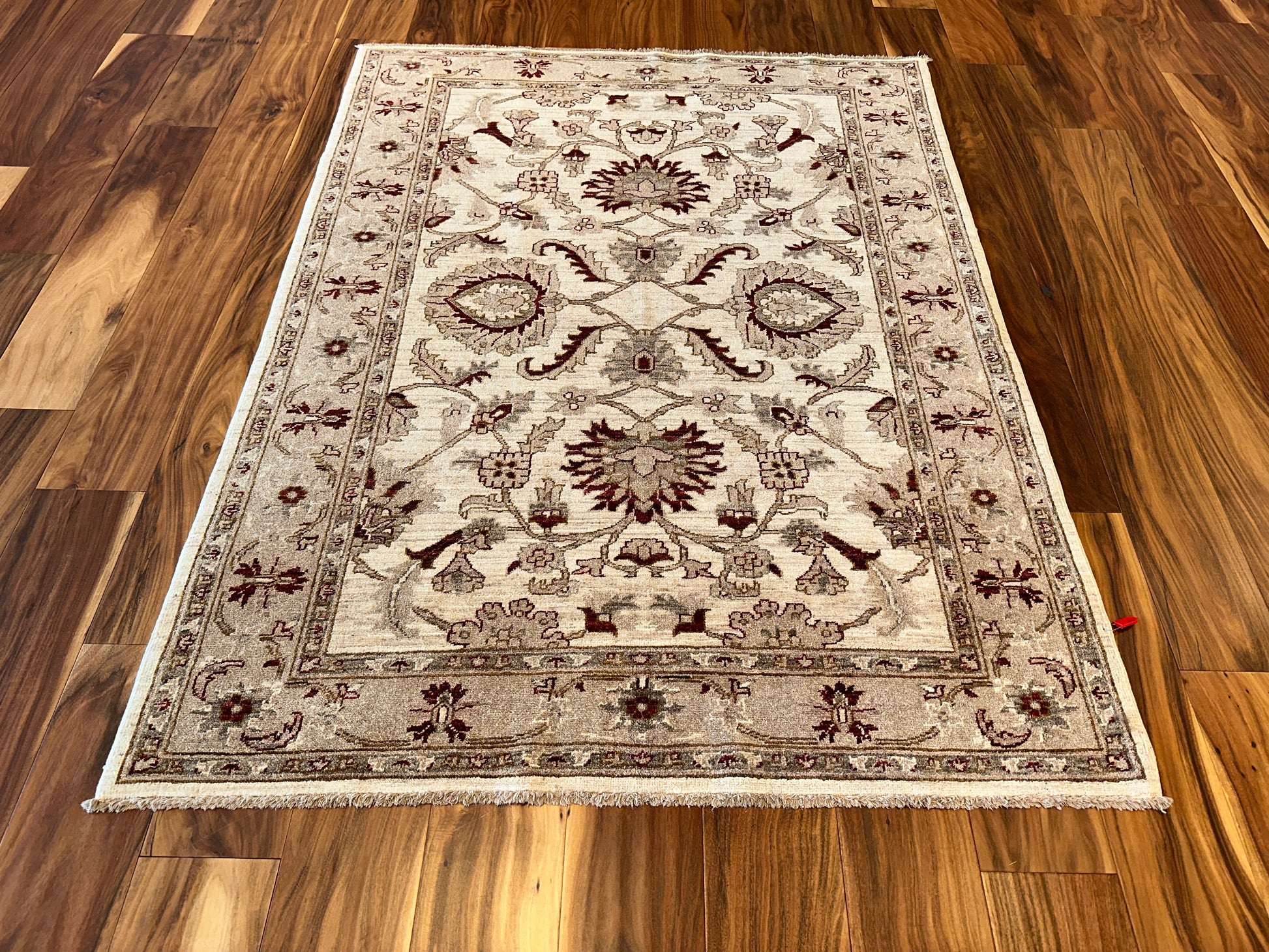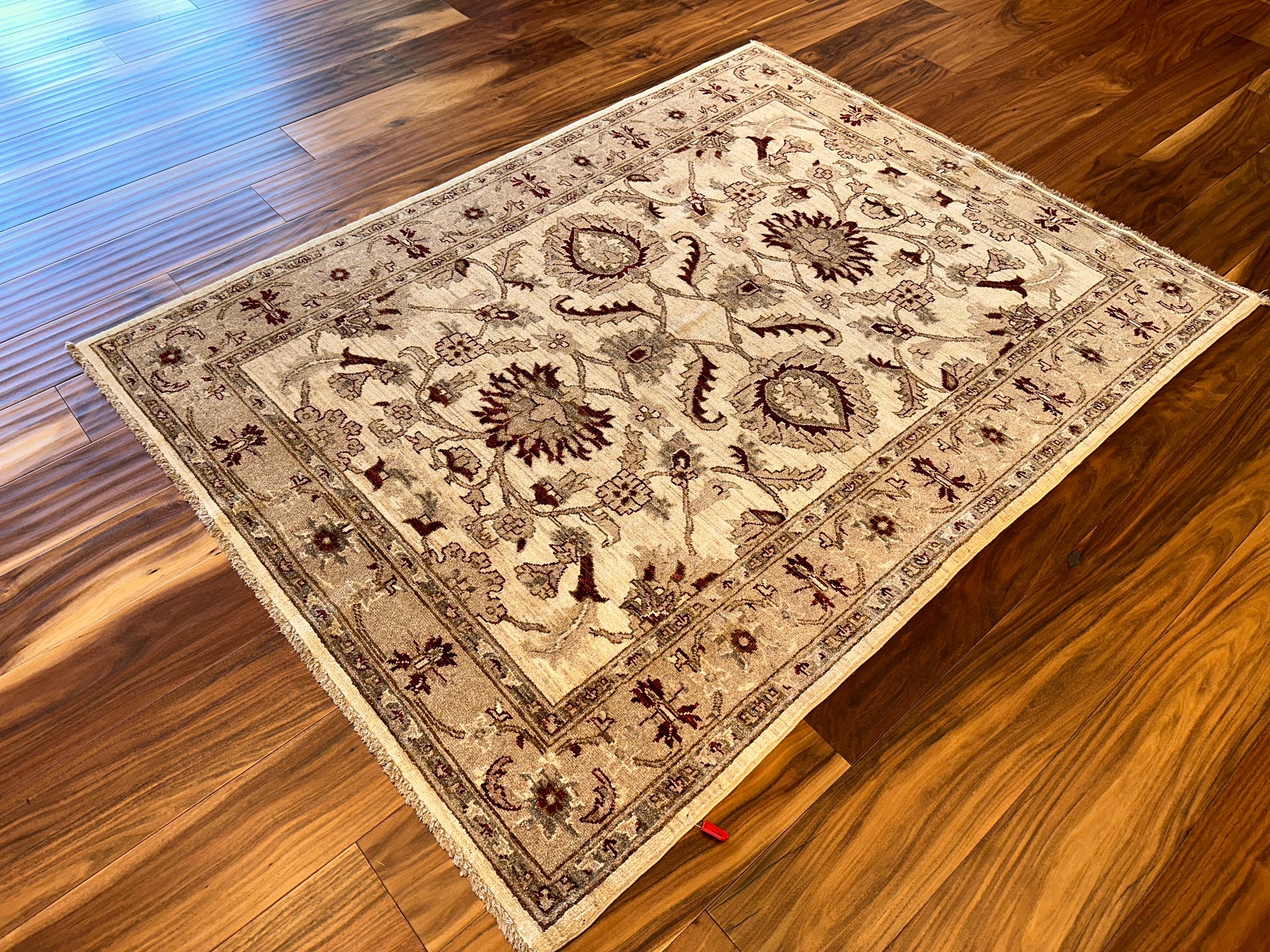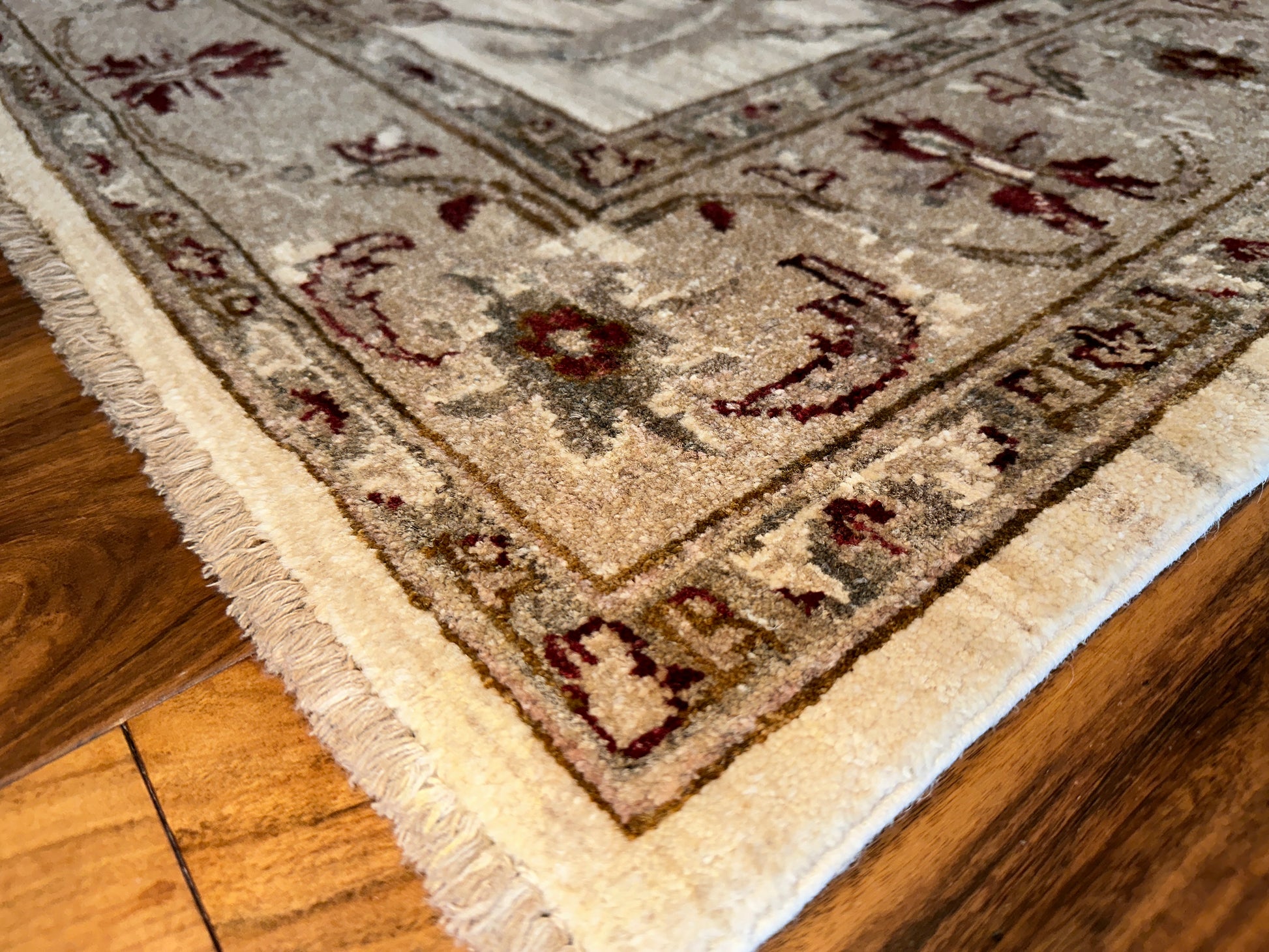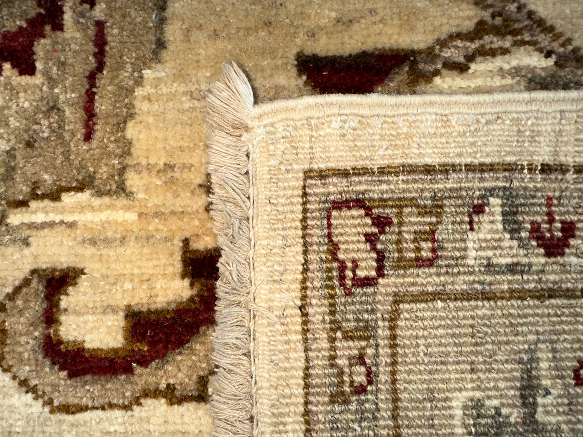 This handmade rug presents a classic botanical design with large-scale floral motifs and scrolling vines arranged symmetrically across a soft beige field. Deep burgundy and taupe accents lend a sense of warmth and refinement, while the fine border detailing brings balance and sophistication to the overall composition.