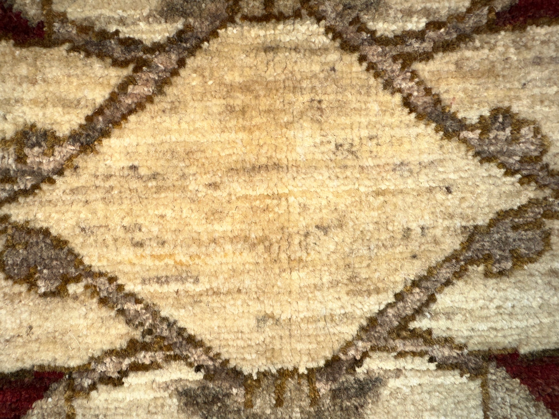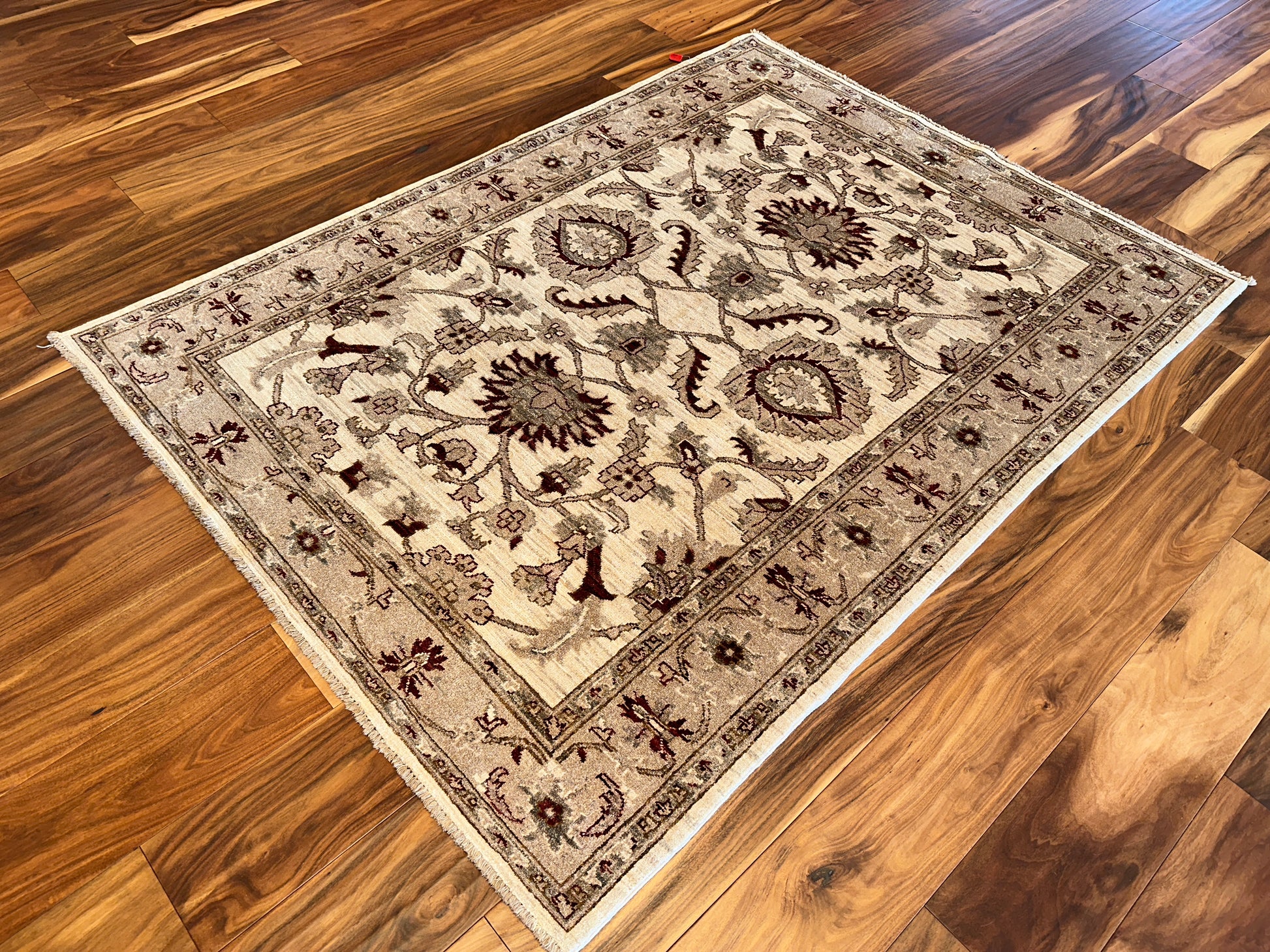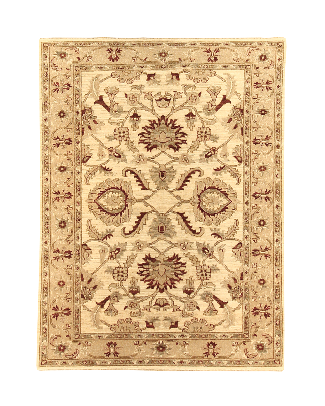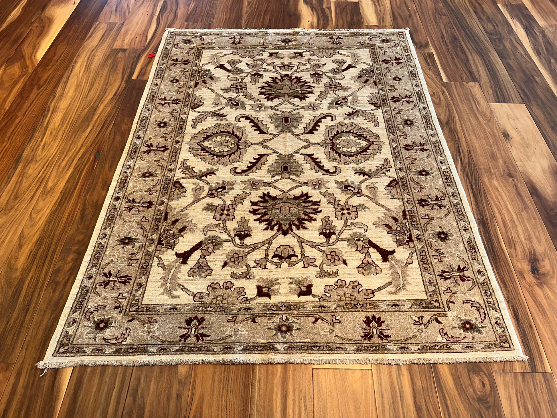 This handmade rug presents a classic botanical design with large-scale floral motifs and scrolling vines arranged symmetrically across a soft beige field. Deep burgundy and taupe accents lend a sense of warmth and refinement, while the fine border detailing brings balance and sophistication to the overall composition.