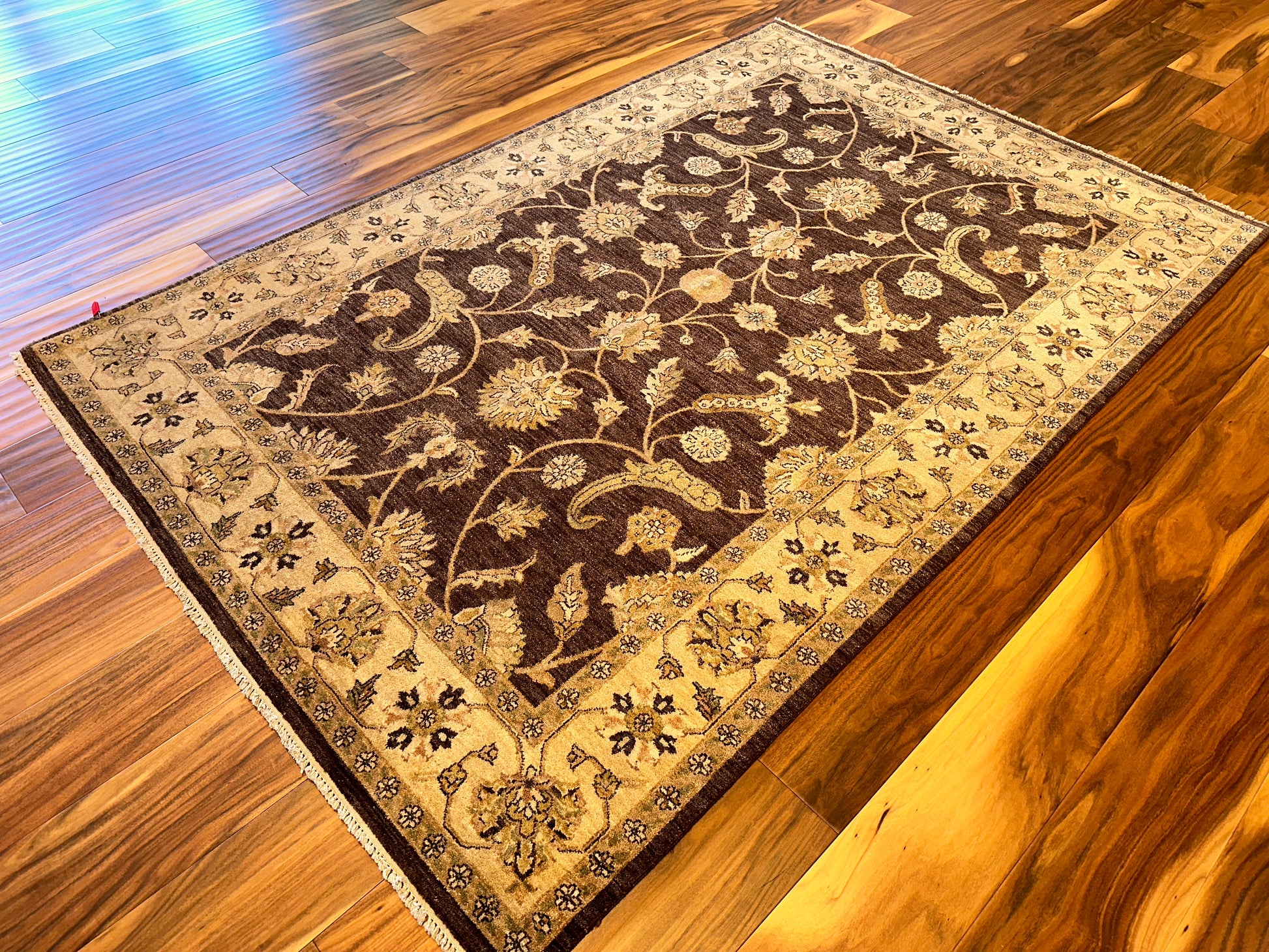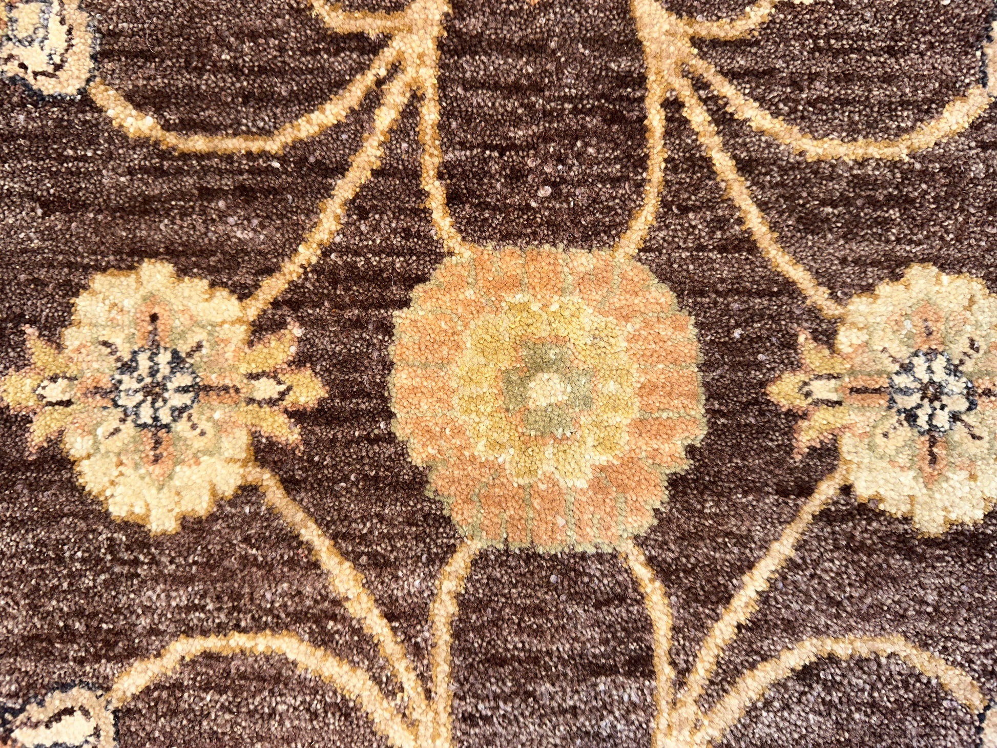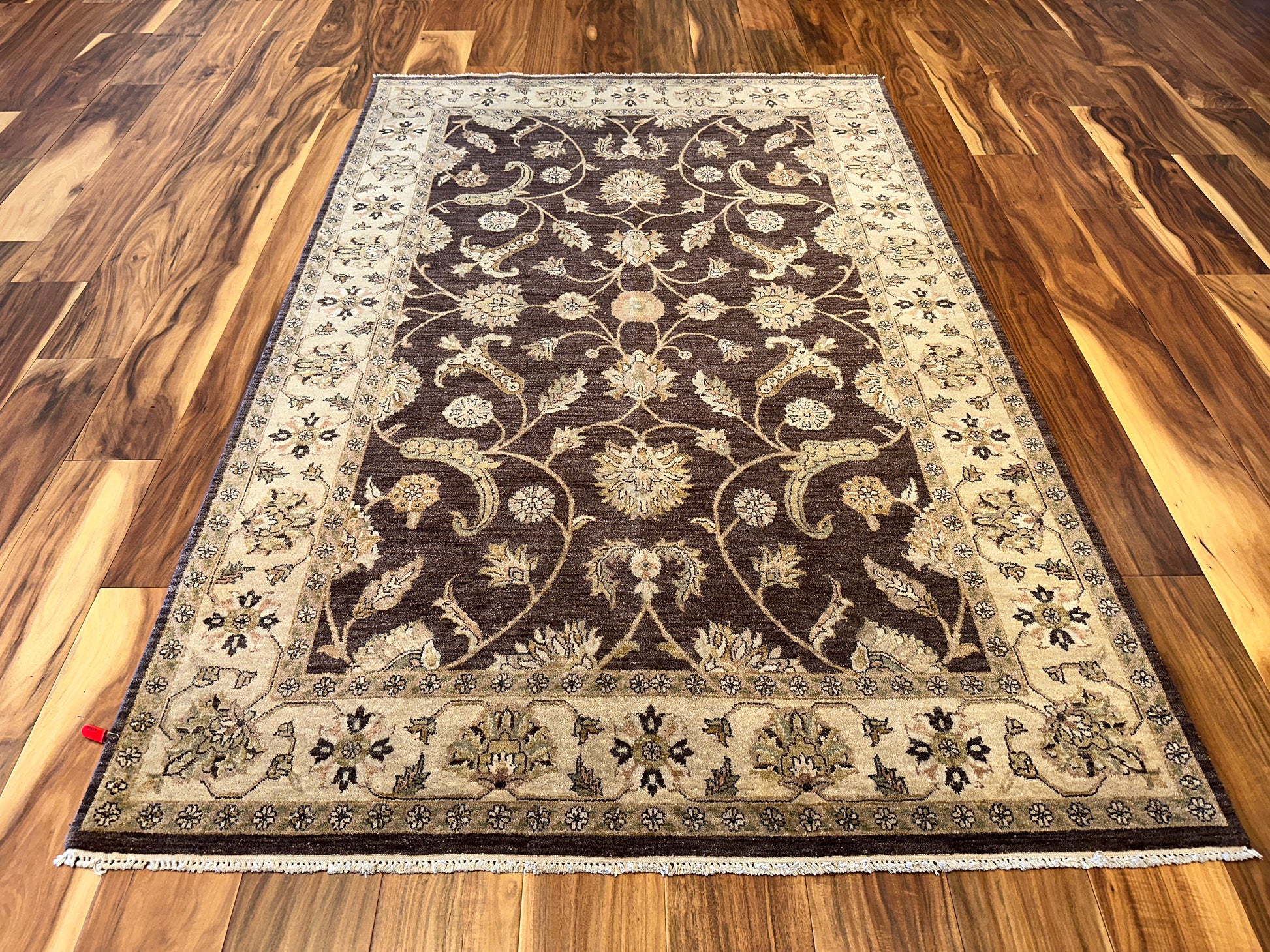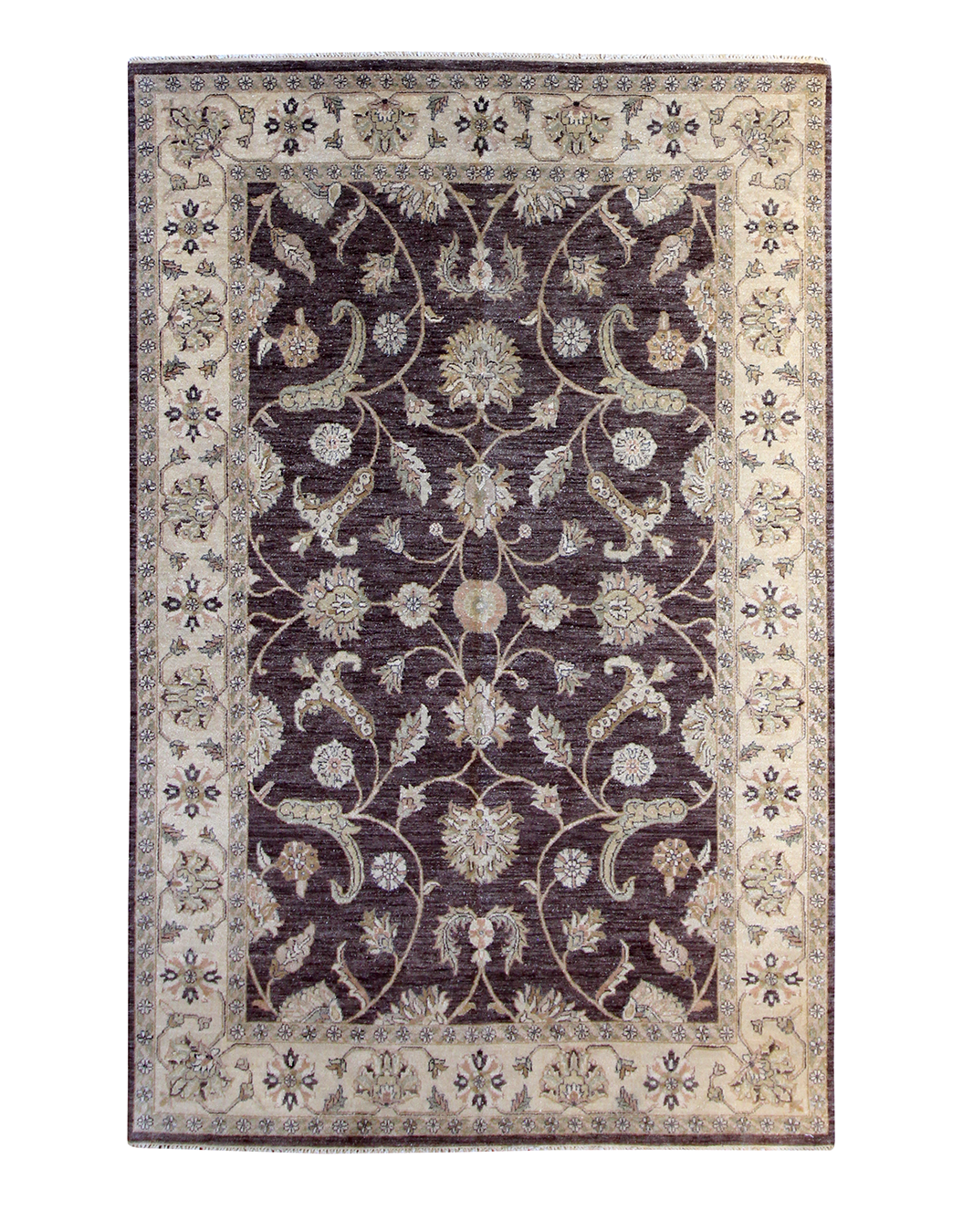 This elegant rug presents a timeless botanical design on a deep plum ground, softened by delicate floral motifs in pale beige and muted gold. The intricate vinework flows symmetrically from center to border, framed by a classic floral guard in soft neutrals. The overall effect is rich yet refined, perfect for adding quiet depth and balance to formal or transitional spaces.