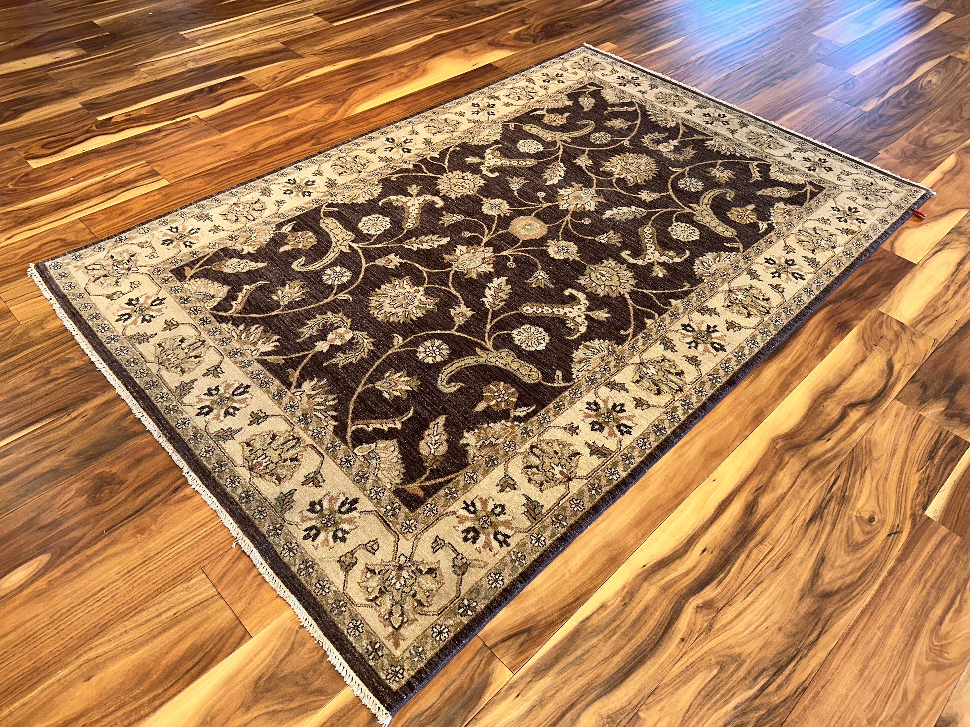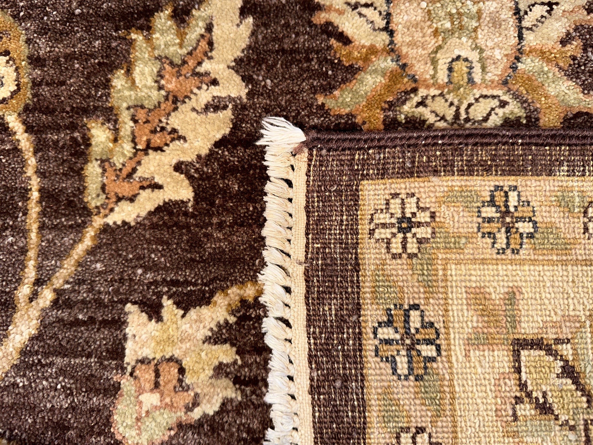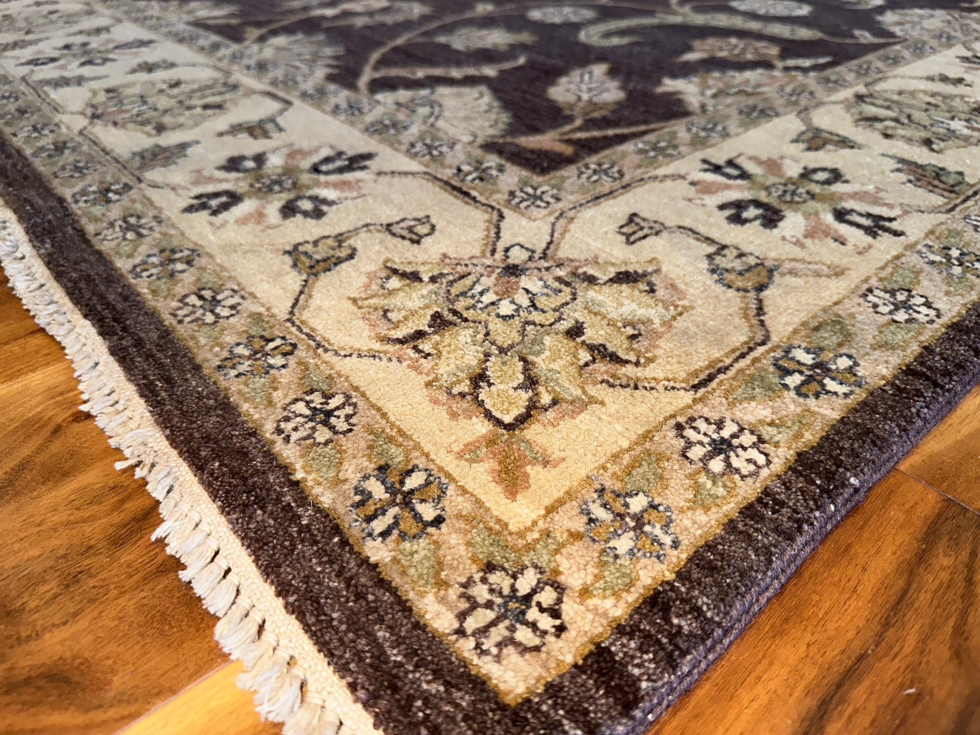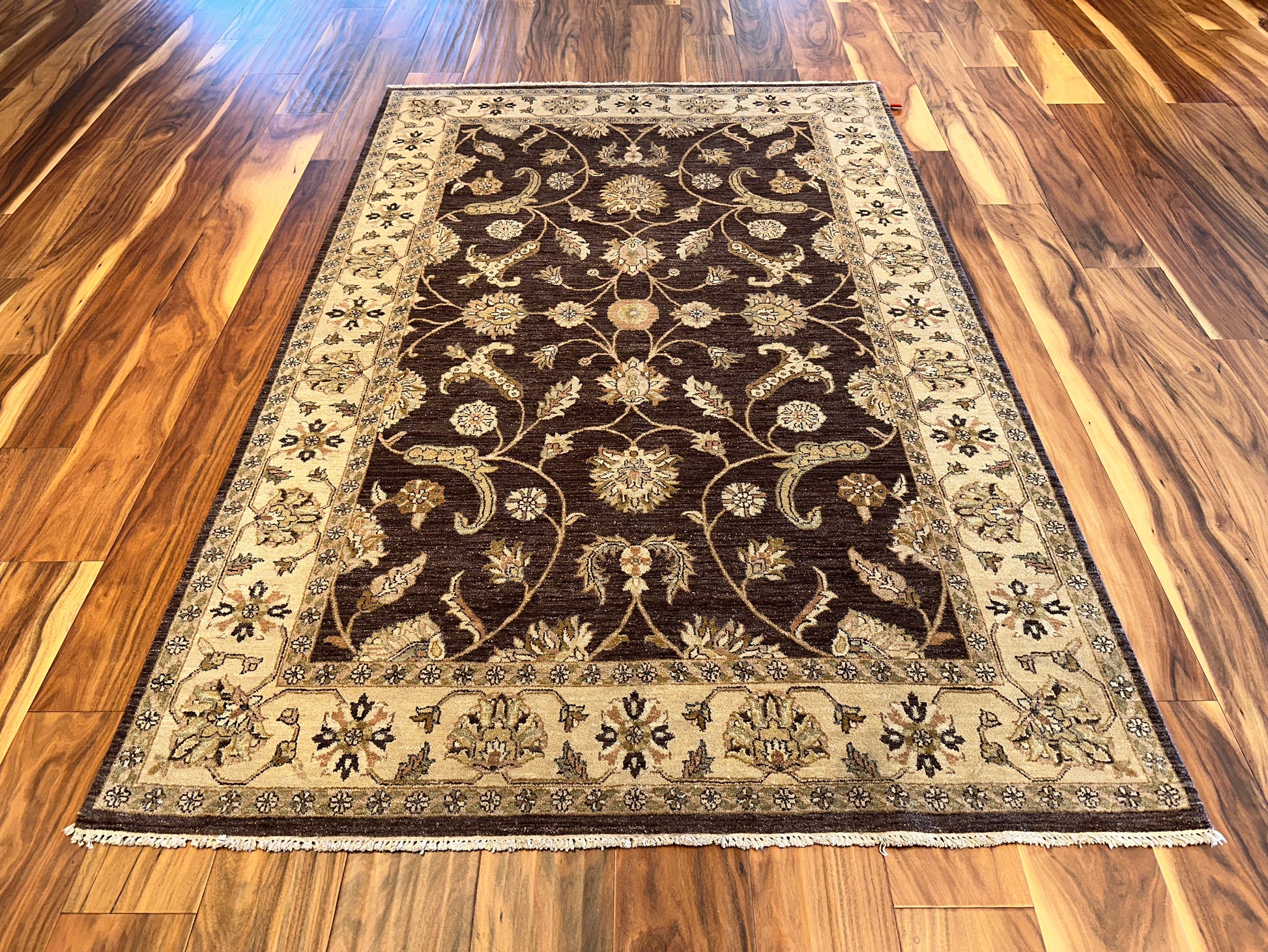 This elegant rug presents a timeless botanical design on a deep plum ground, softened by delicate floral motifs in pale beige and muted gold. The intricate vinework flows symmetrically from center to border, framed by a classic floral guard in soft neutrals. The overall effect is rich yet refined, perfect for adding quiet depth and balance to formal or transitional spaces.
