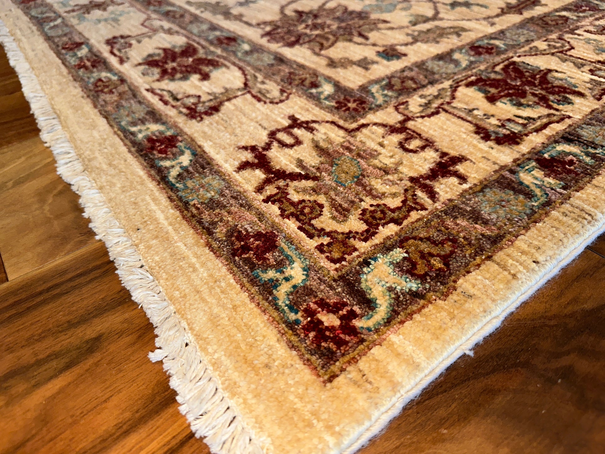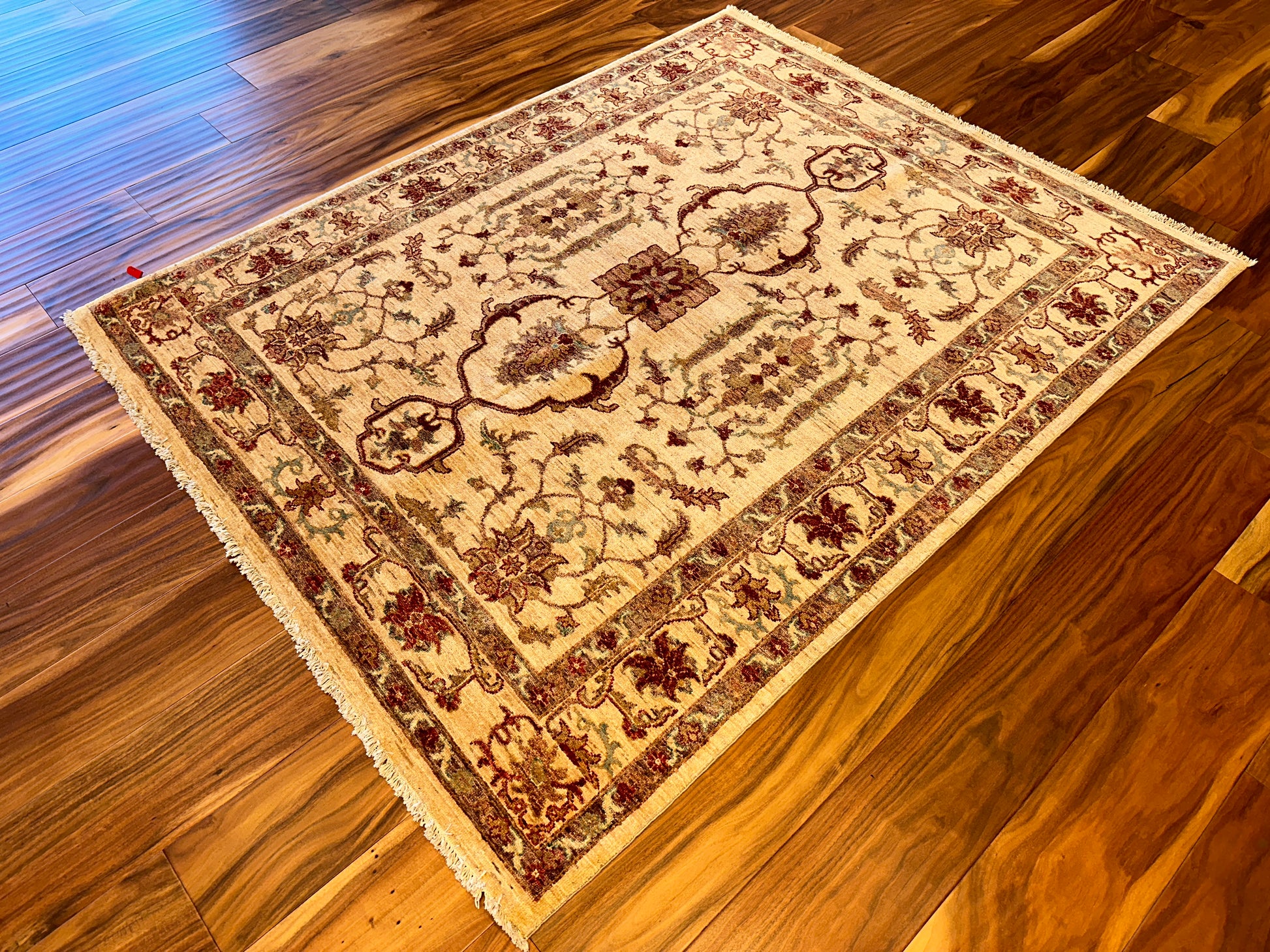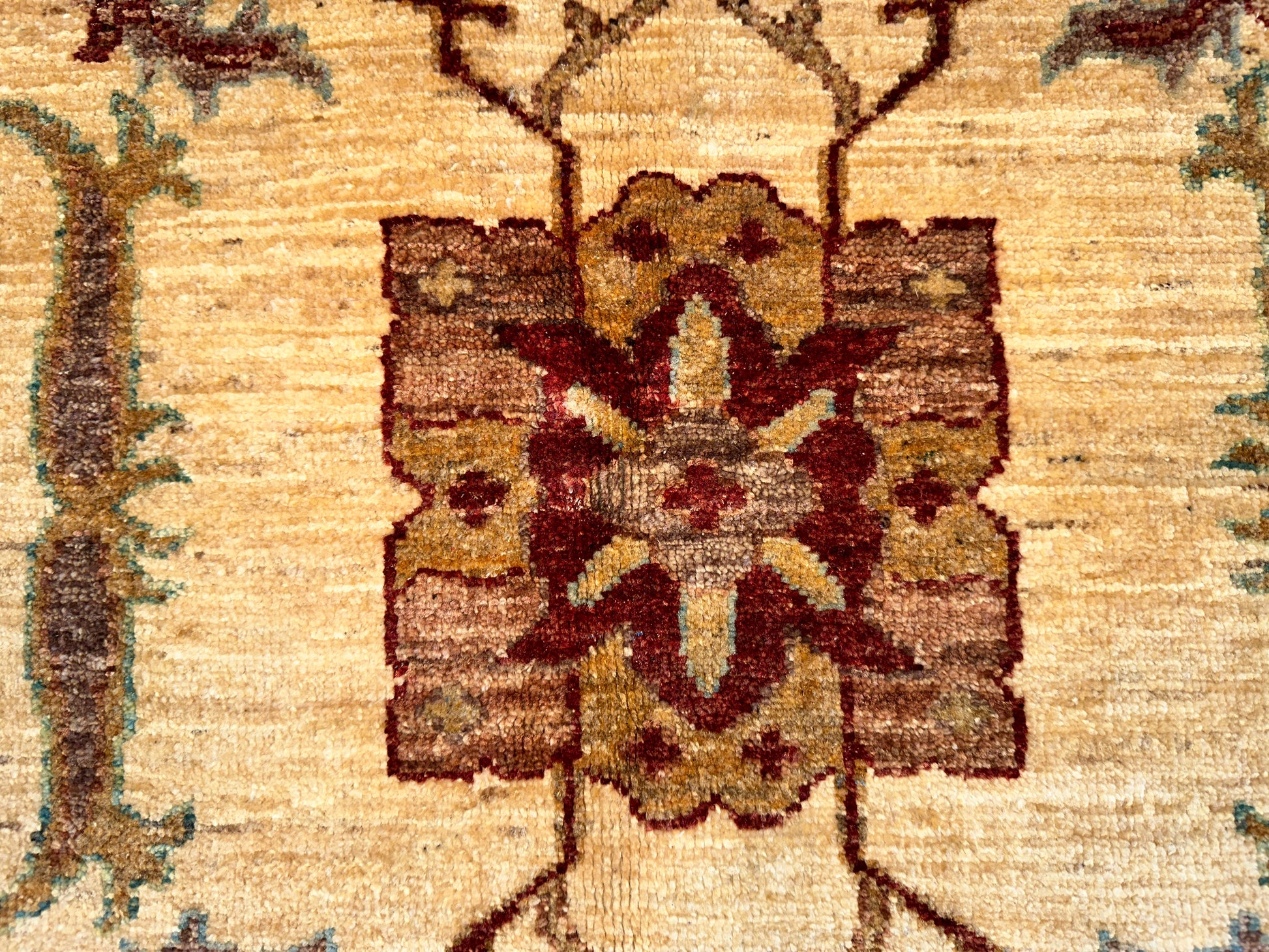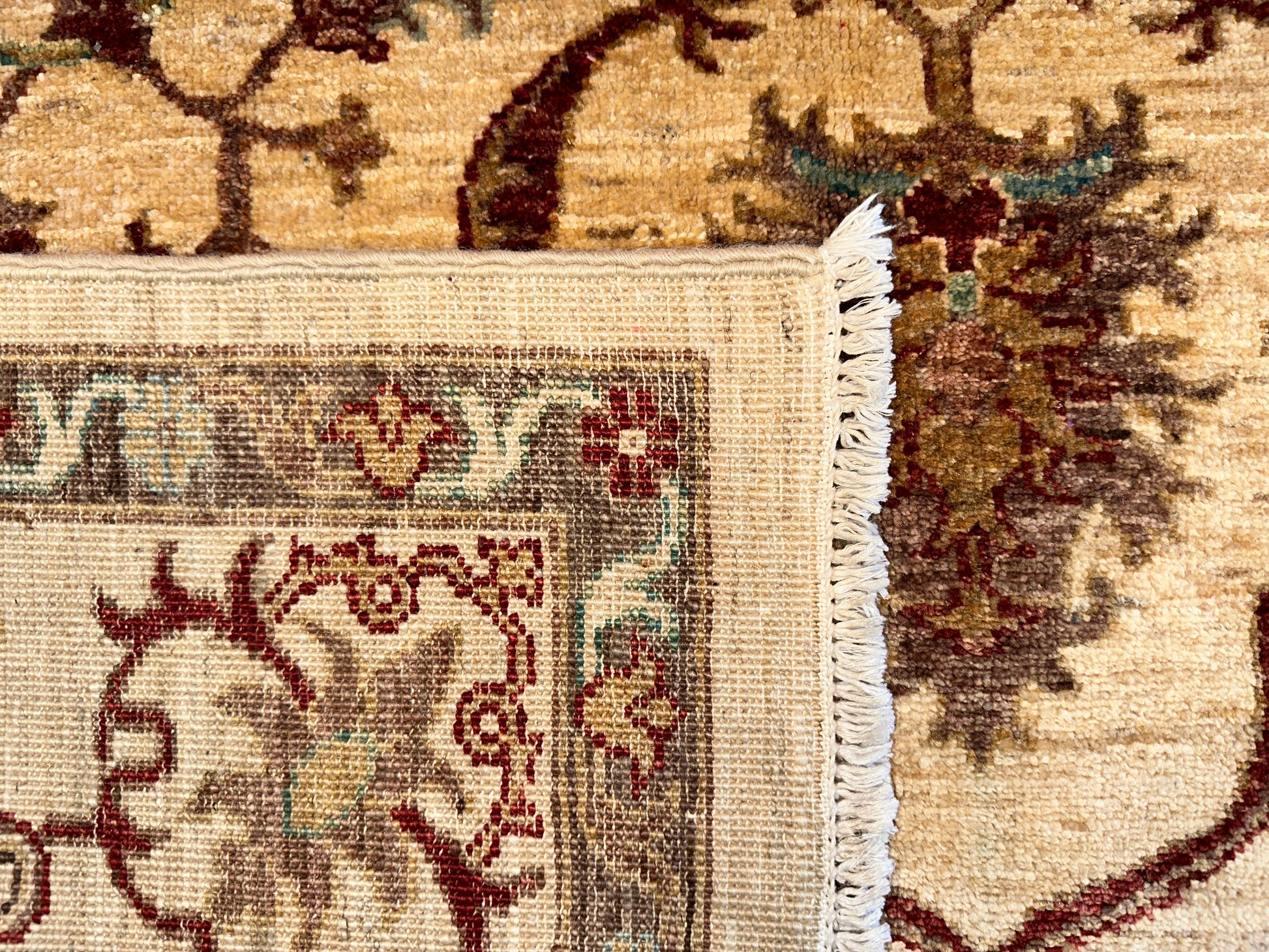This hand-knotted wool rug presents a softly structured design with a refined central medallion, scrolling floral vines, and balanced symmetry. Set against a warm beige field, the palette incorporates rich burgundy, sage green, and muted gold to create a traditional yet tranquil aesthetic. The detailed border echoes the inner motifs with harmonious repetition, lending timeless elegance to the piece.