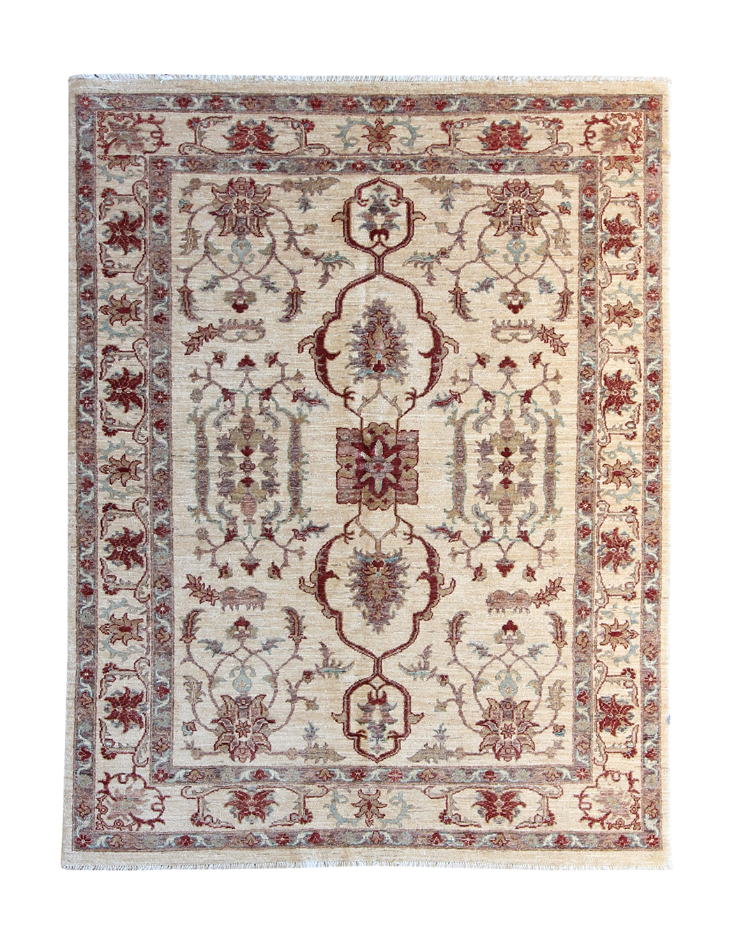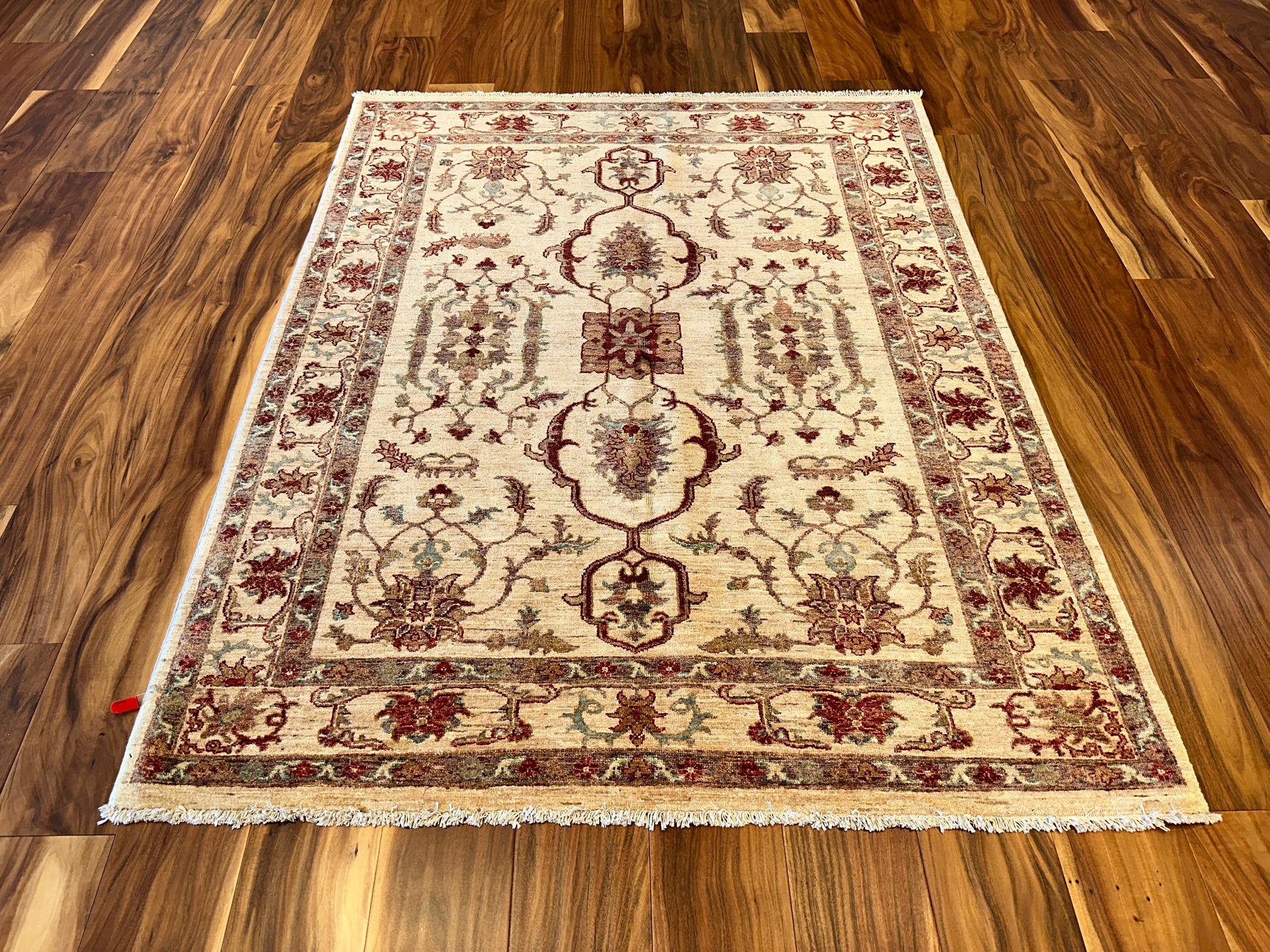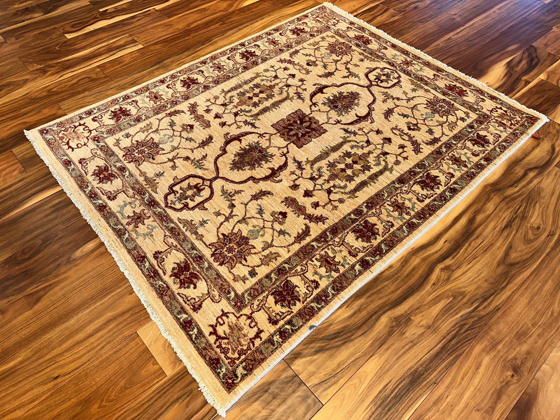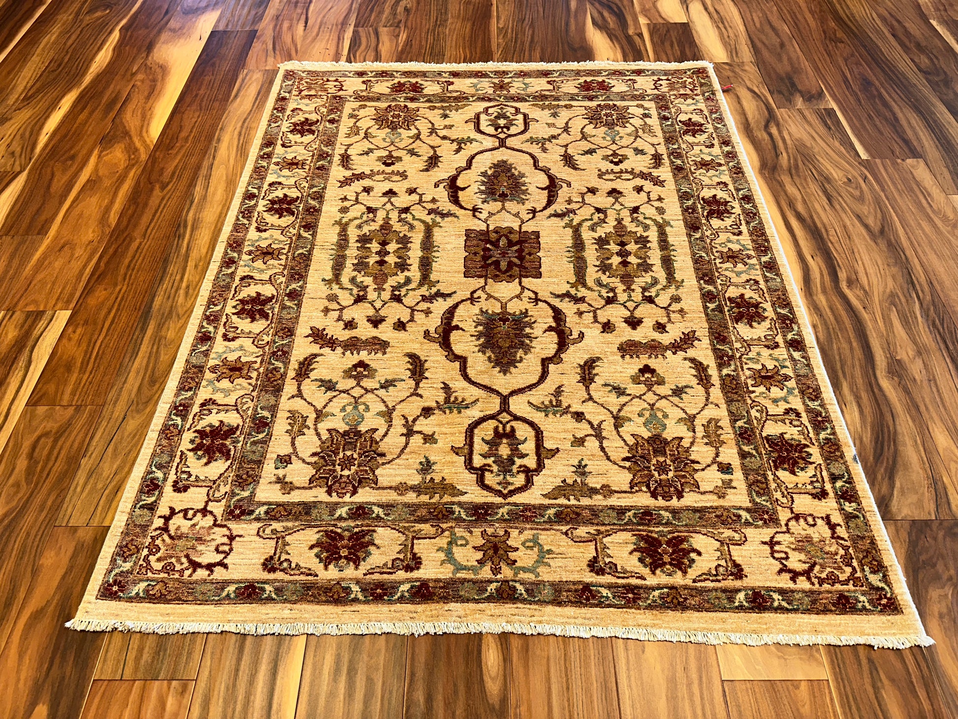 This hand-knotted wool rug presents a softly structured design with a refined central medallion, scrolling floral vines, and balanced symmetry. Set against a warm beige field, the palette incorporates rich burgundy, sage green, and muted gold to create a traditional yet tranquil aesthetic. The detailed border echoes the inner motifs with harmonious repetition, lending timeless elegance to the piece.