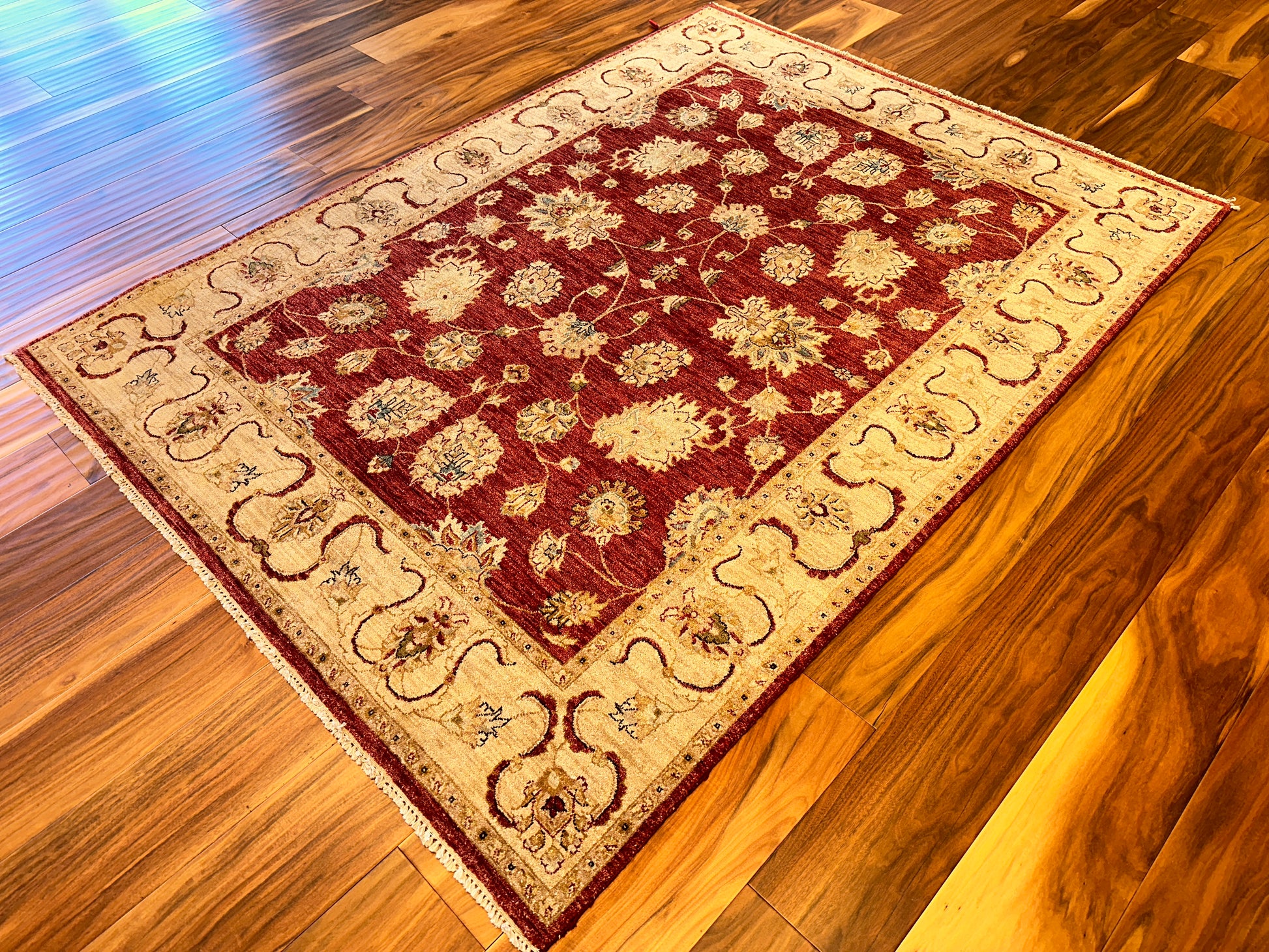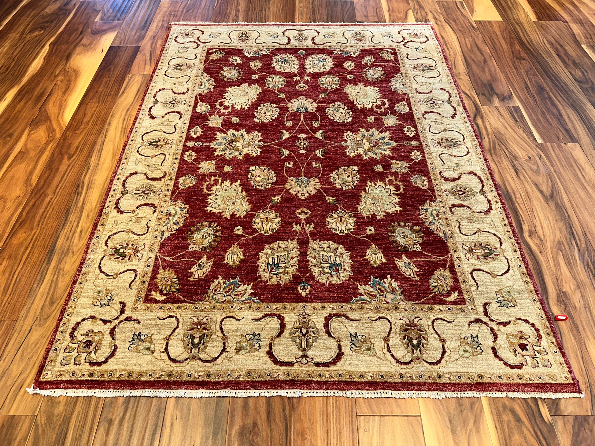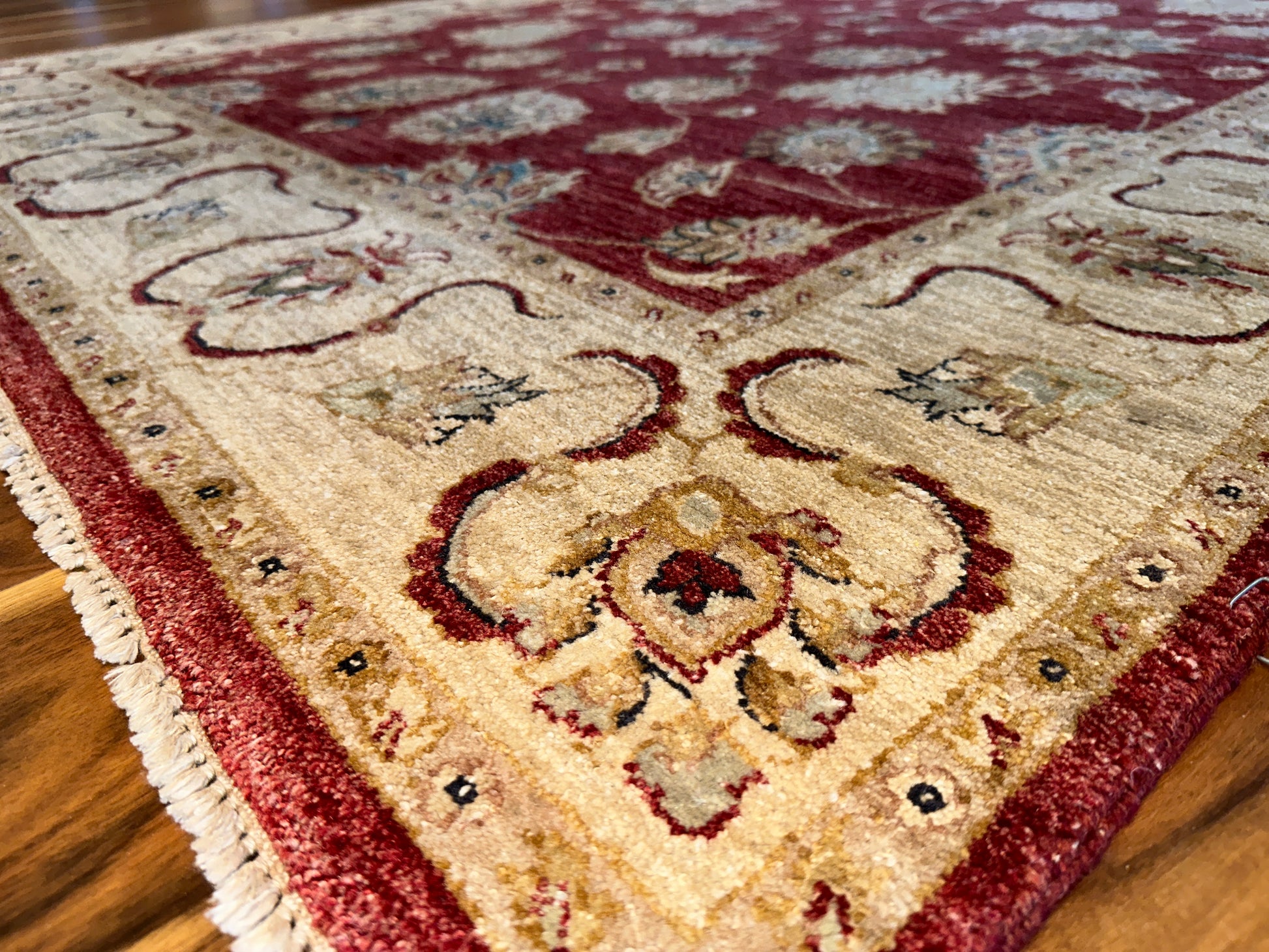 A regal palette of deep red and soft beige sets the tone for this classically inspired hand-knotted rug, where stylized floral motifs bloom in symmetrical balance across the field. The pale border with delicate scrolling vines lends contrast and refinement, enriching the rug’s timeless elegance.