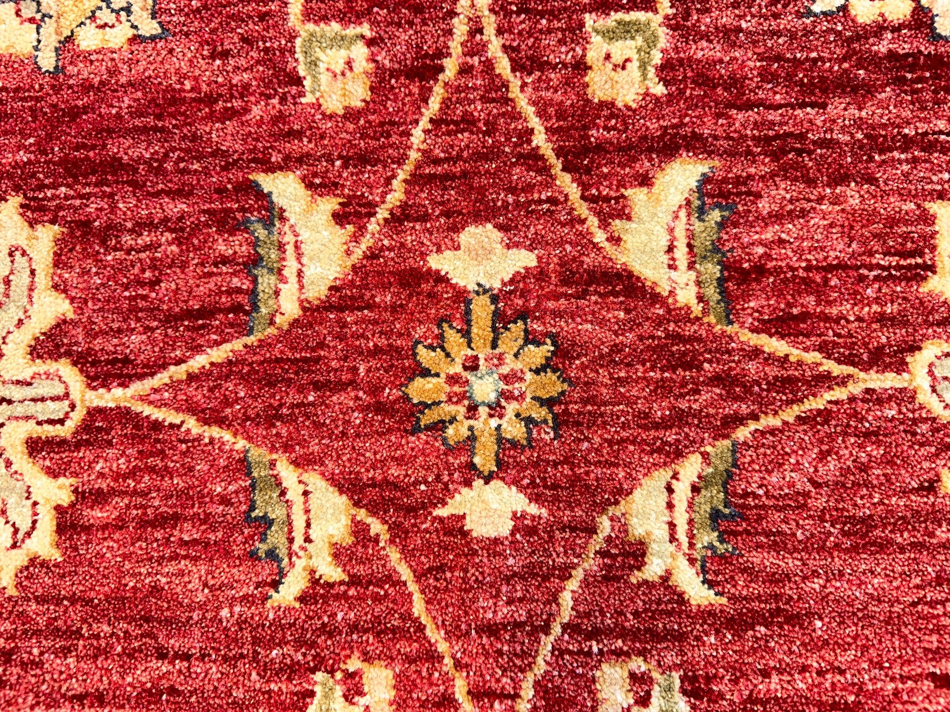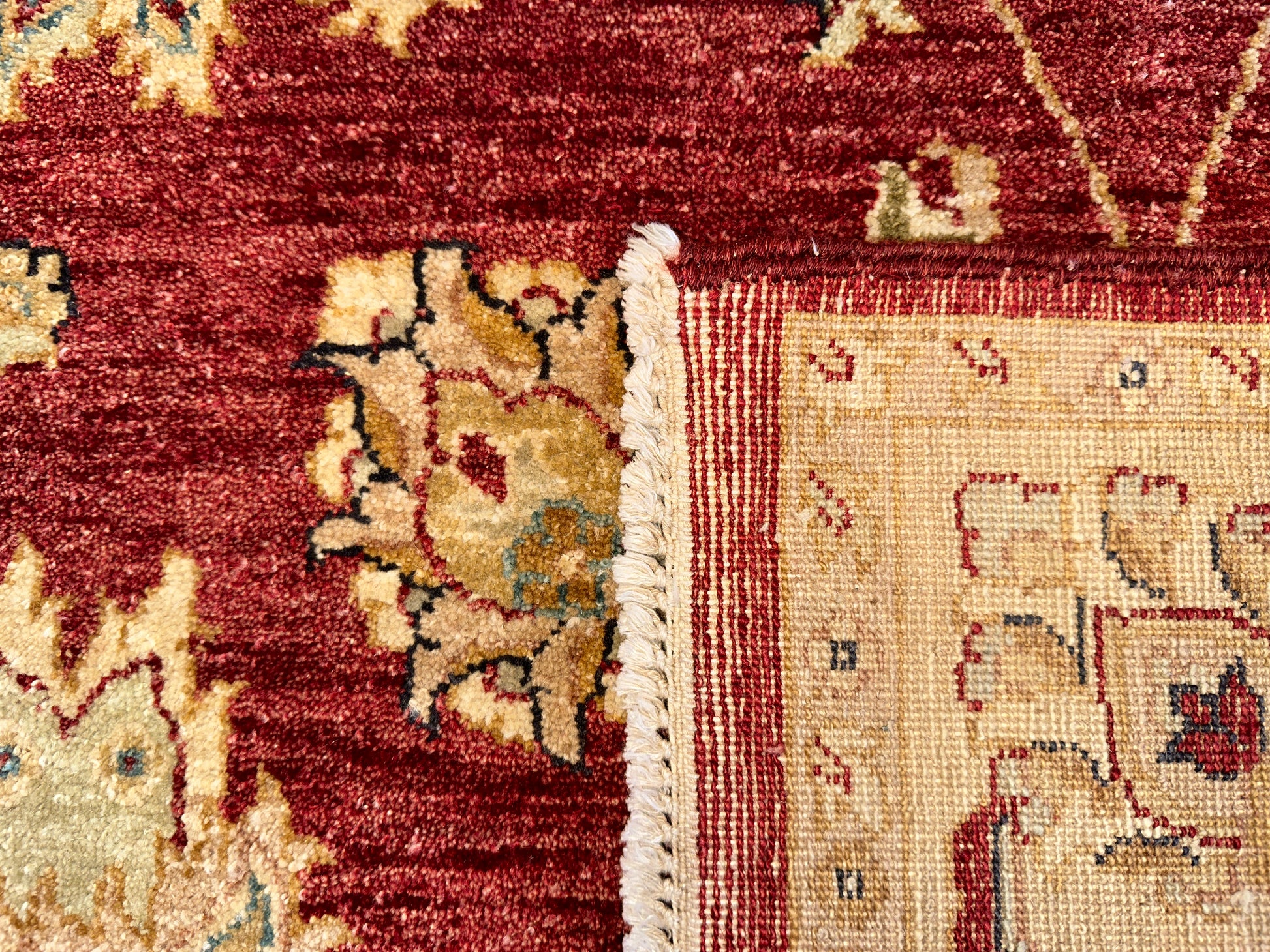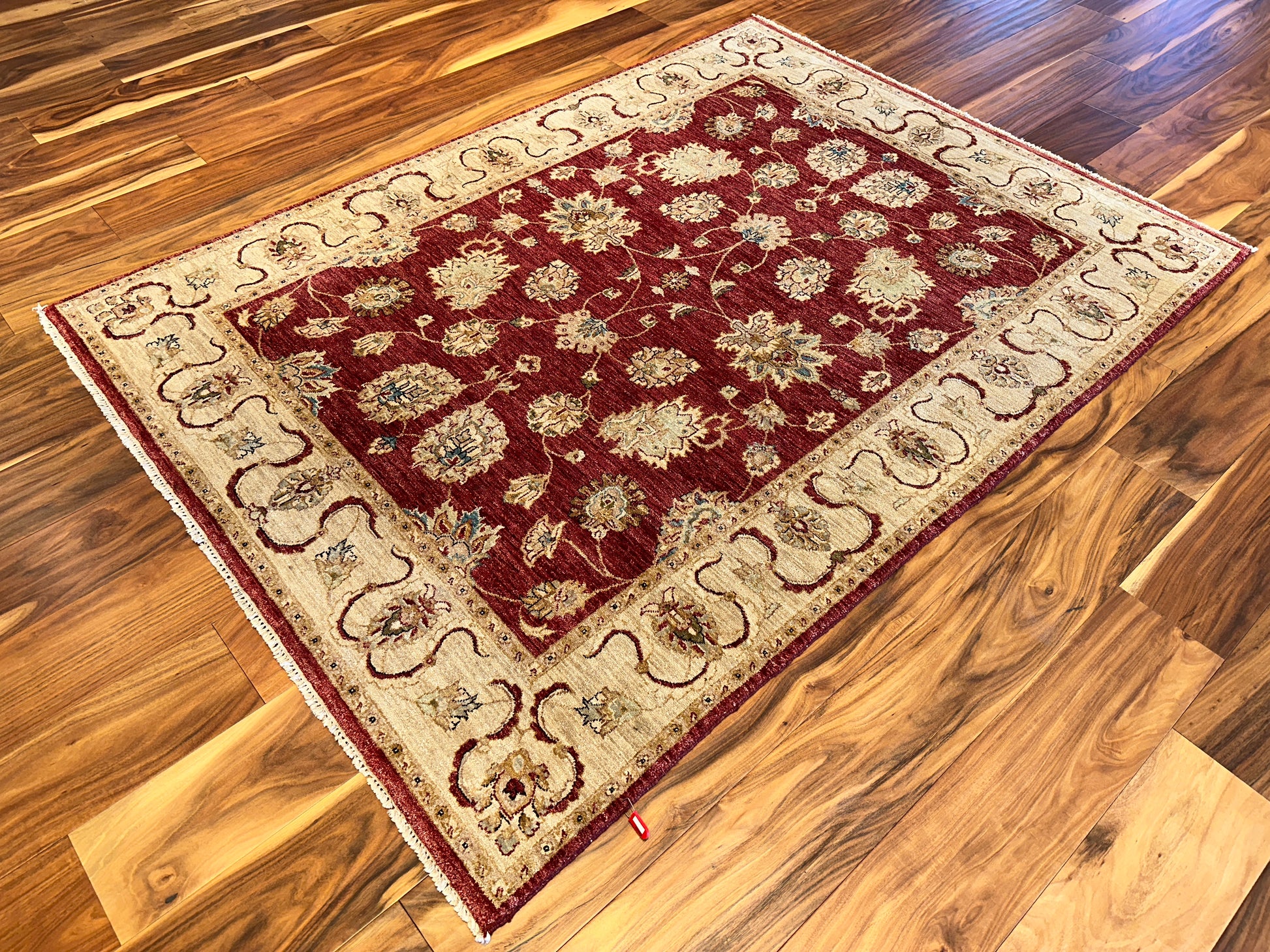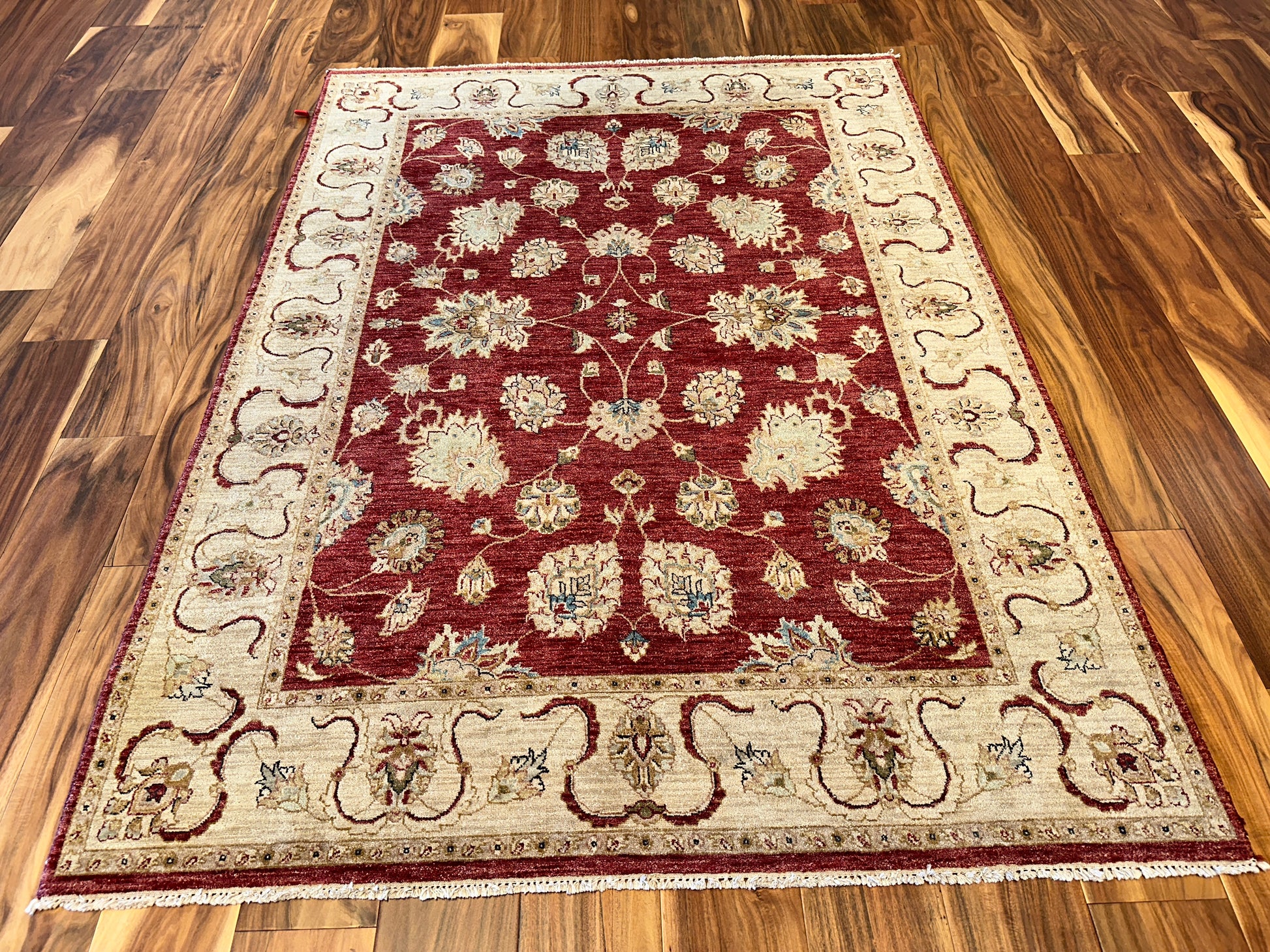 A regal palette of deep red and soft beige sets the tone for this classically inspired hand-knotted rug, where stylized floral motifs bloom in symmetrical balance across the field. The pale border with delicate scrolling vines lends contrast and refinement, enriching the rug’s timeless elegance.