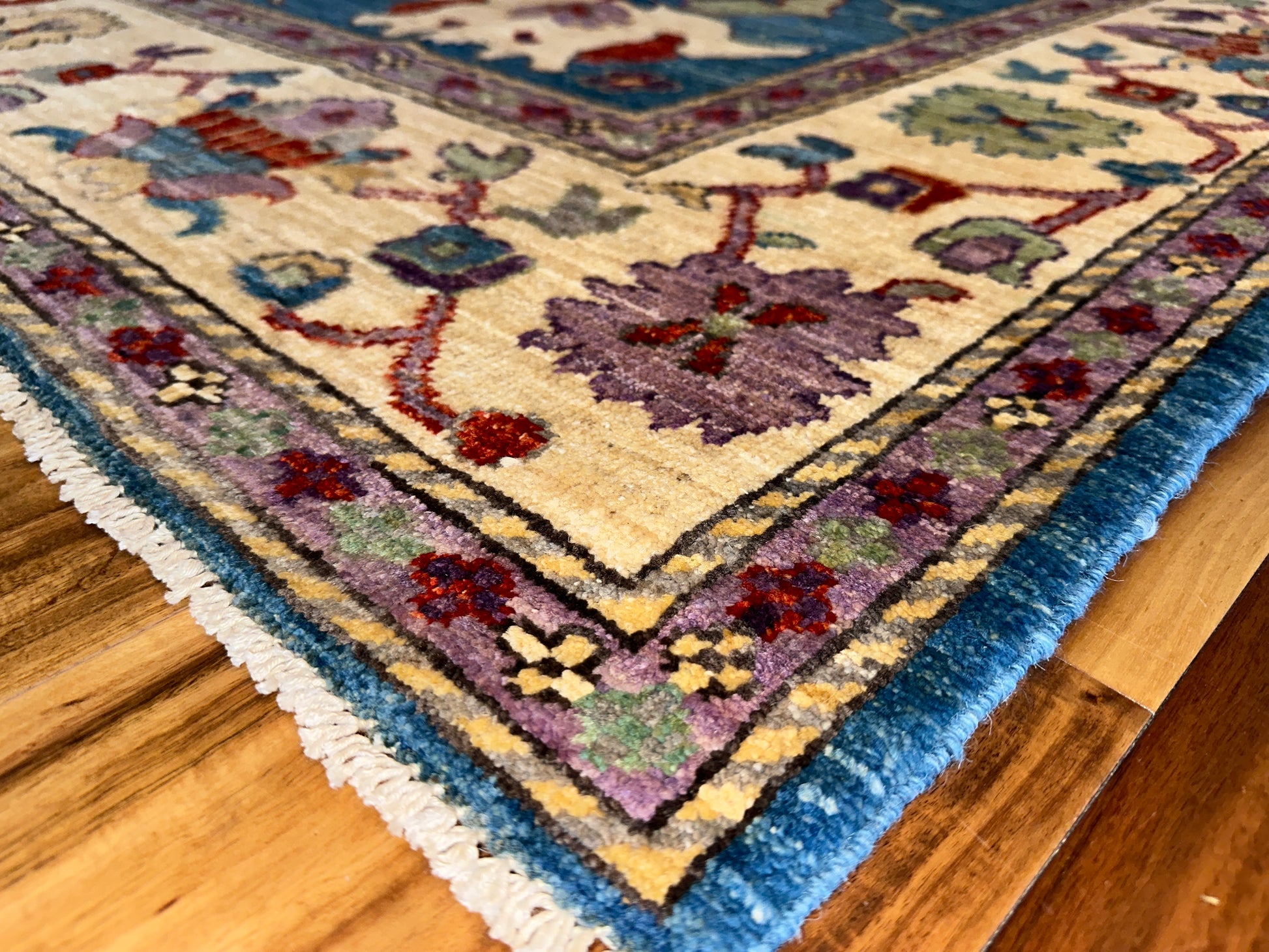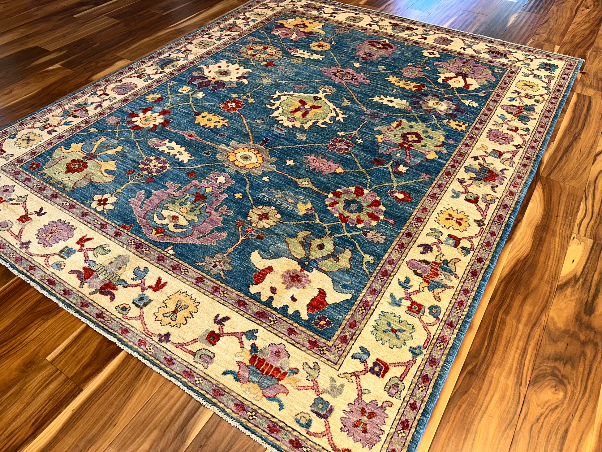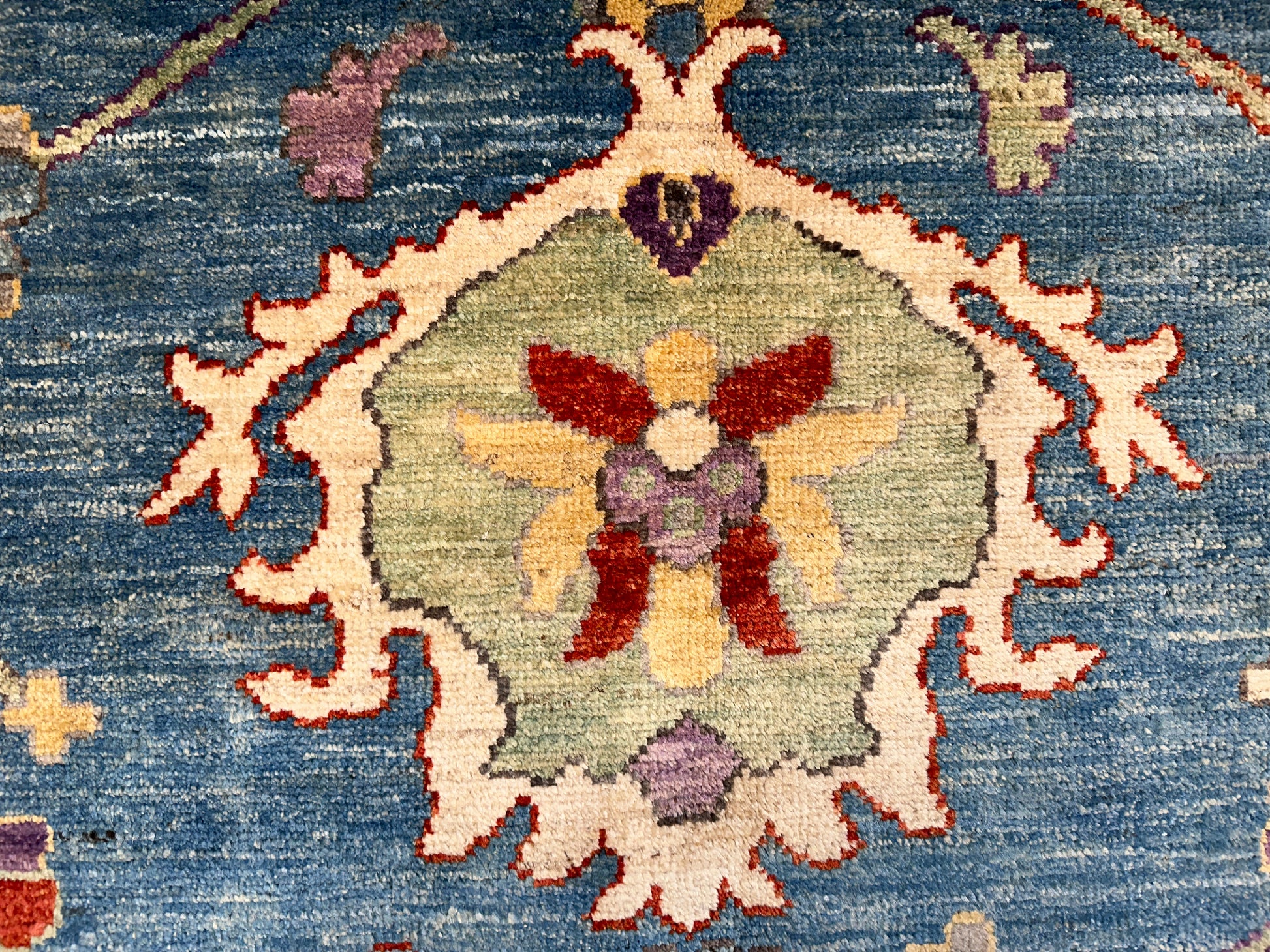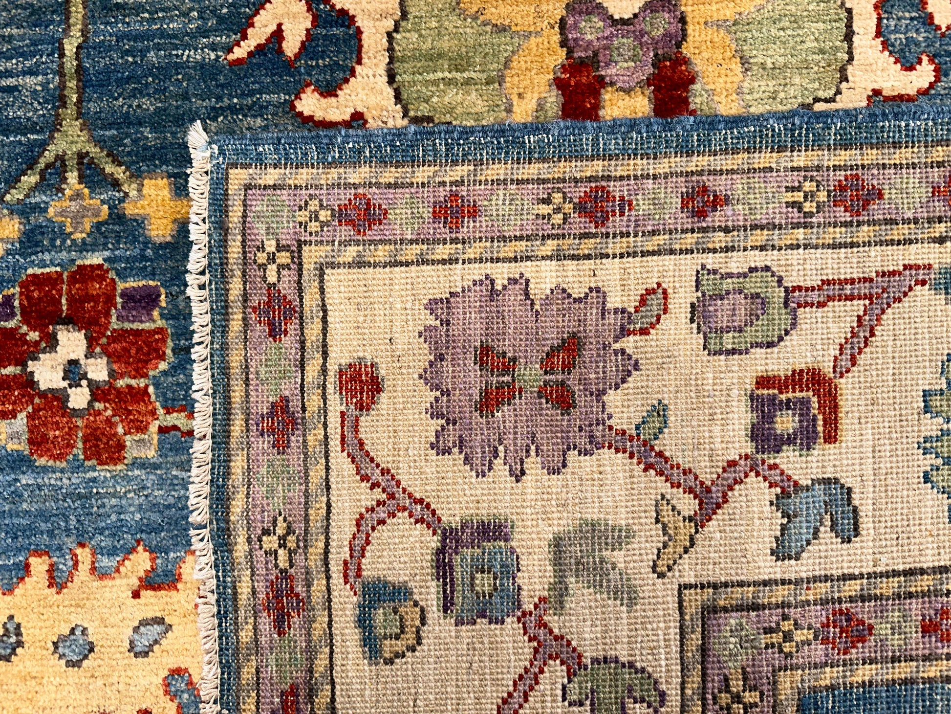 This vibrant hand-knotted rug draws the eye with its jubilant allover design in rich, painterly tones. A bright denim blue field hosts a flurry of large-scale stylized florals in warm coral, soft lilac, pale yellow, and creamy beige, all interconnected with delicate vinery. The generous cream border is adorned with playful floral motifs in matching hues, giving the rug a sense of whimsy and grace. Its colorful palette and joyful detailing make it a cheerful foundation for light-filled interiors.