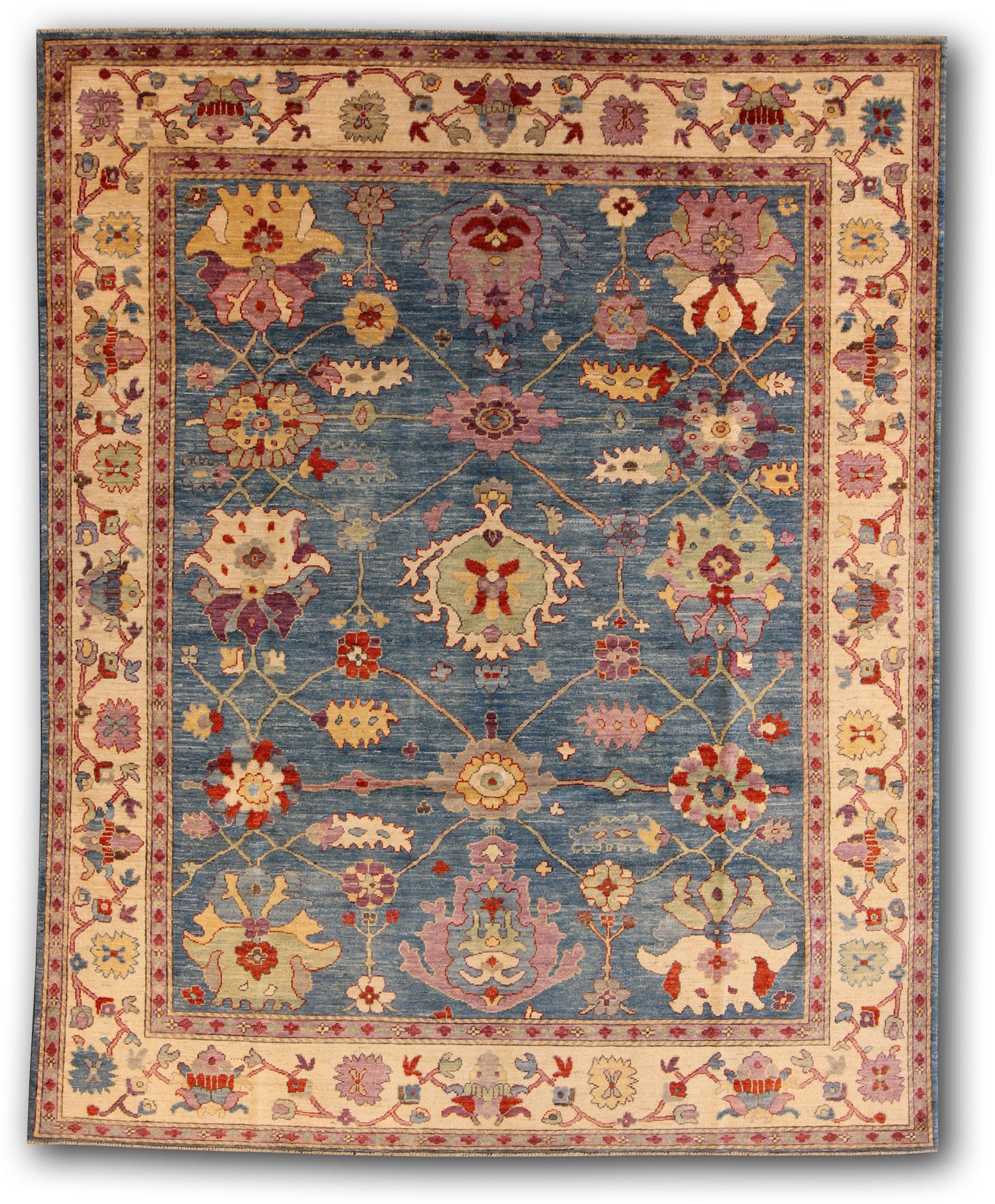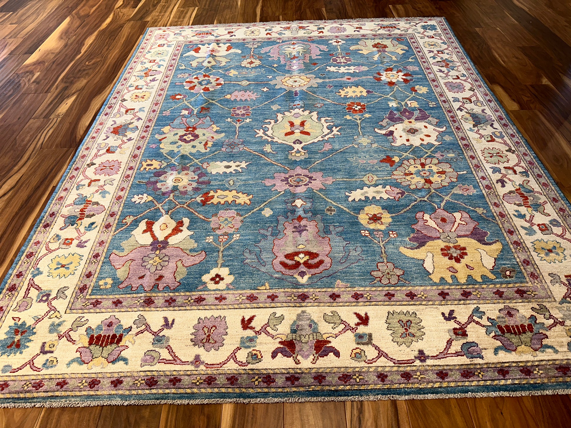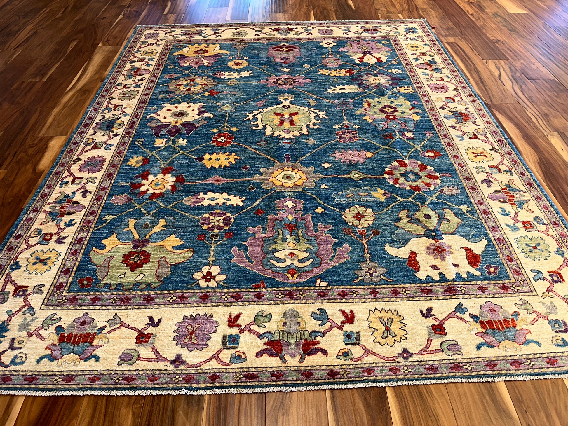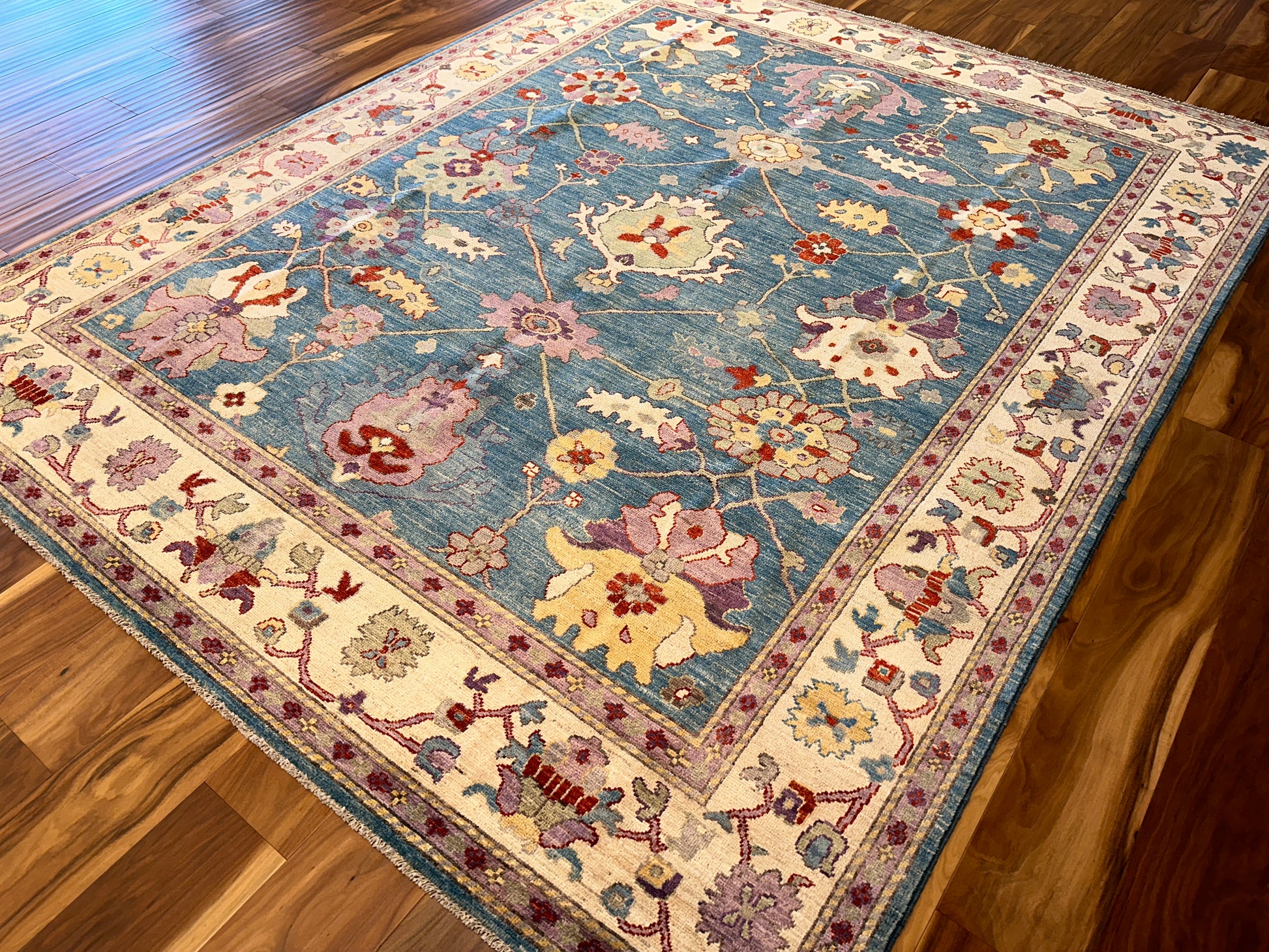 This vibrant hand-knotted rug draws the eye with its jubilant allover design in rich, painterly tones. A bright denim blue field hosts a flurry of large-scale stylized florals in warm coral, soft lilac, pale yellow, and creamy beige, all interconnected with delicate vinery. The generous cream border is adorned with playful floral motifs in matching hues, giving the rug a sense of whimsy and grace. Its colorful palette and joyful detailing make it a cheerful foundation for light-filled interiors.