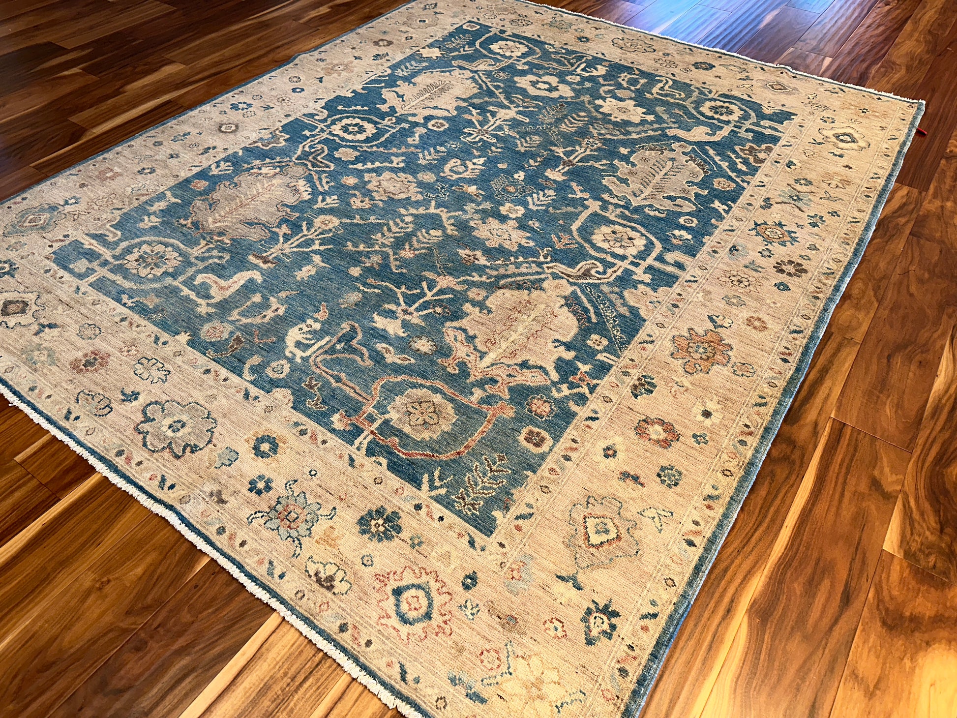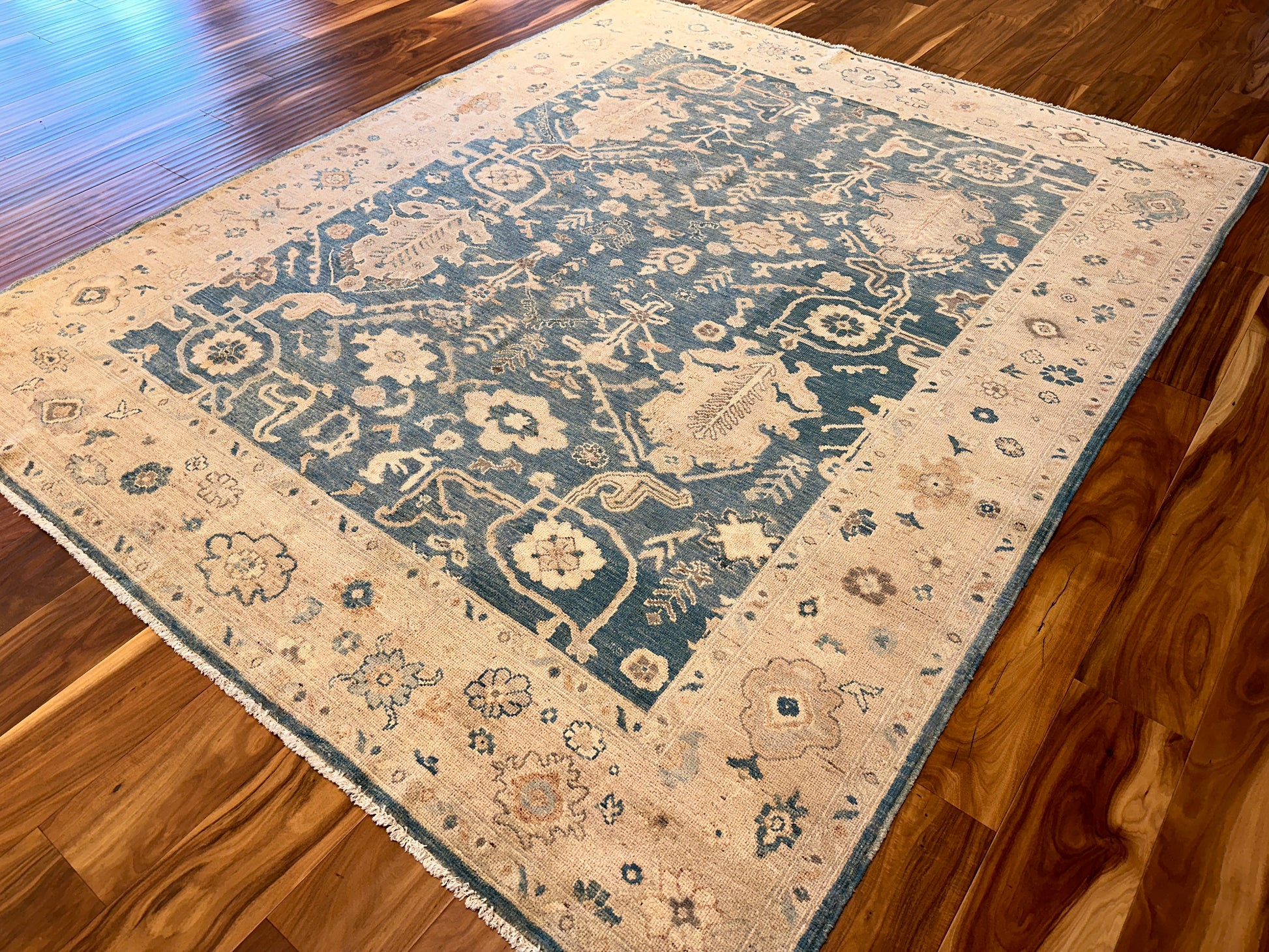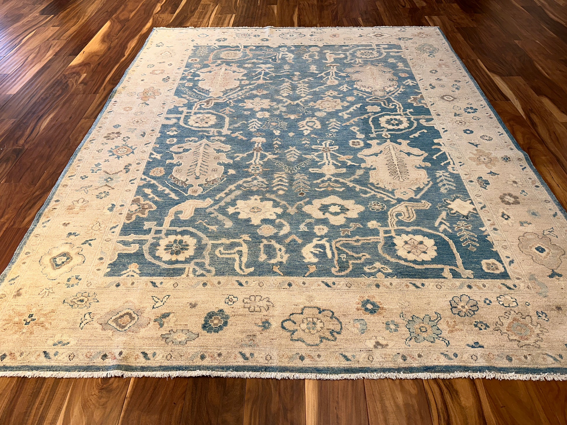 Soft and spacious, this hand-knotted wool rug features a relaxed Oushak design with large-scale floral motifs drifting across a washed blue field. The pale beige border offers gentle contrast, framing the pattern with calm balance. Subtle variations in tone lend the piece a timeworn elegance that enhances its inviting, lived-in charm.