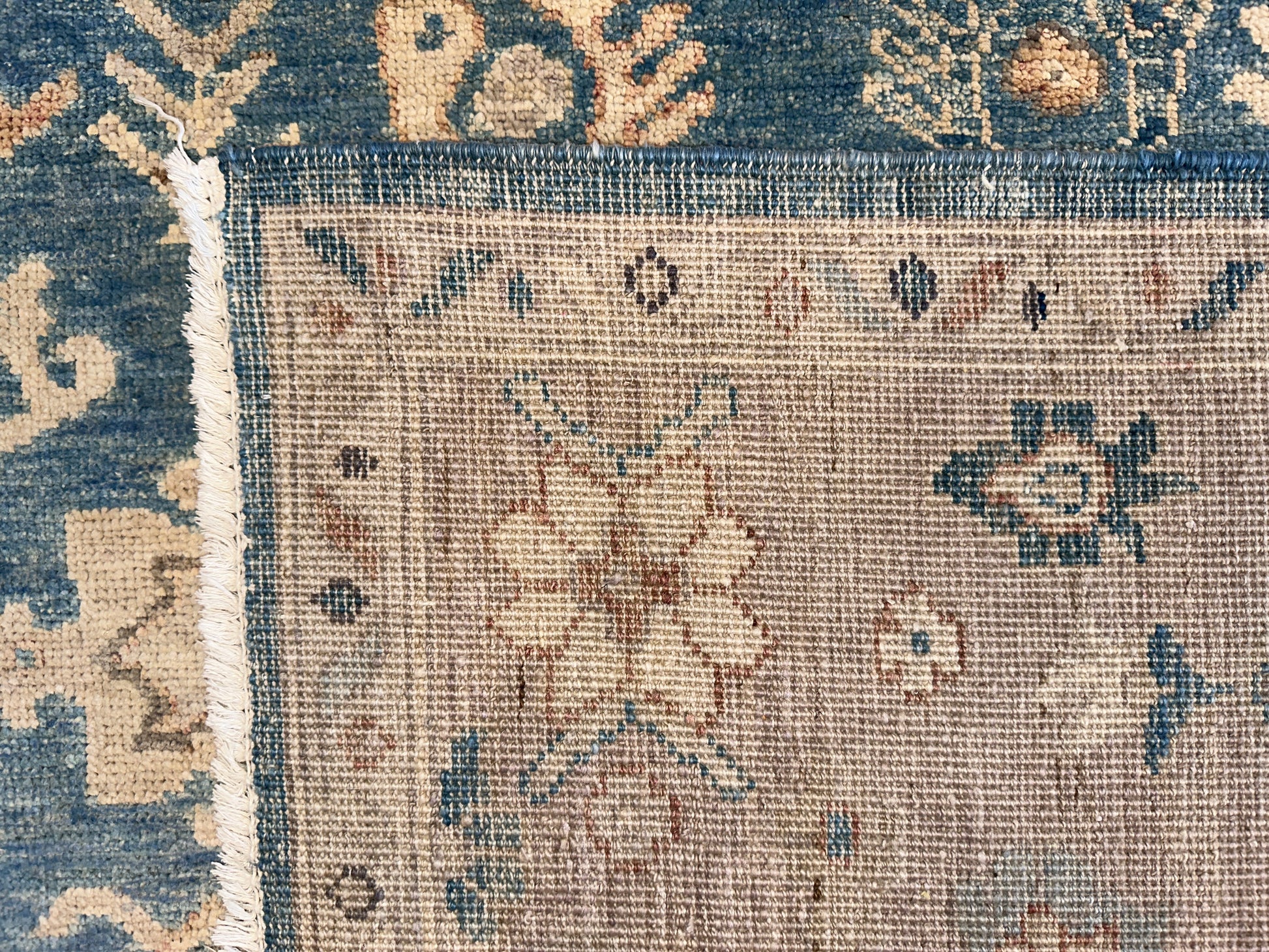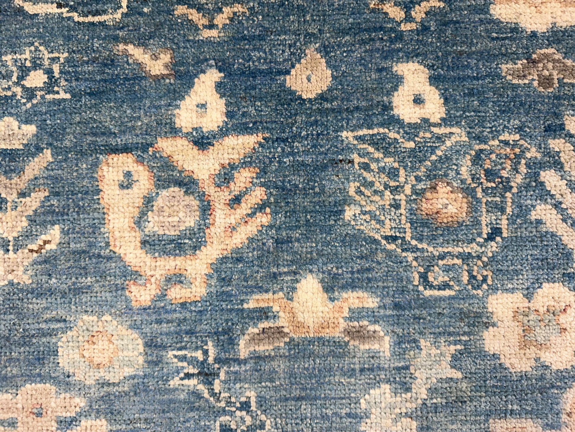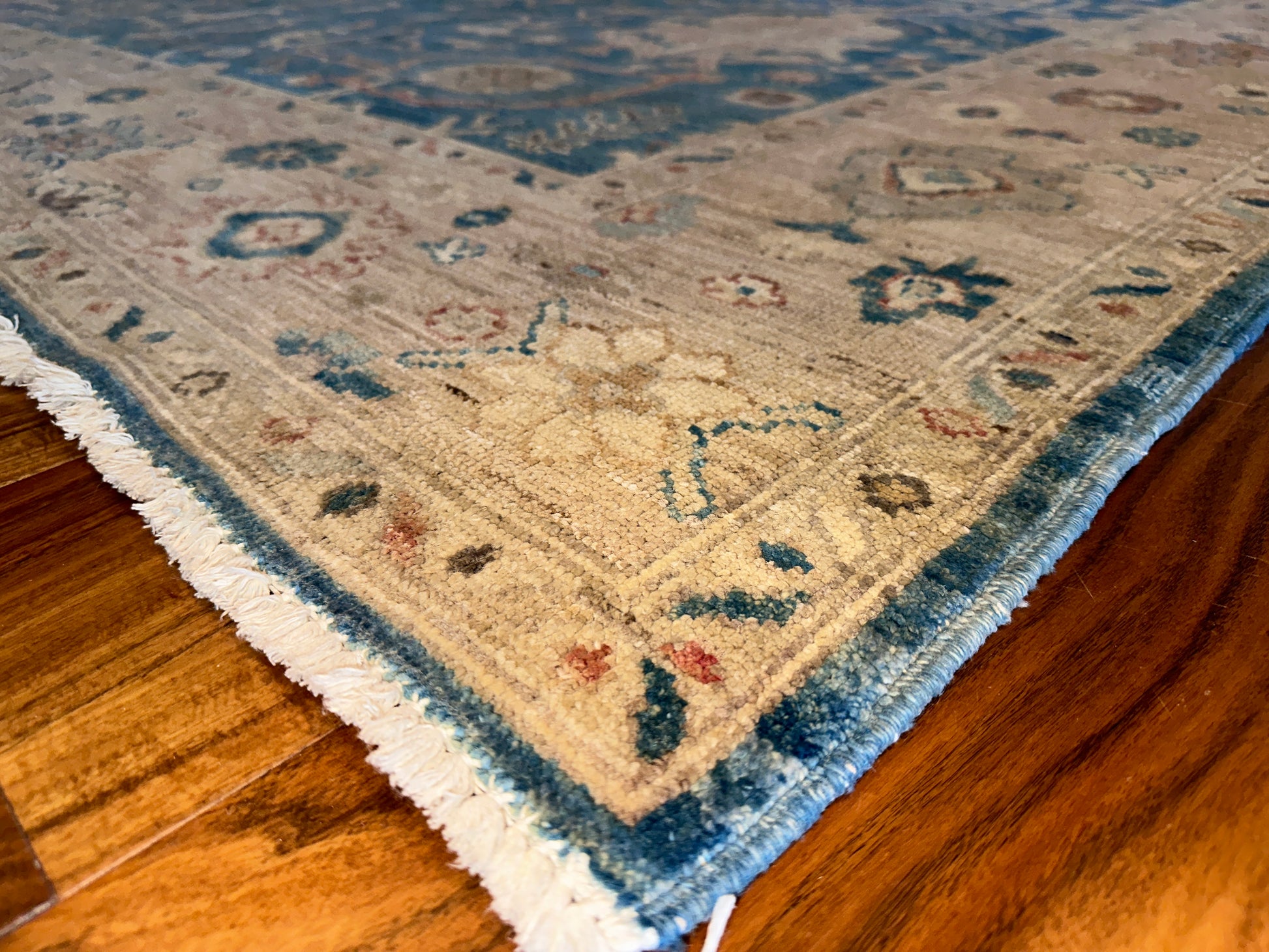 Soft and spacious, this hand-knotted wool rug features a relaxed Oushak design with large-scale floral motifs drifting across a washed blue field. The pale beige border offers gentle contrast, framing the pattern with calm balance. Subtle variations in tone lend the piece a timeworn elegance that enhances its inviting, lived-in charm.