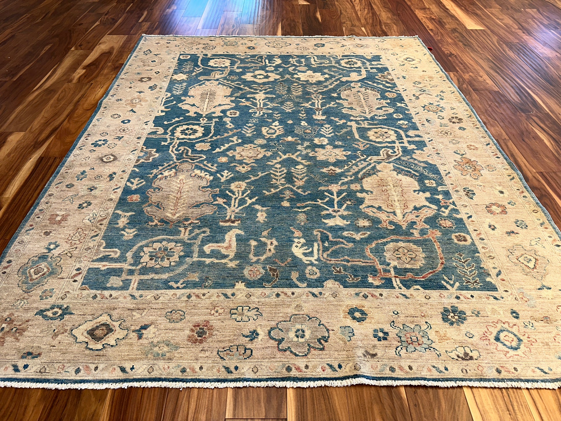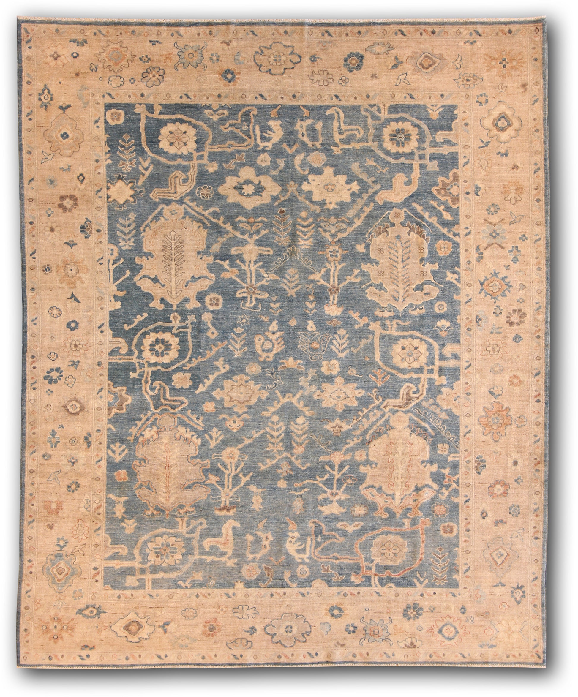 - Design: Open Oushak with oversized palmettes and stylized vines