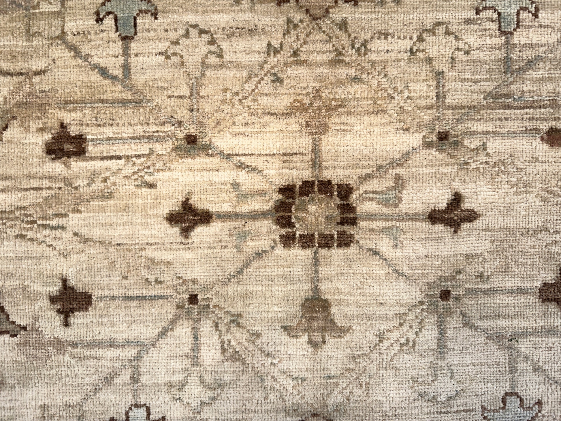 This hand-knotted wool rug features a bold tribal-inspired pattern softened by a gently faded palette. Large-scale geometric medallions and abstract motifs unfold across a sandy beige field, rendered in pale denim blues and soft stone tones. Its relaxed symmetry and muted colors lend a refined rustic presence with a distinctly artisanal feel.