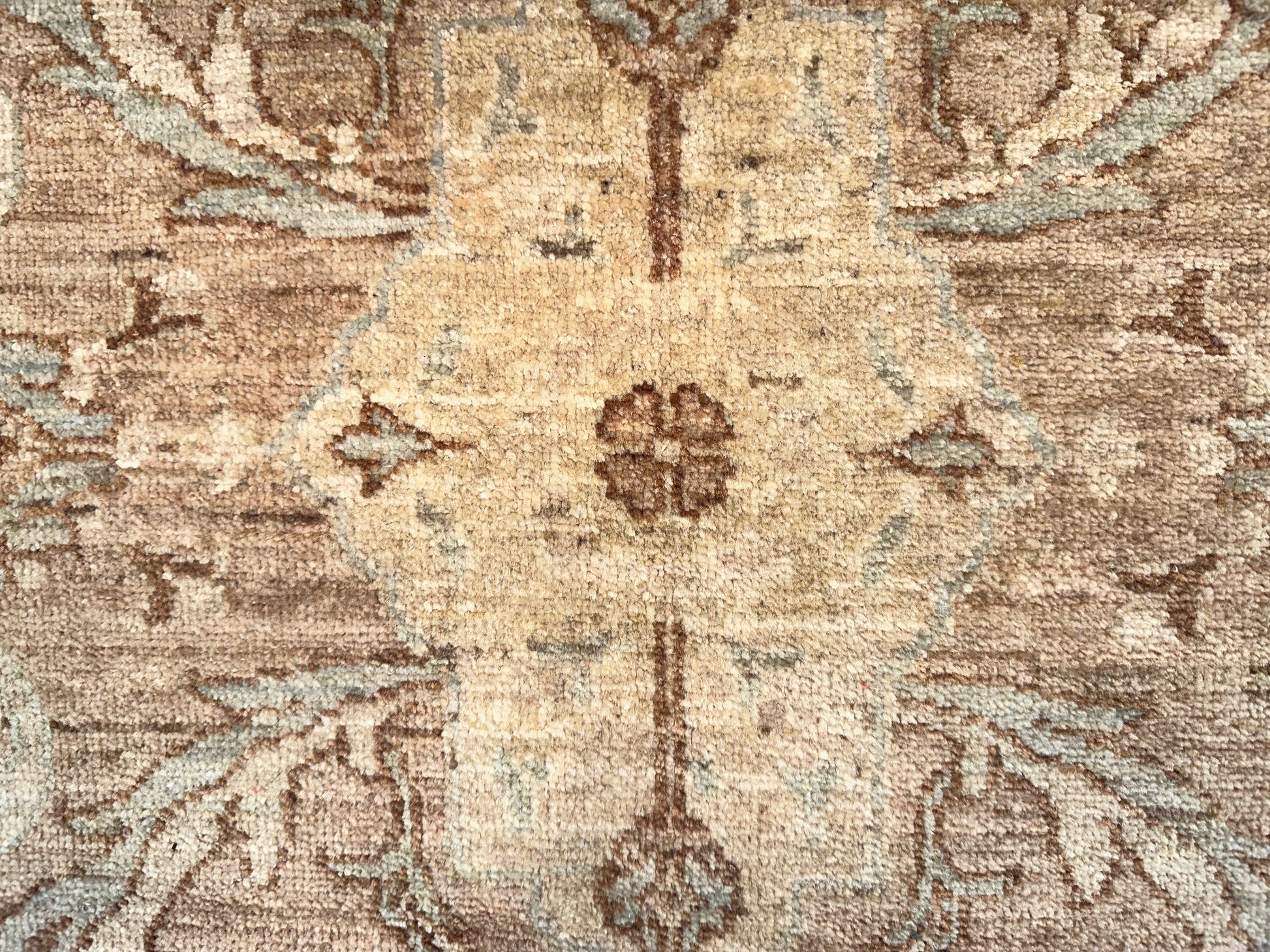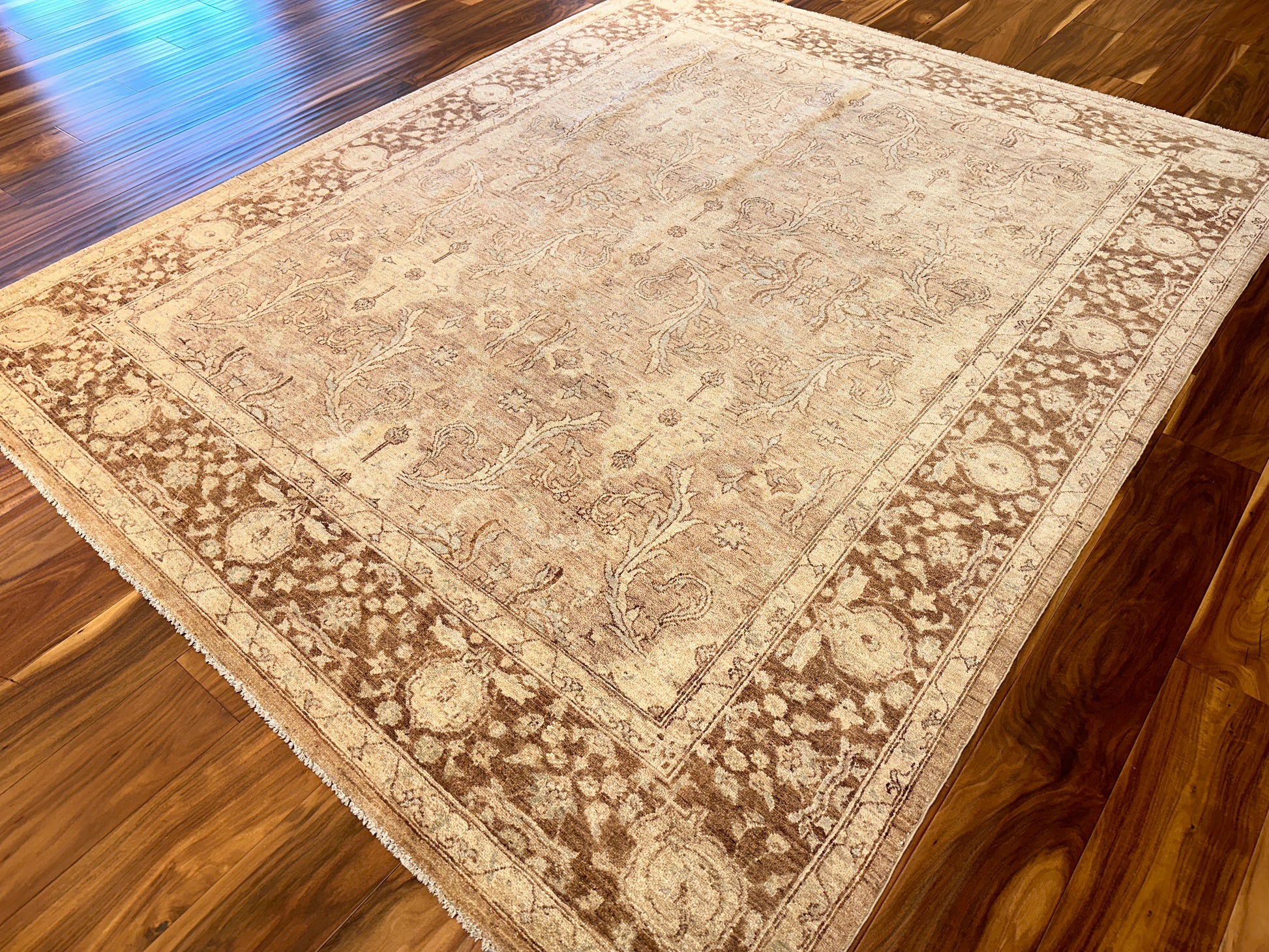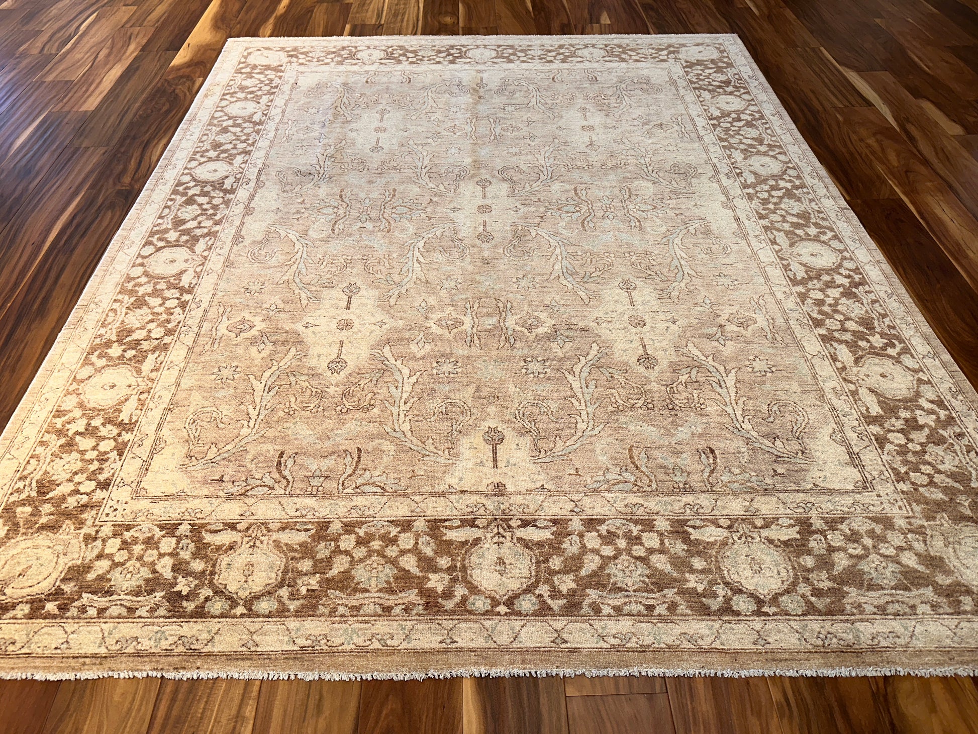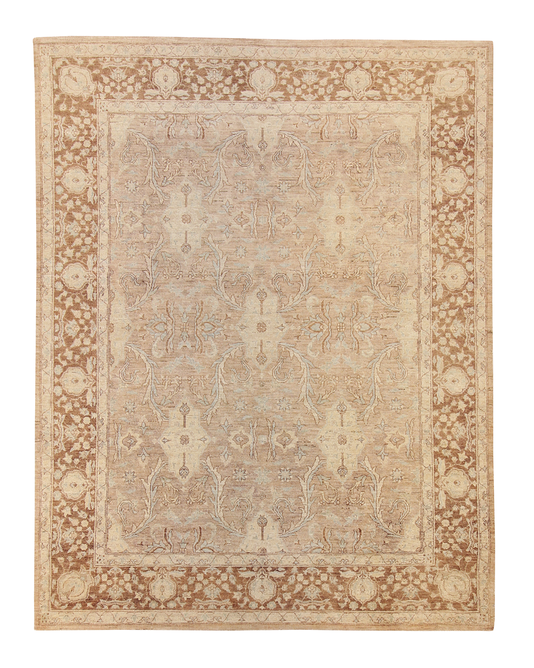 With its gentle palette of faded beige and warm sand, this rug offers a restrained take on traditional motifs. A subtle allover design flows across the field, anchored by an understated border that adds quiet definition without overt contrast. The overall tone is softened by delicate abrash, giving the rug a timeworn elegance that feels both inviting and refined.