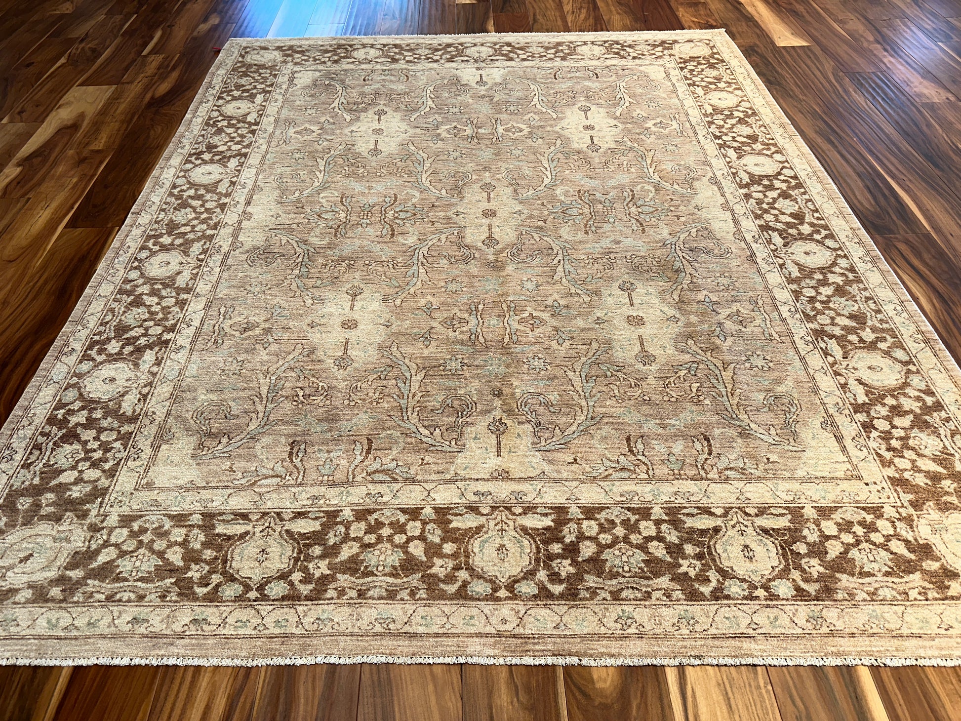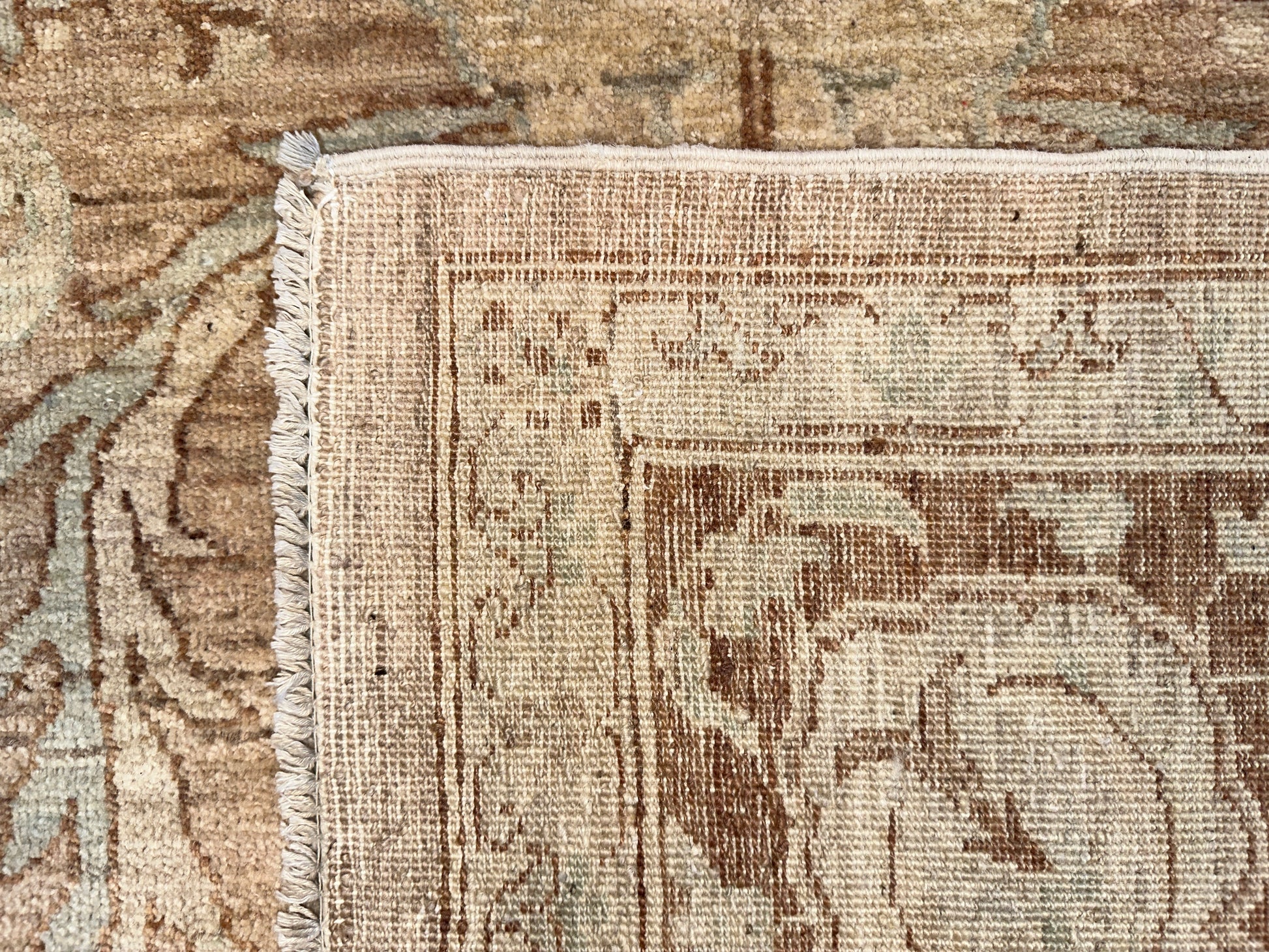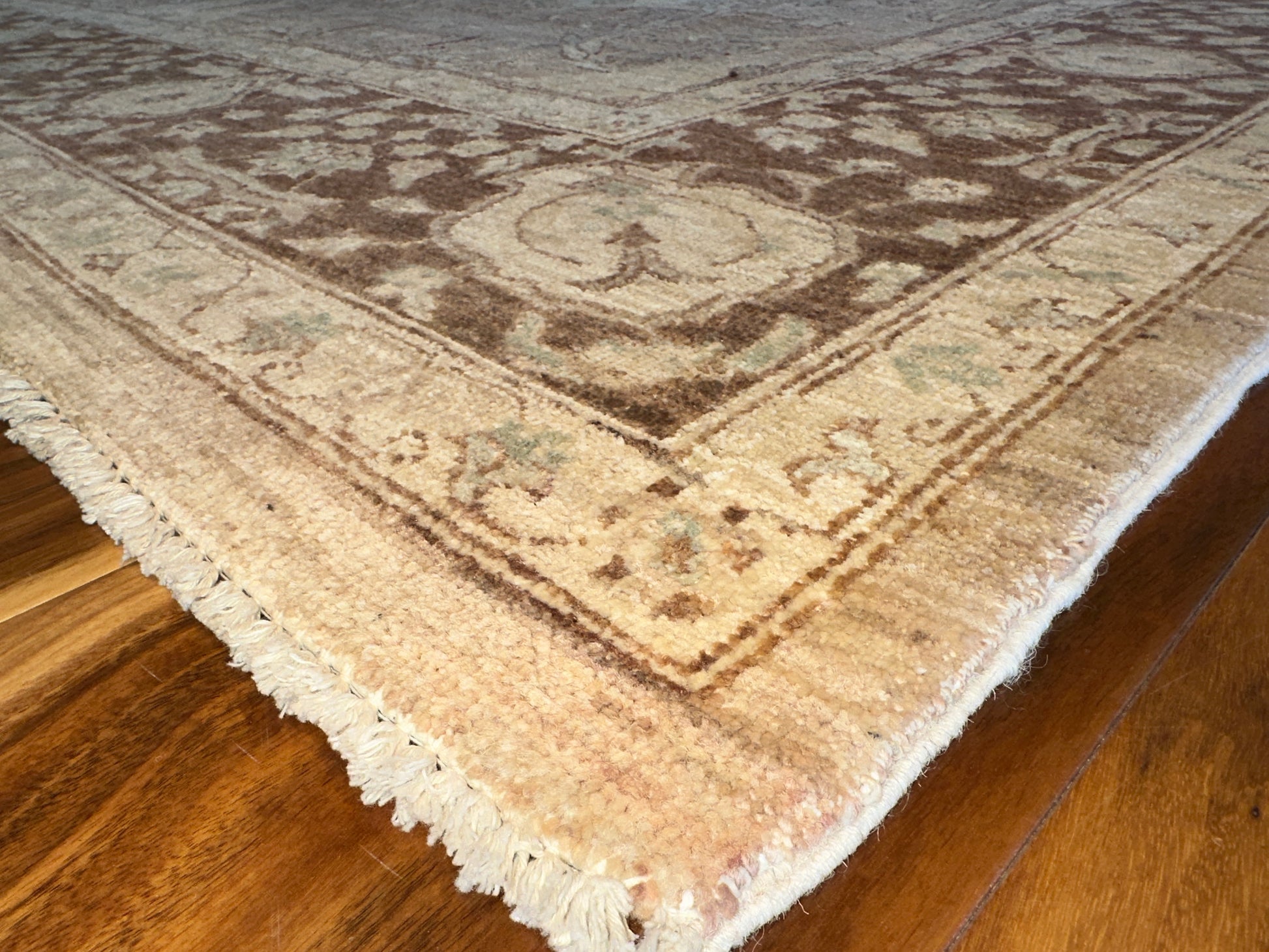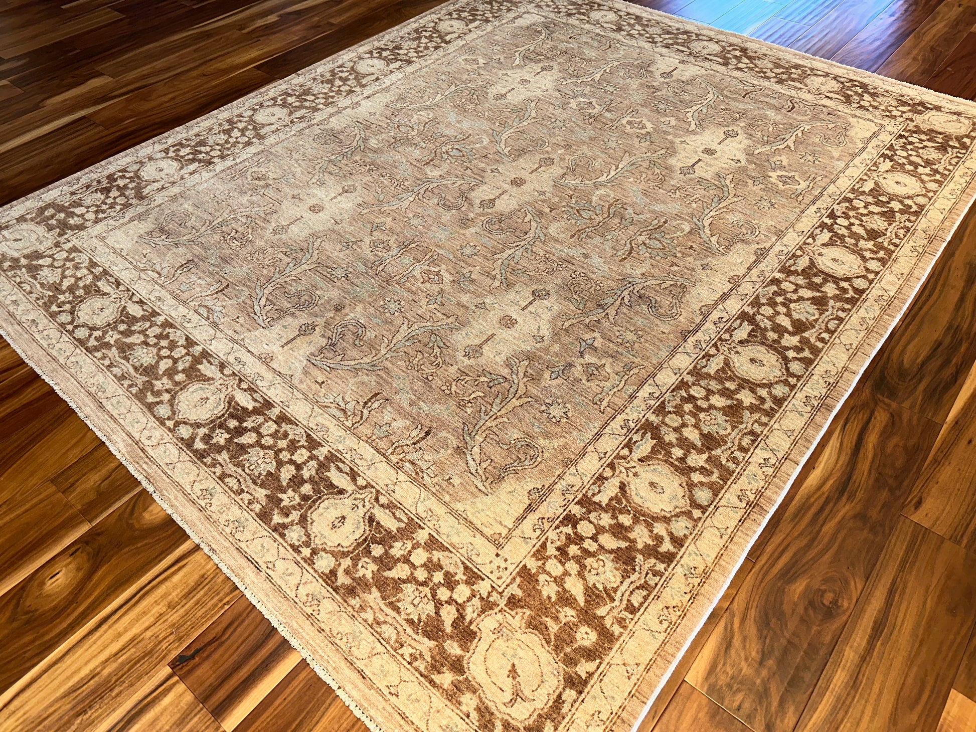 With its gentle palette of faded beige and warm sand, this rug offers a restrained take on traditional motifs. A subtle allover design flows across the field, anchored by an understated border that adds quiet definition without overt contrast. The overall tone is softened by delicate abrash, giving the rug a timeworn elegance that feels both inviting and refined.