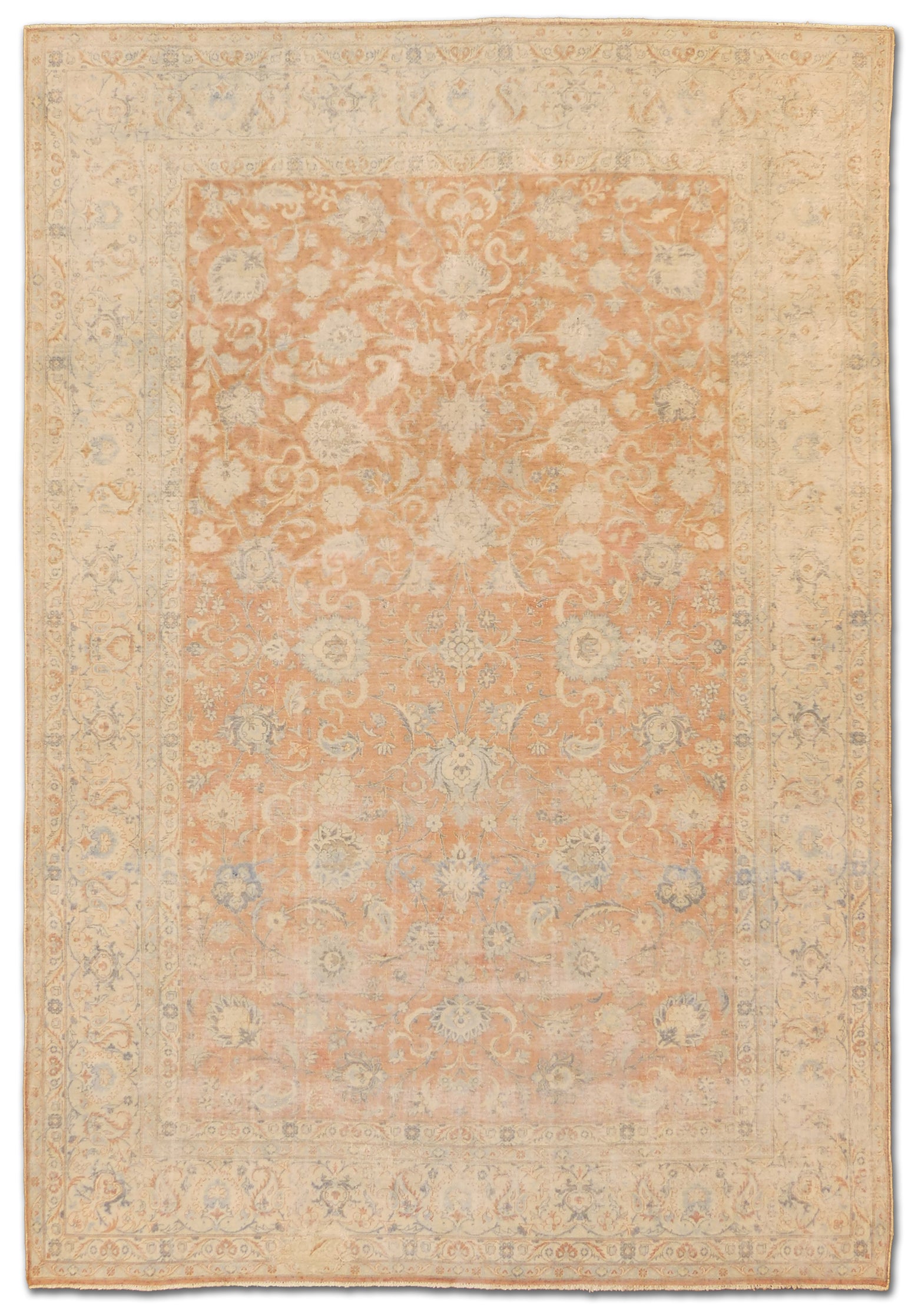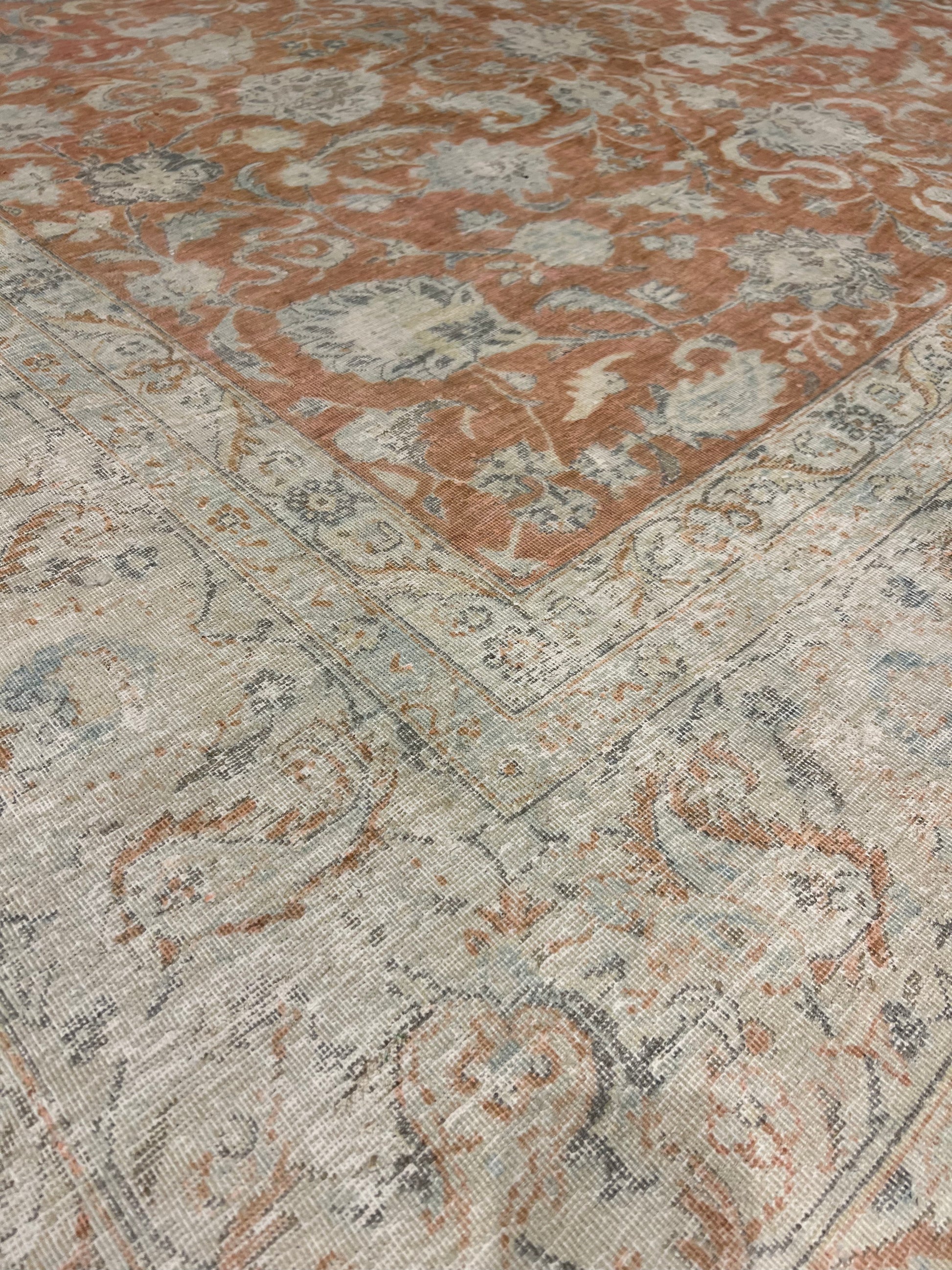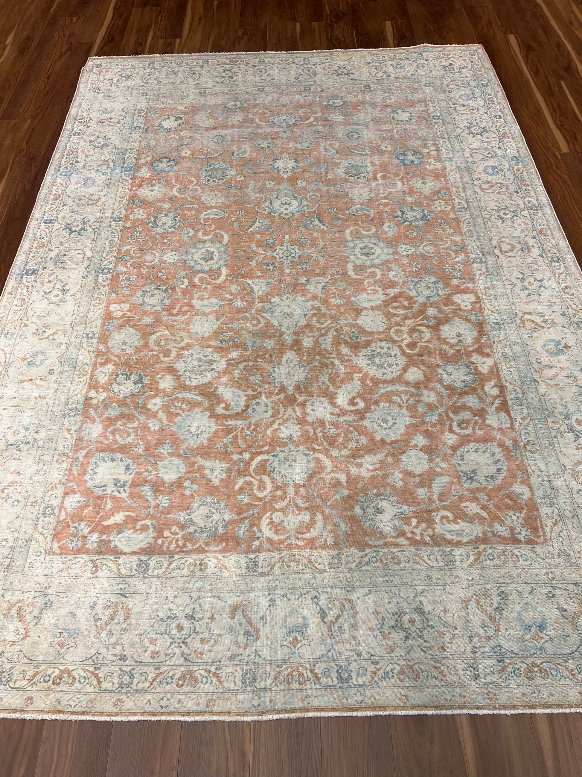 This exquisite Vintage Antique Mushtesem Keshan rug is a splendid piece of history, enlivening any room with its subtle charm. Sporting a graceful patina, it features a sophisticated floral pattern, gently muted hues and an intricate border that showcases exceptional craftsmanship. The woolen texture provides both warmth and durability, perfectly suited for a refined interior seeking a touch of antique elegance.