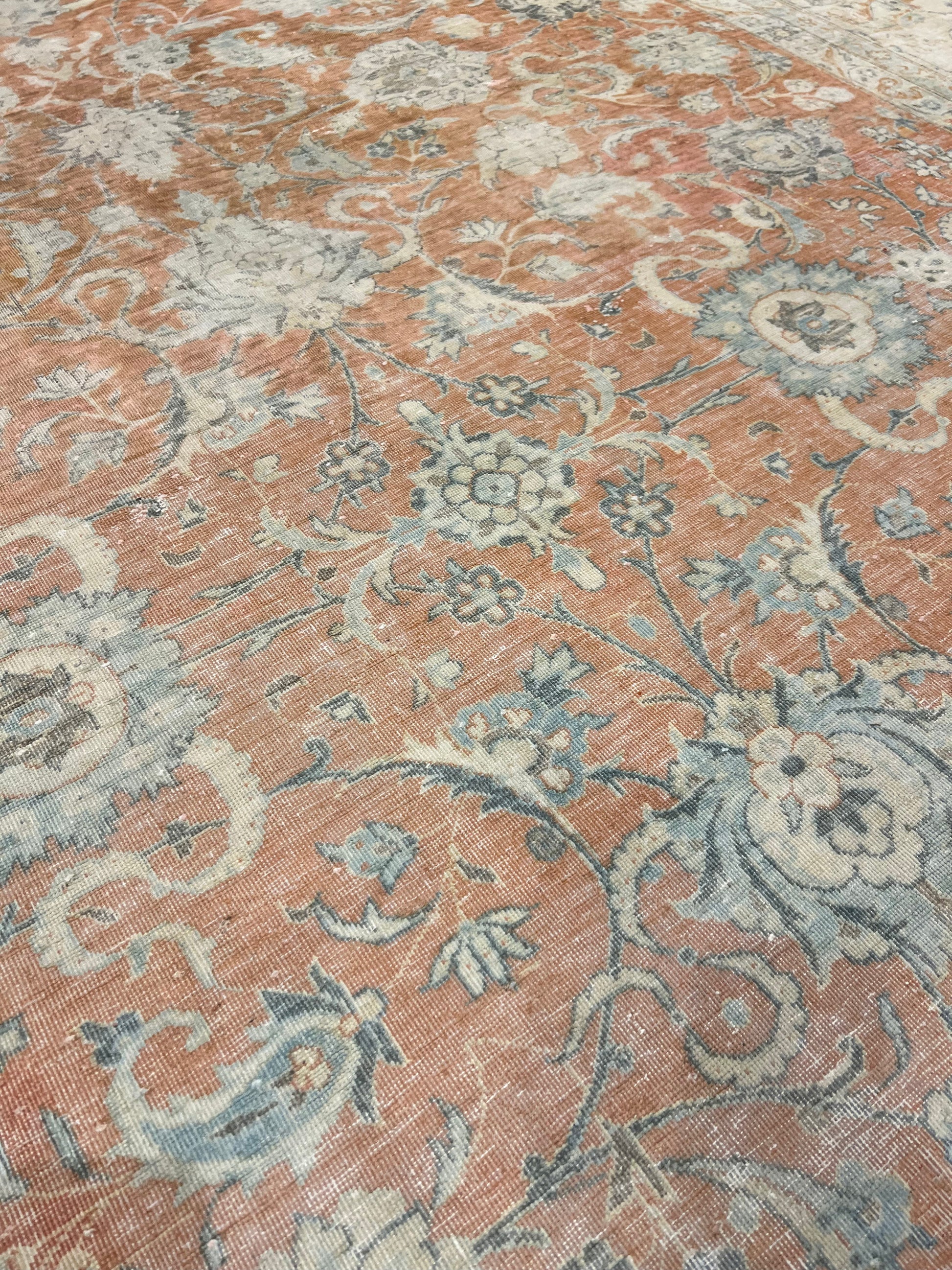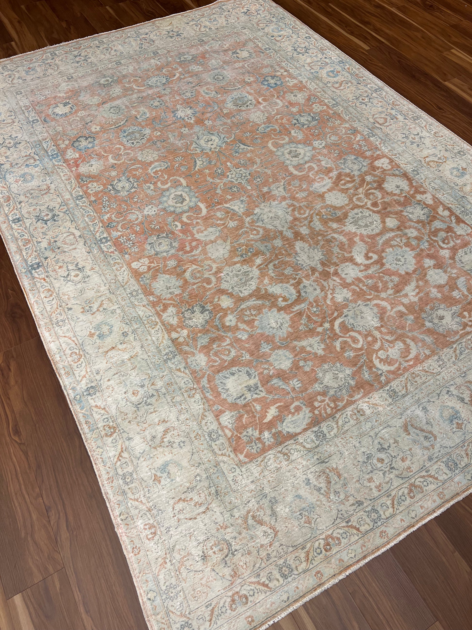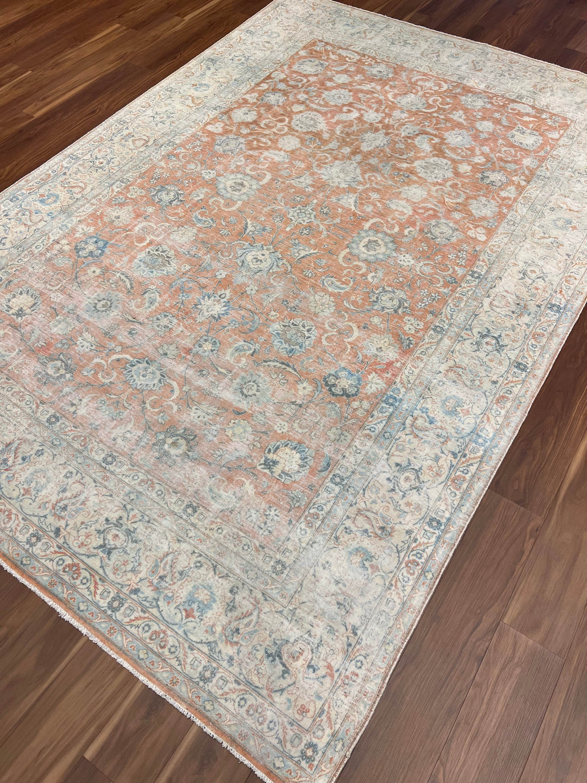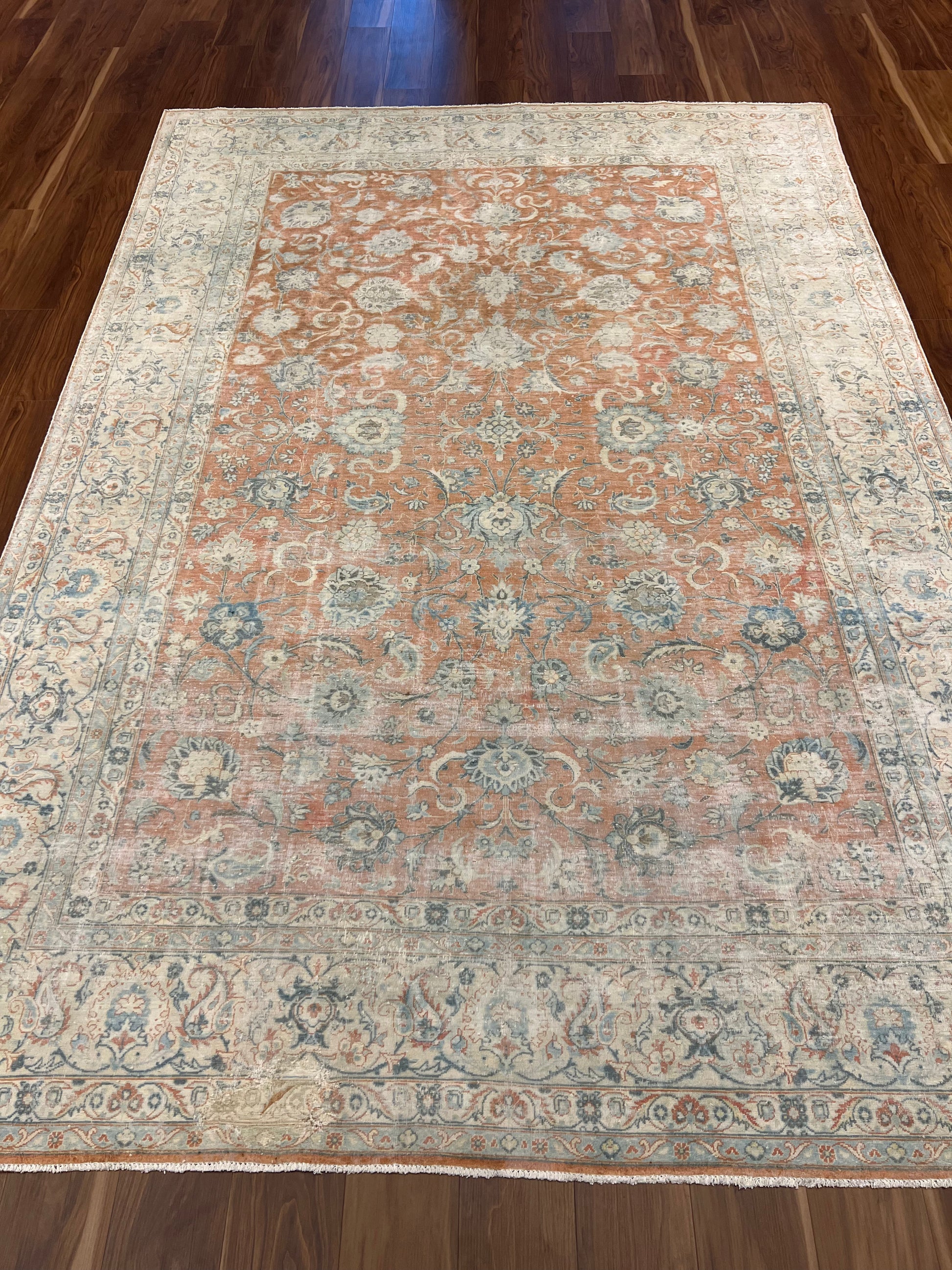 This exquisite Vintage Antique Mushtesem Keshan rug is a splendid piece of history, enlivening any room with its subtle charm. Sporting a graceful patina, it features a sophisticated floral pattern, gently muted hues and an intricate border that showcases exceptional craftsmanship. The woolen texture provides both warmth and durability, perfectly suited for a refined interior seeking a touch of antique elegance.