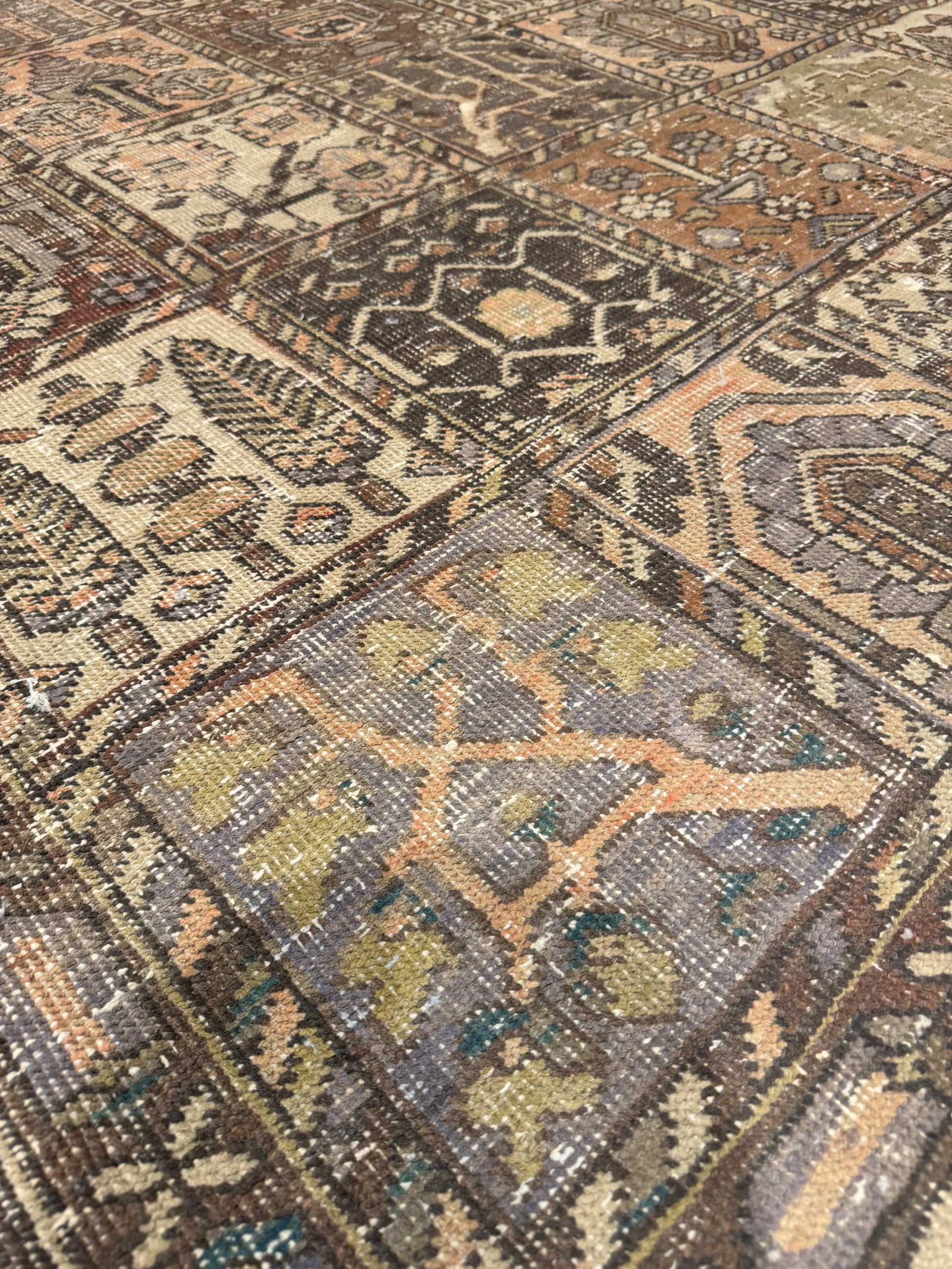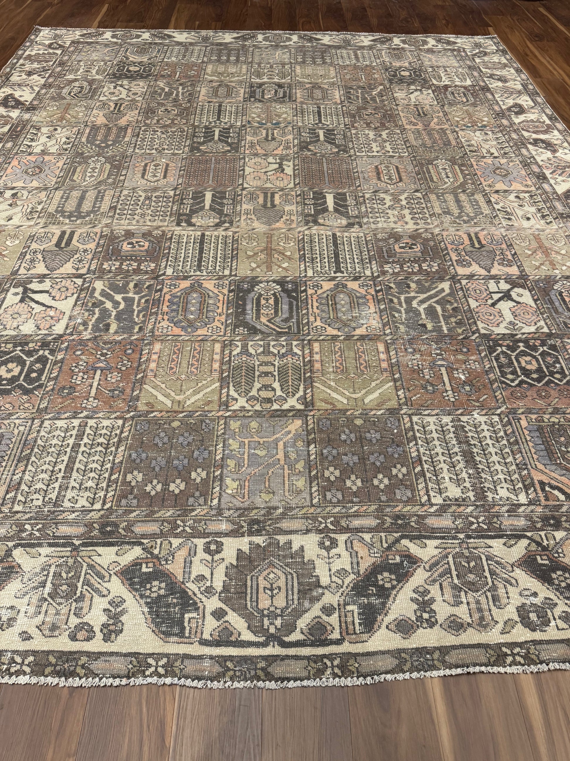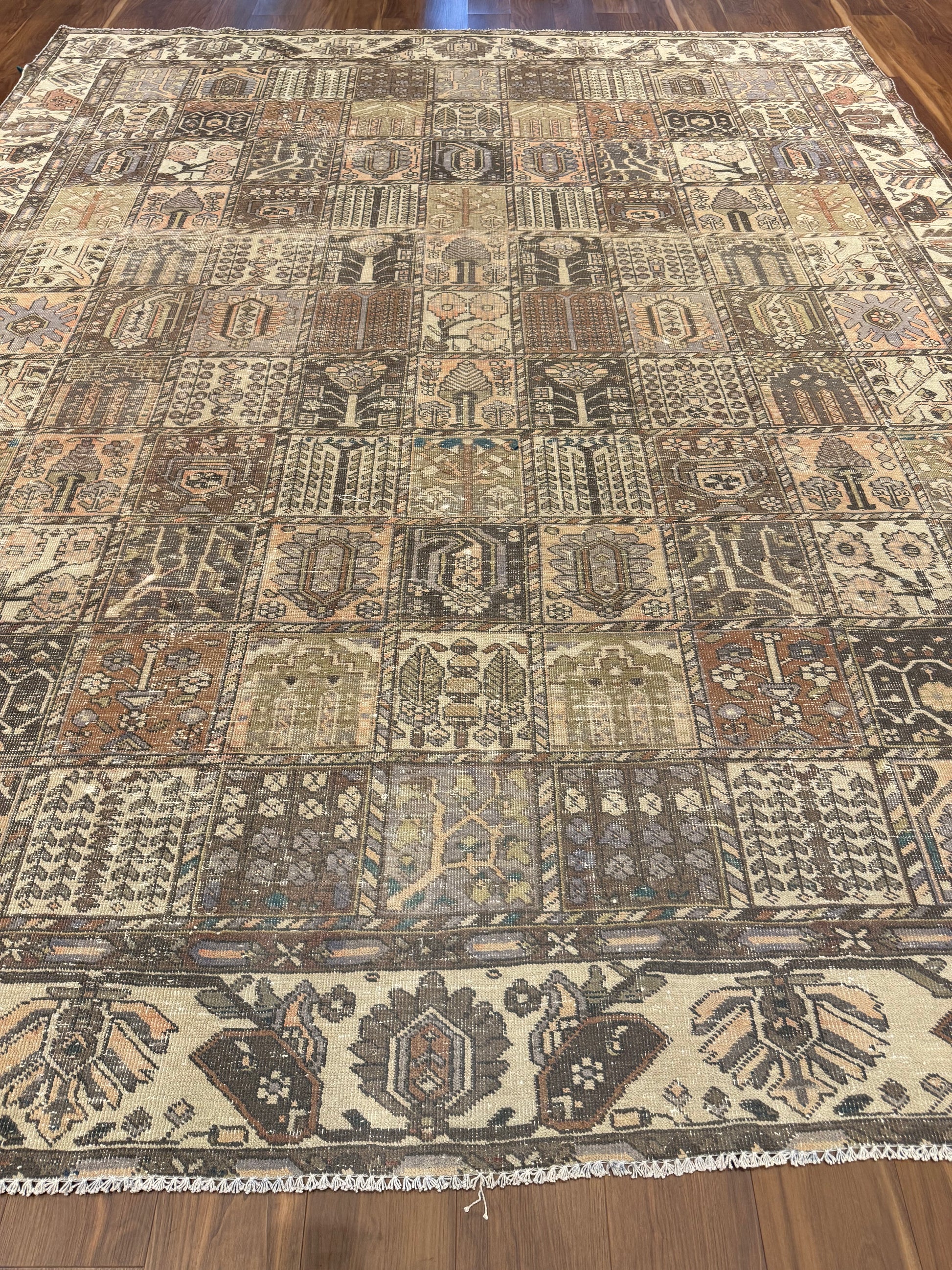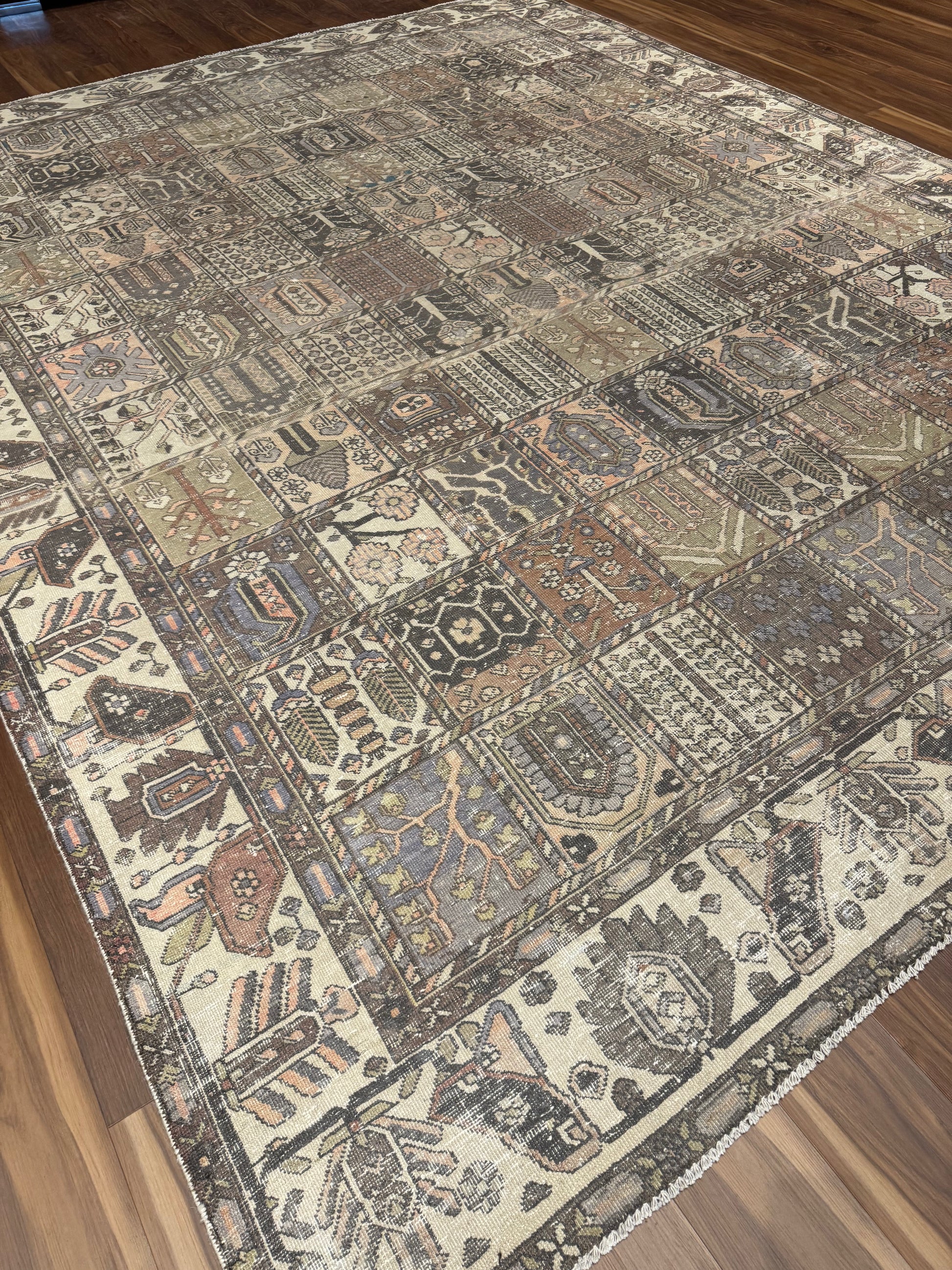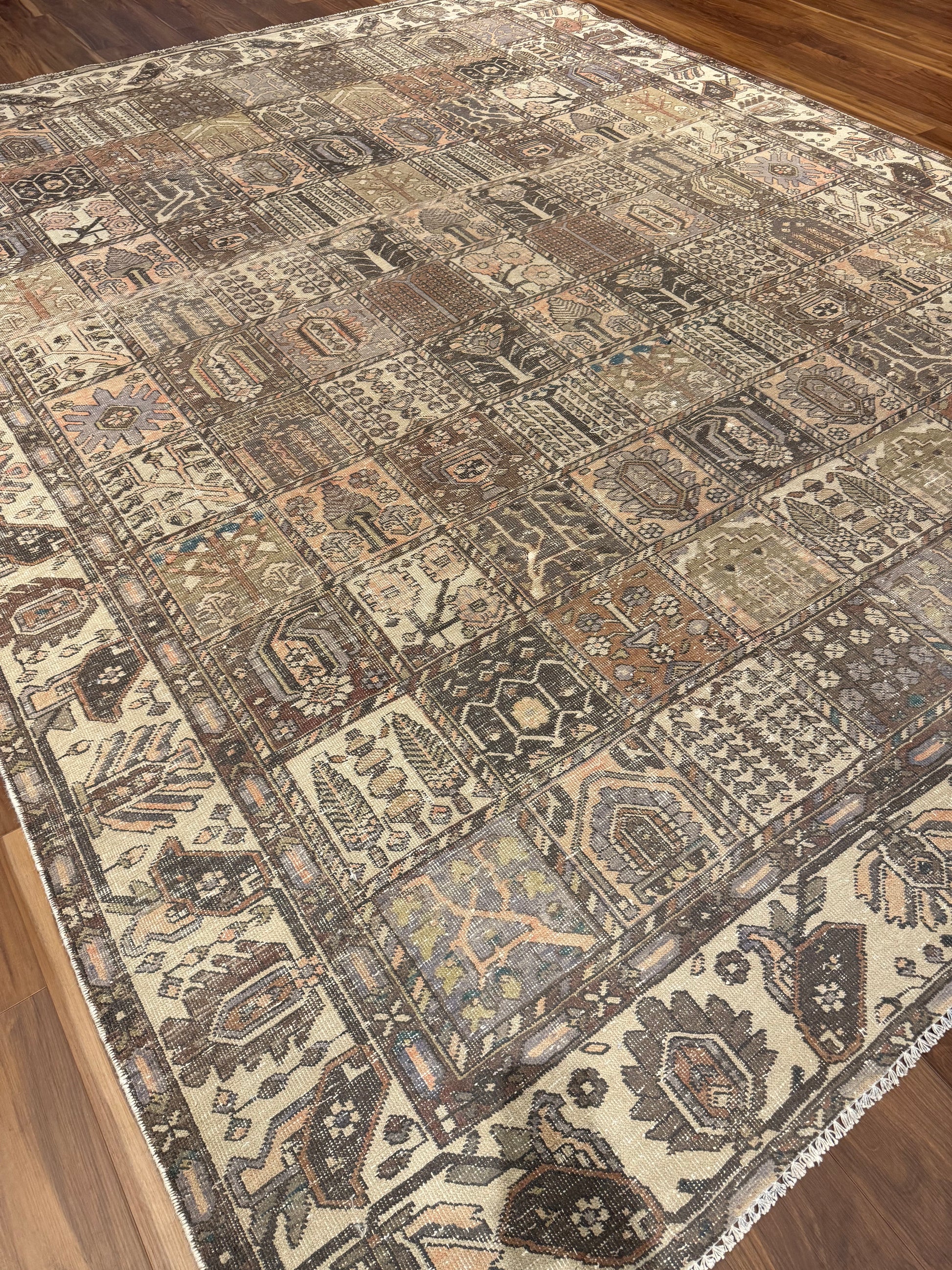 This exquisite Vintage Bakhtiari rug is a stunning example of classic Persian weaving artistry. Made of high-quality wool, it features an intricate patchwork of garden motifs, each panel displaying a unique pattern filled with floral elements, animals, and traditional geometric shapes, exuding a sense of historical richness and cultural heritage. The warm and earthy color palette complements a variety of interiors, making it a versatile addition to any space.