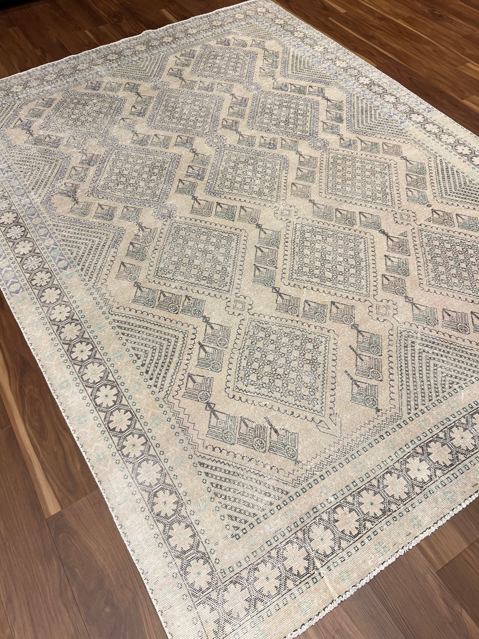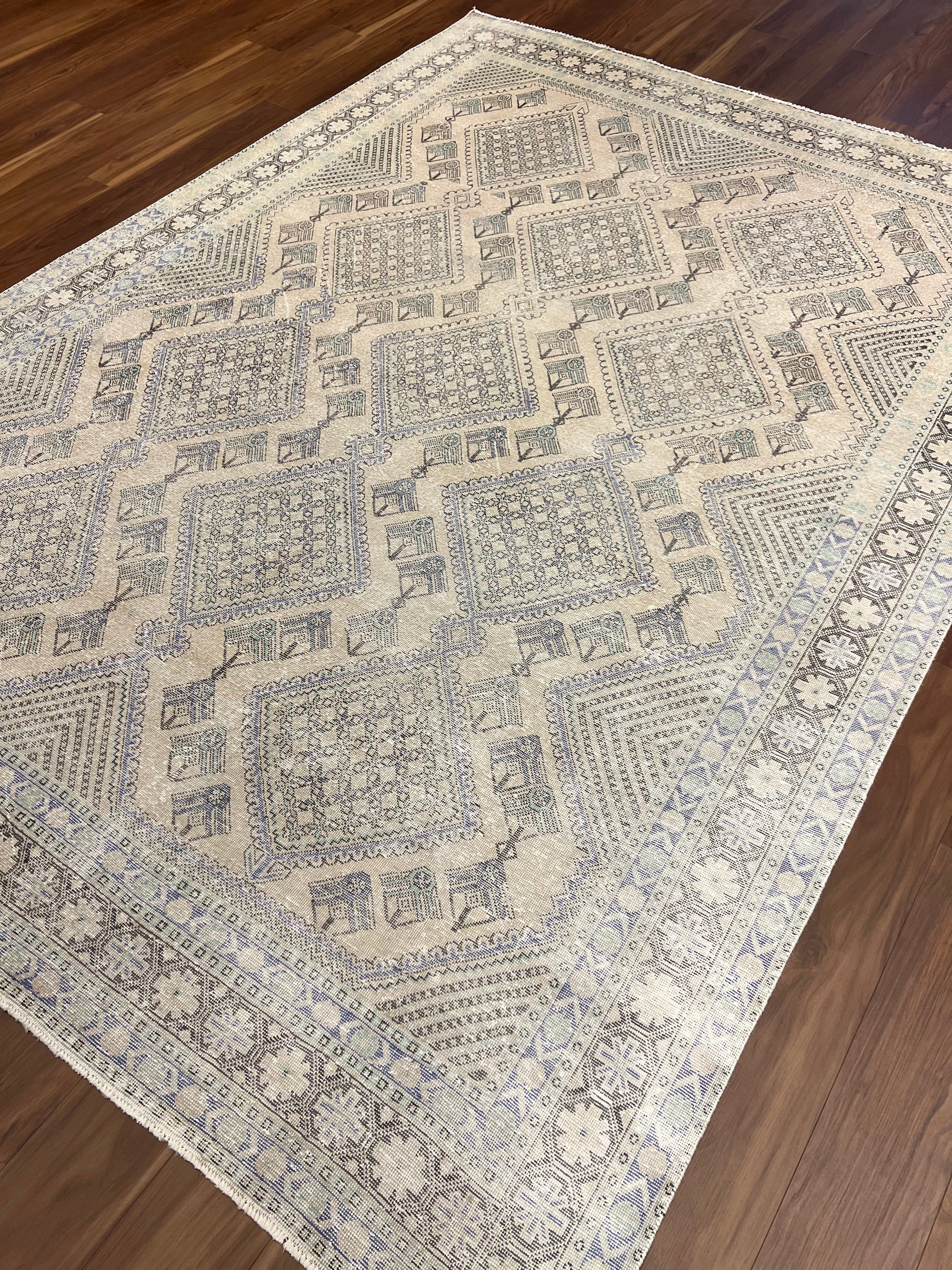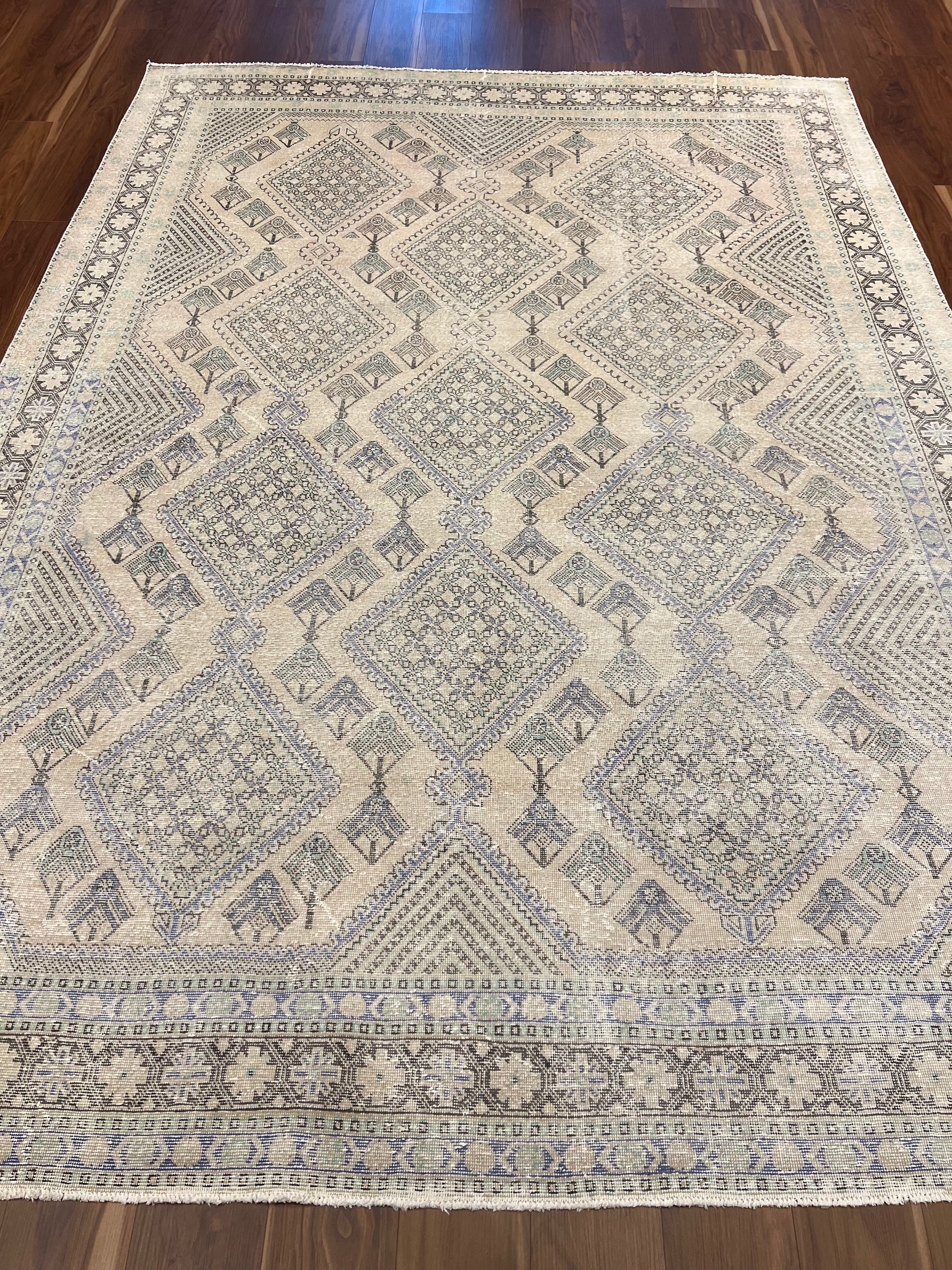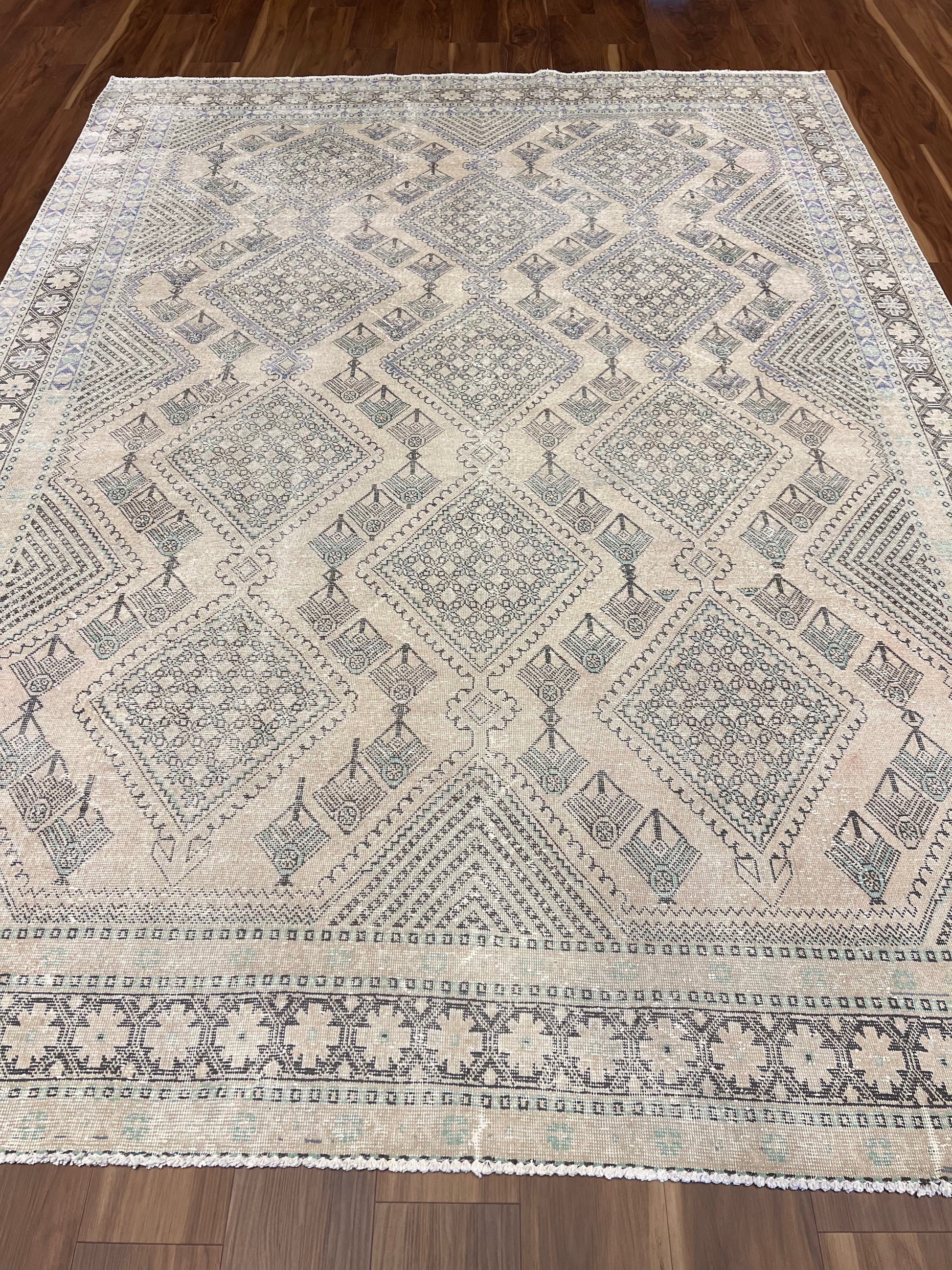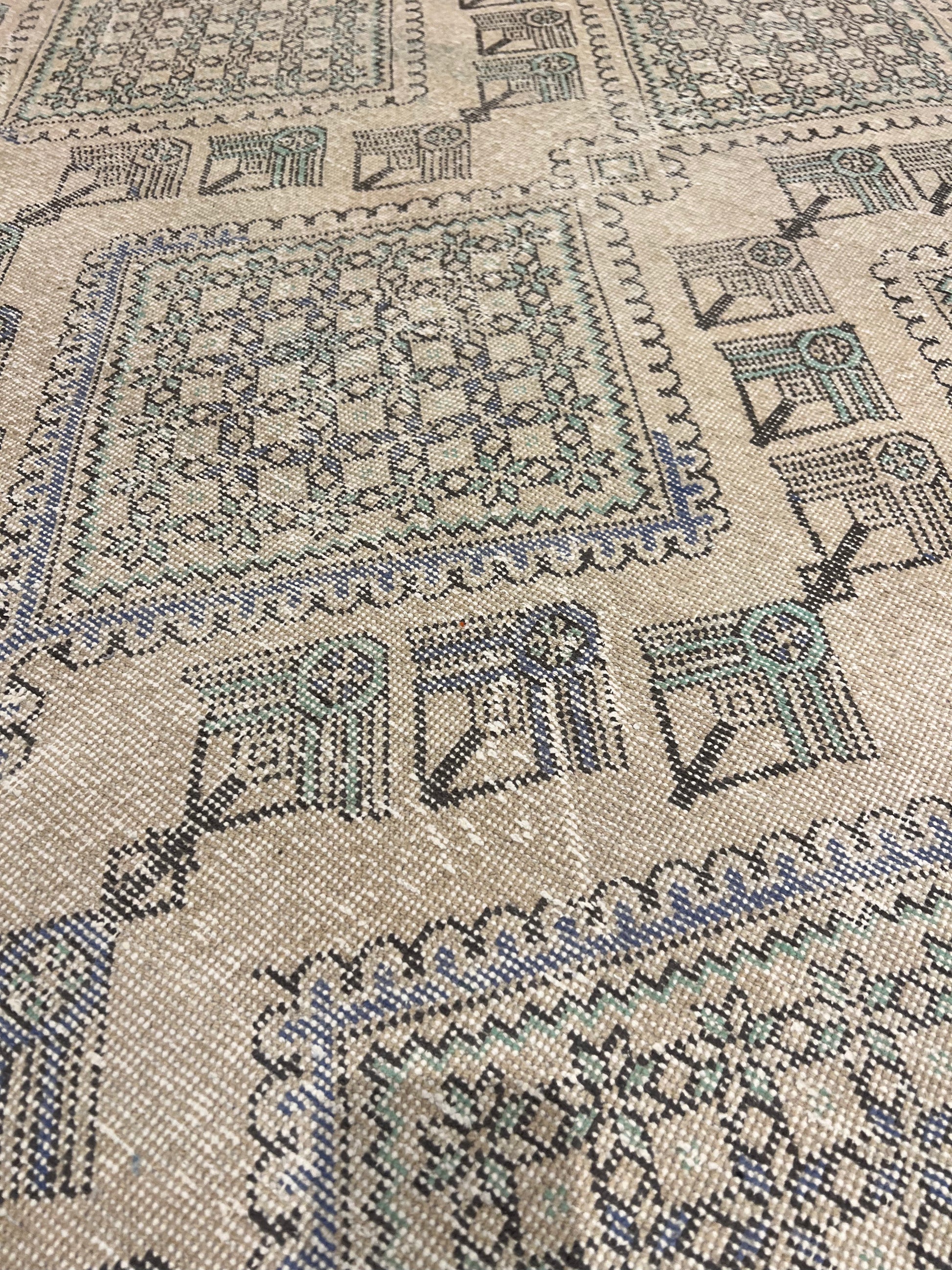 This Vintage Bidjar rug showcases the elegance of Persian craftsmanship. Made from high-quality wool, it features a harmonious beige color palette creating a warm and inviting atmosphere. The intricate details and geometric floral patterns interlace to form a sophisticated and timeless design. This piece offers durability and a luxurious feel, making it a perfect addition to any space seeking a touch of classic style with a well-worn charm.