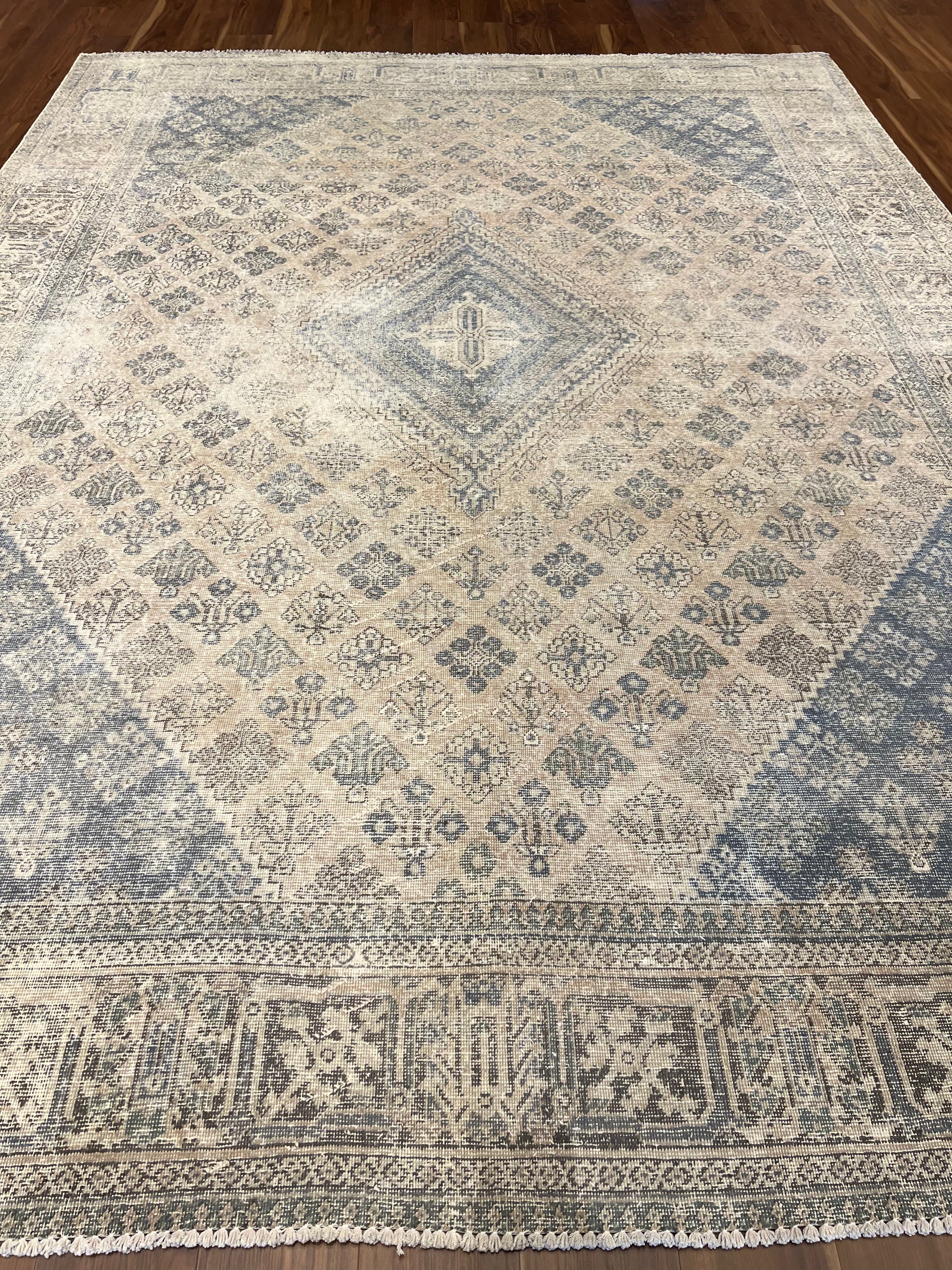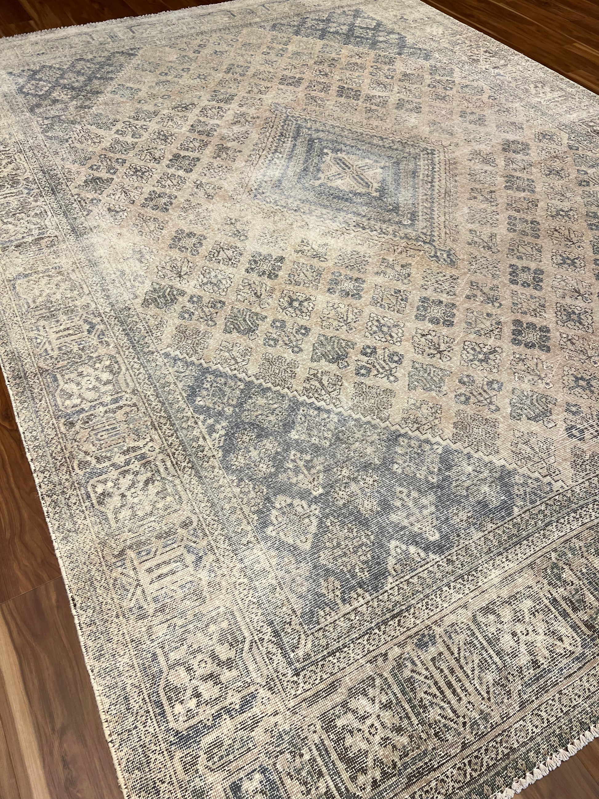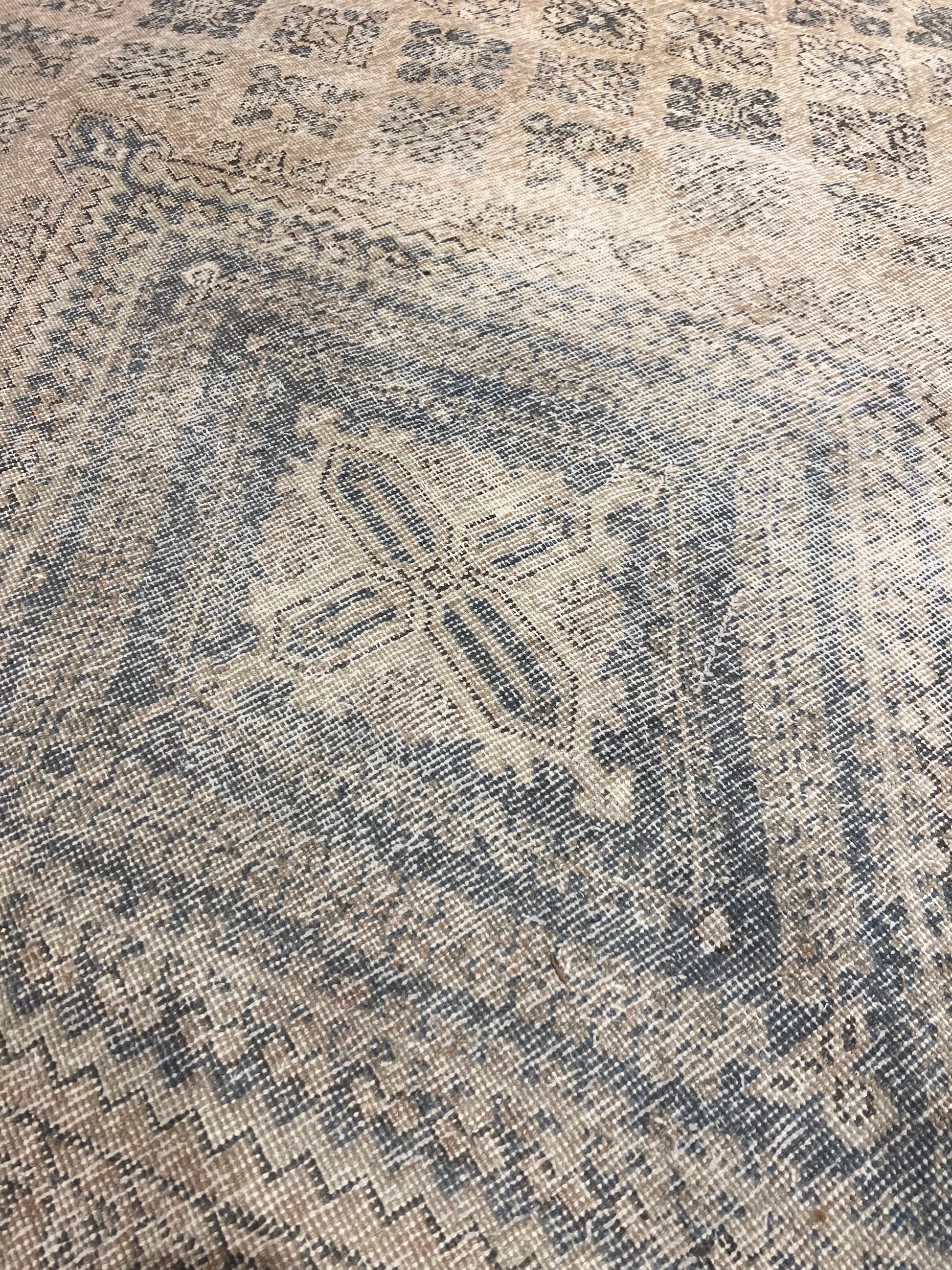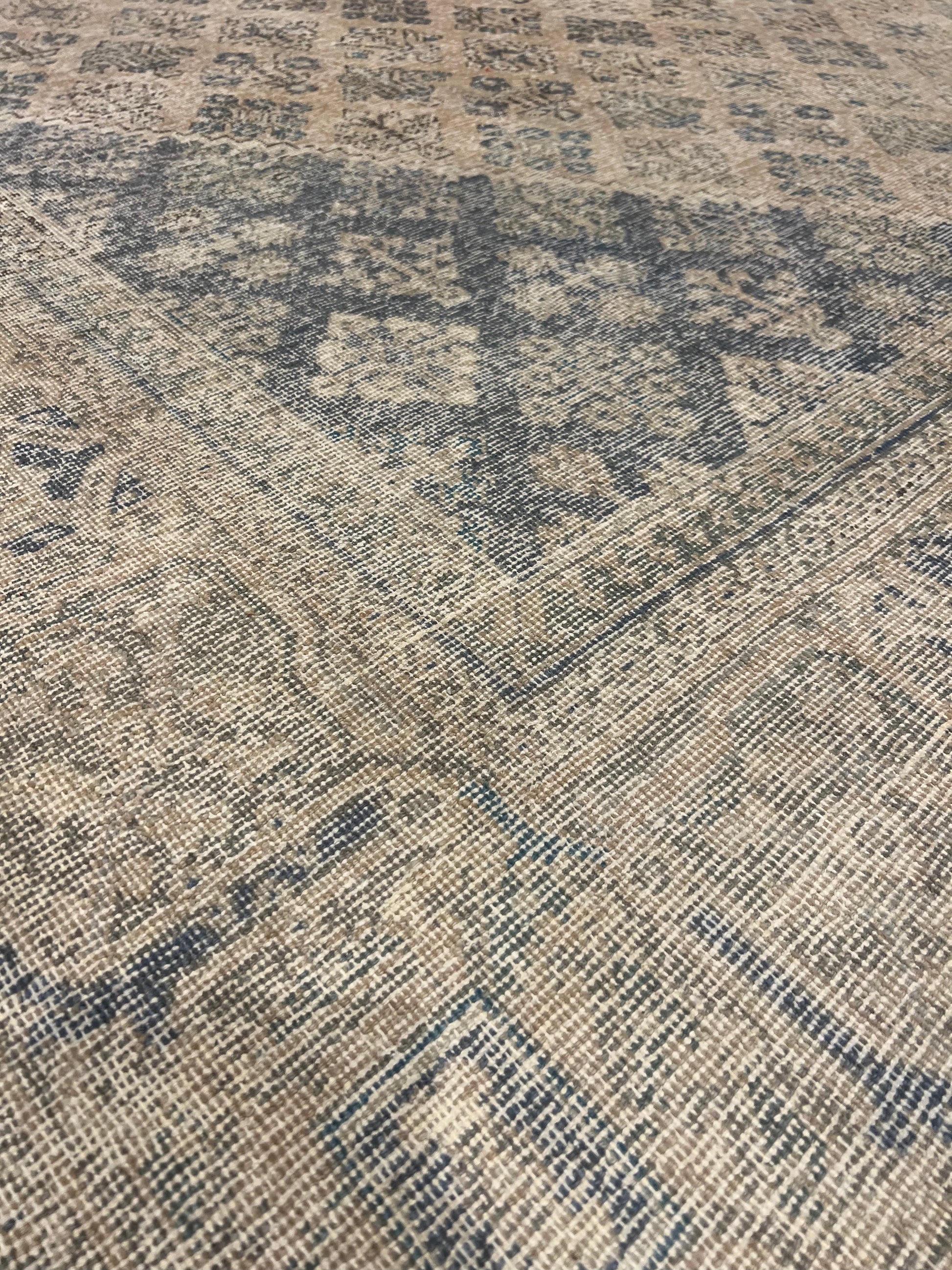This Vintage Bidjar rug presents a classic elegance with its symmetrical central medallion and geometrically patterned field. Composed of high-quality wool, the rug's worn and muted tones of beige, navy blue, and brown create a sense of antiquity and time-honored tradition. The detailed borders frame the piece, reinforcing its historic appeal suitable for both modern and classic interiors. Its robust composition ensures durability while offering a soft, textured underfoot.