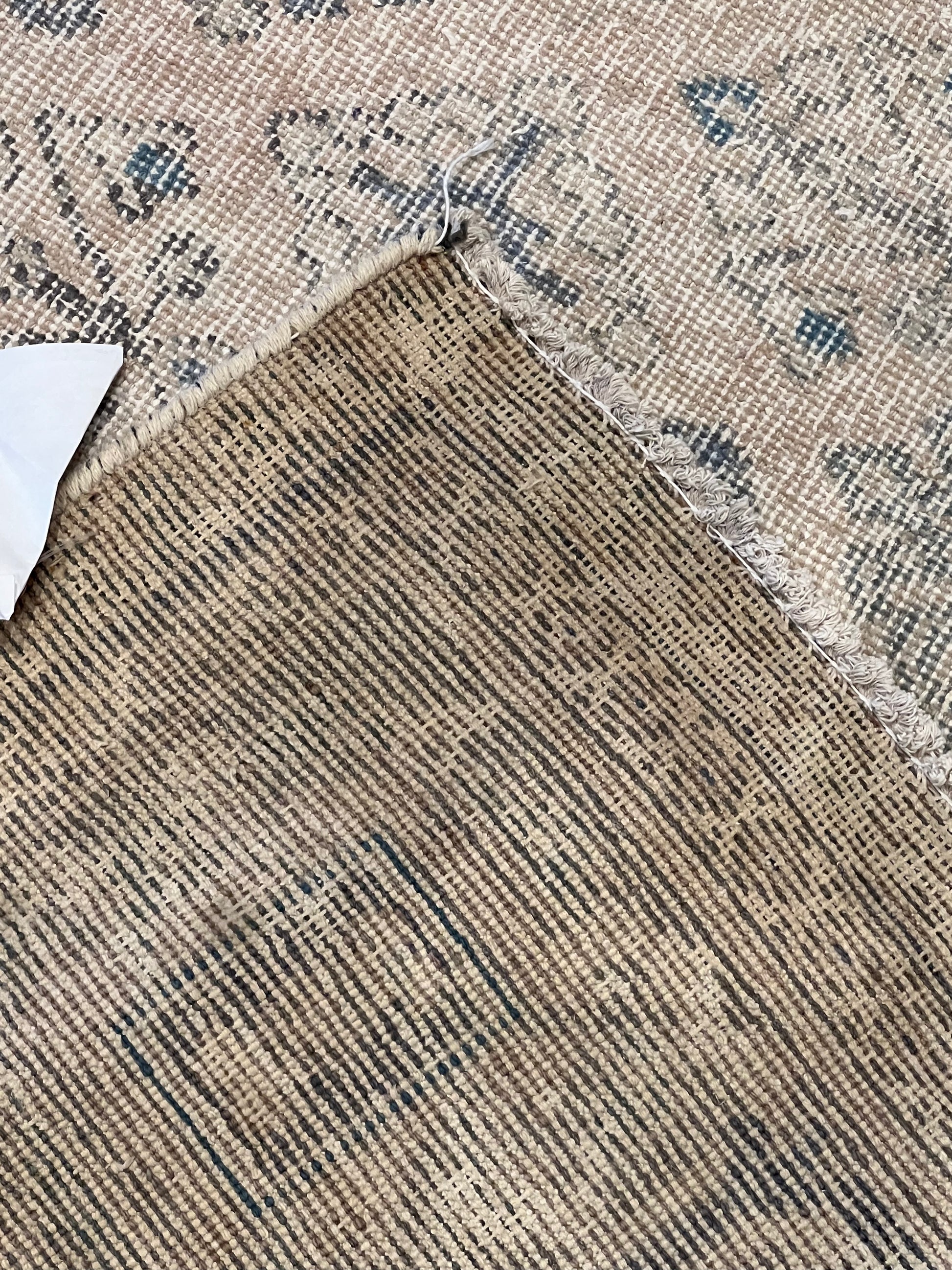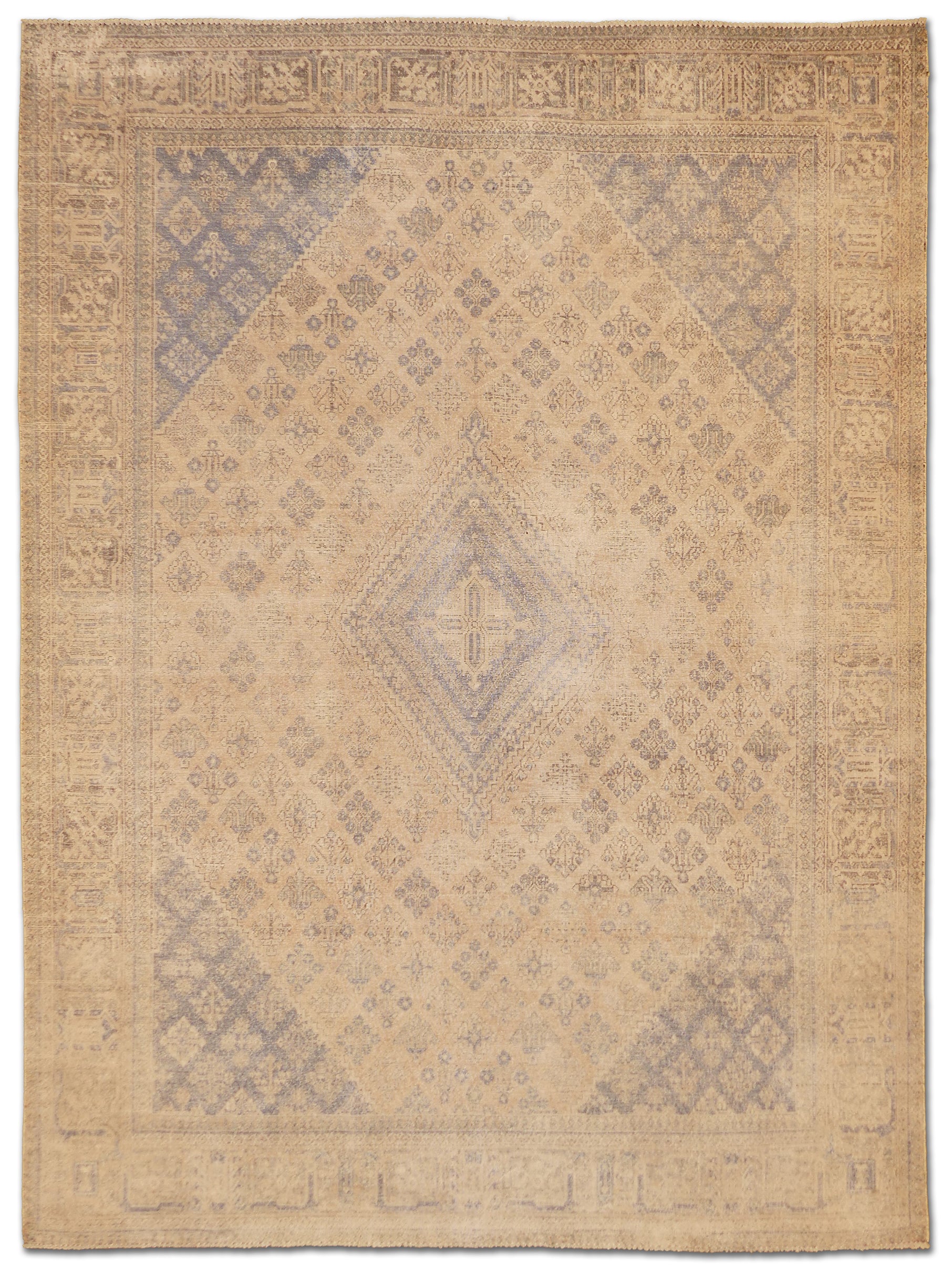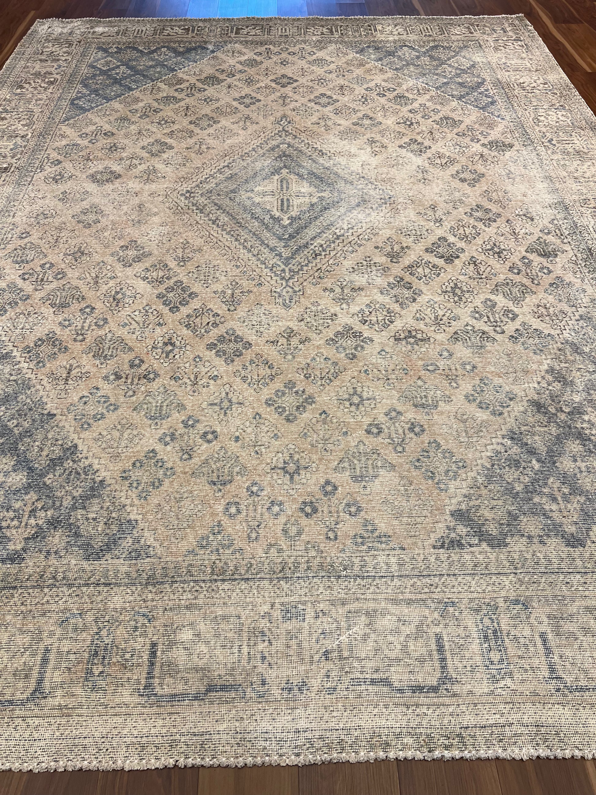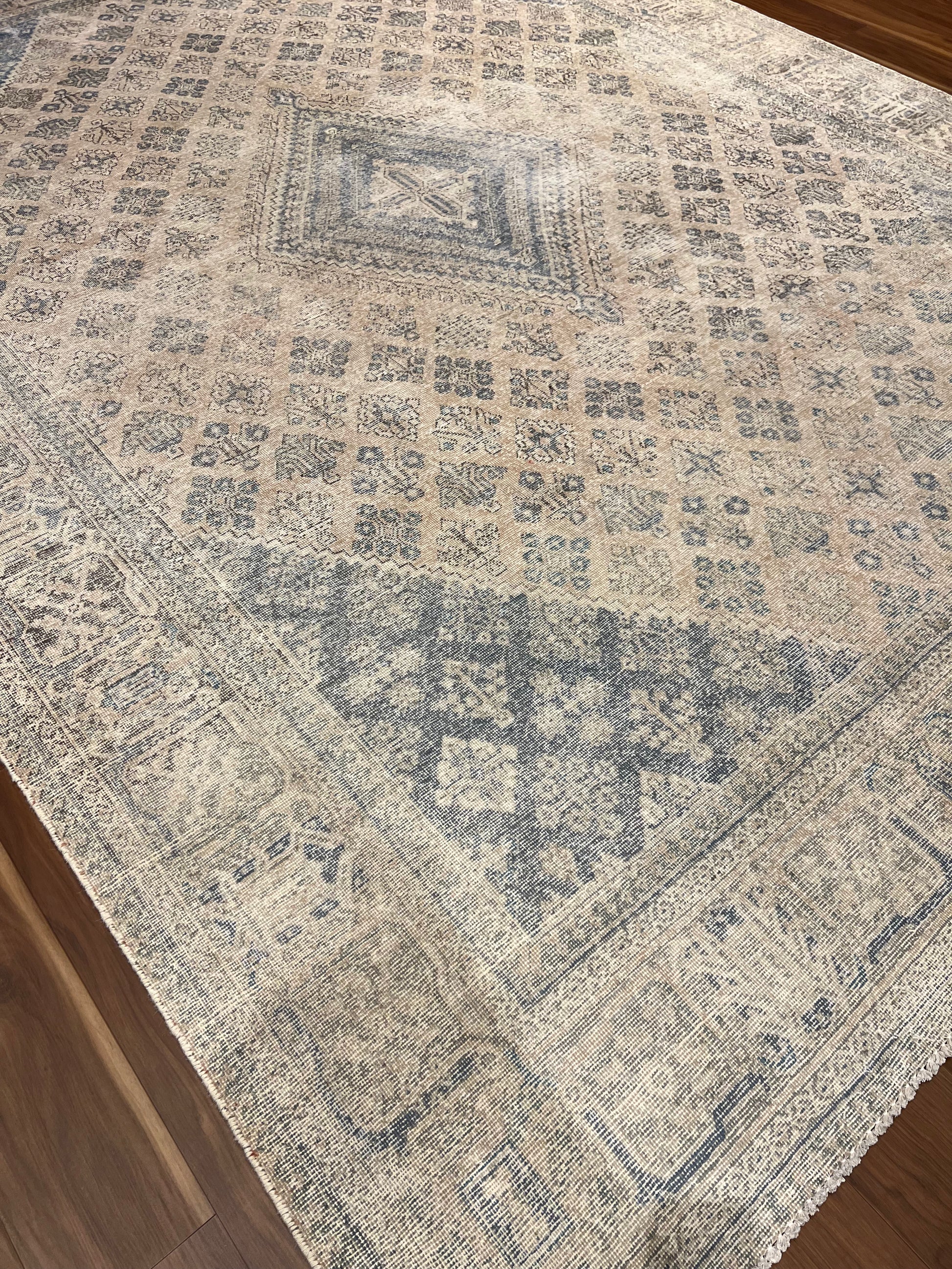This Vintage Bidjar rug presents a classic elegance with its symmetrical central medallion and geometrically patterned field. Composed of high-quality wool, the rug's worn and muted tones of beige, navy blue, and brown create a sense of antiquity and time-honored tradition. The detailed borders frame the piece, reinforcing its historic appeal suitable for both modern and classic interiors. Its robust composition ensures durability while offering a soft, textured underfoot.