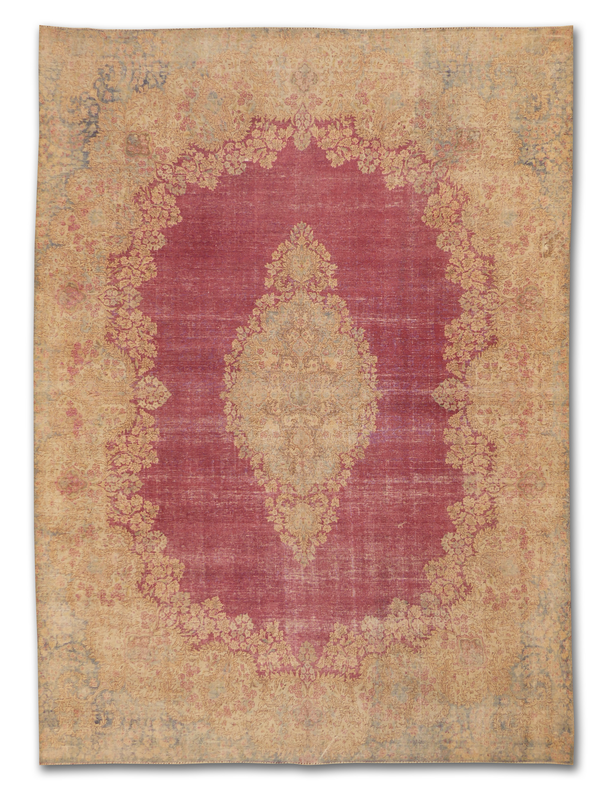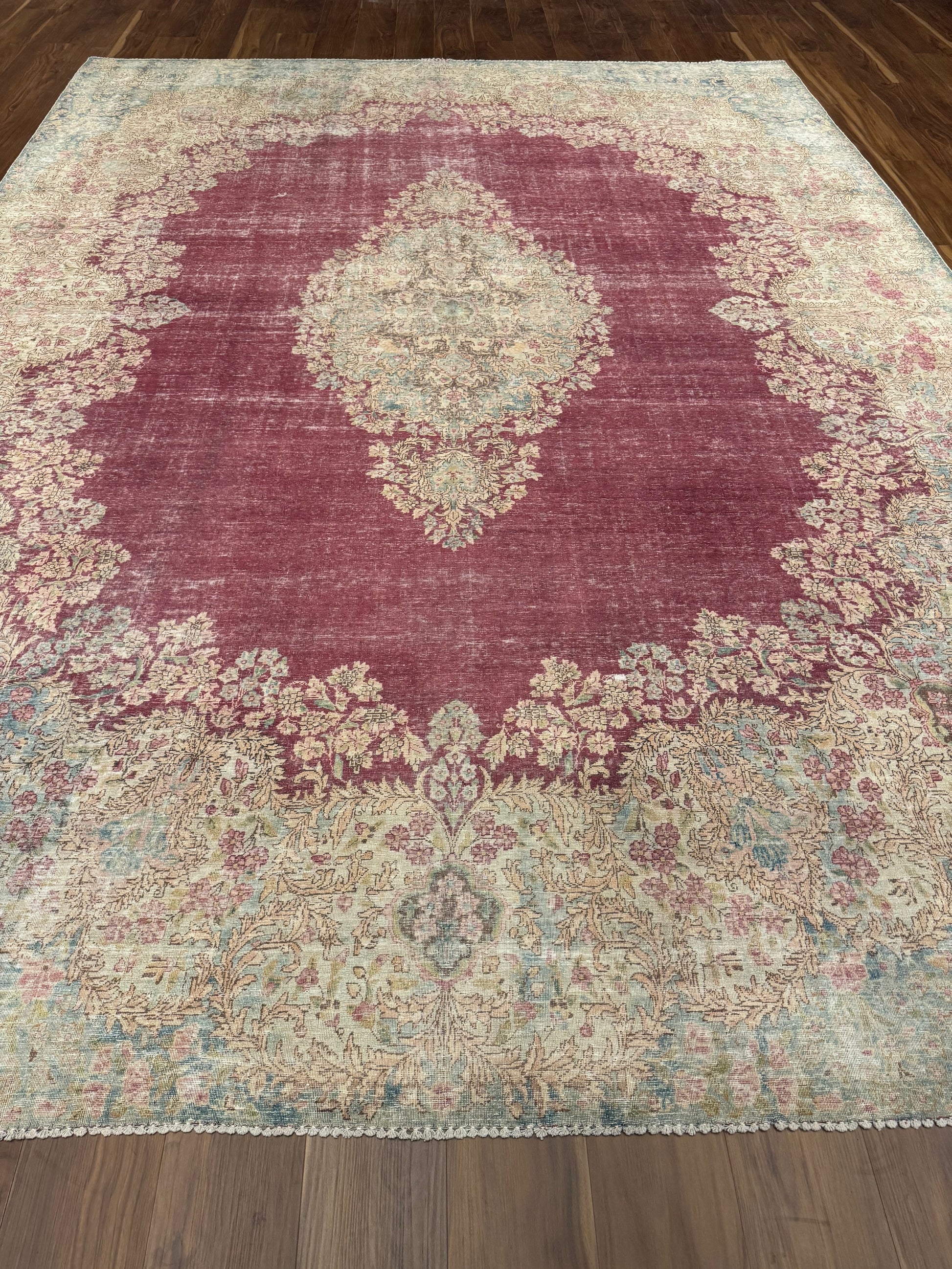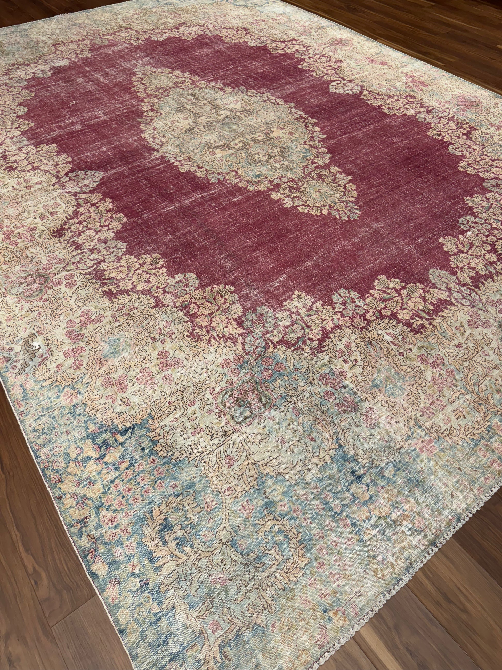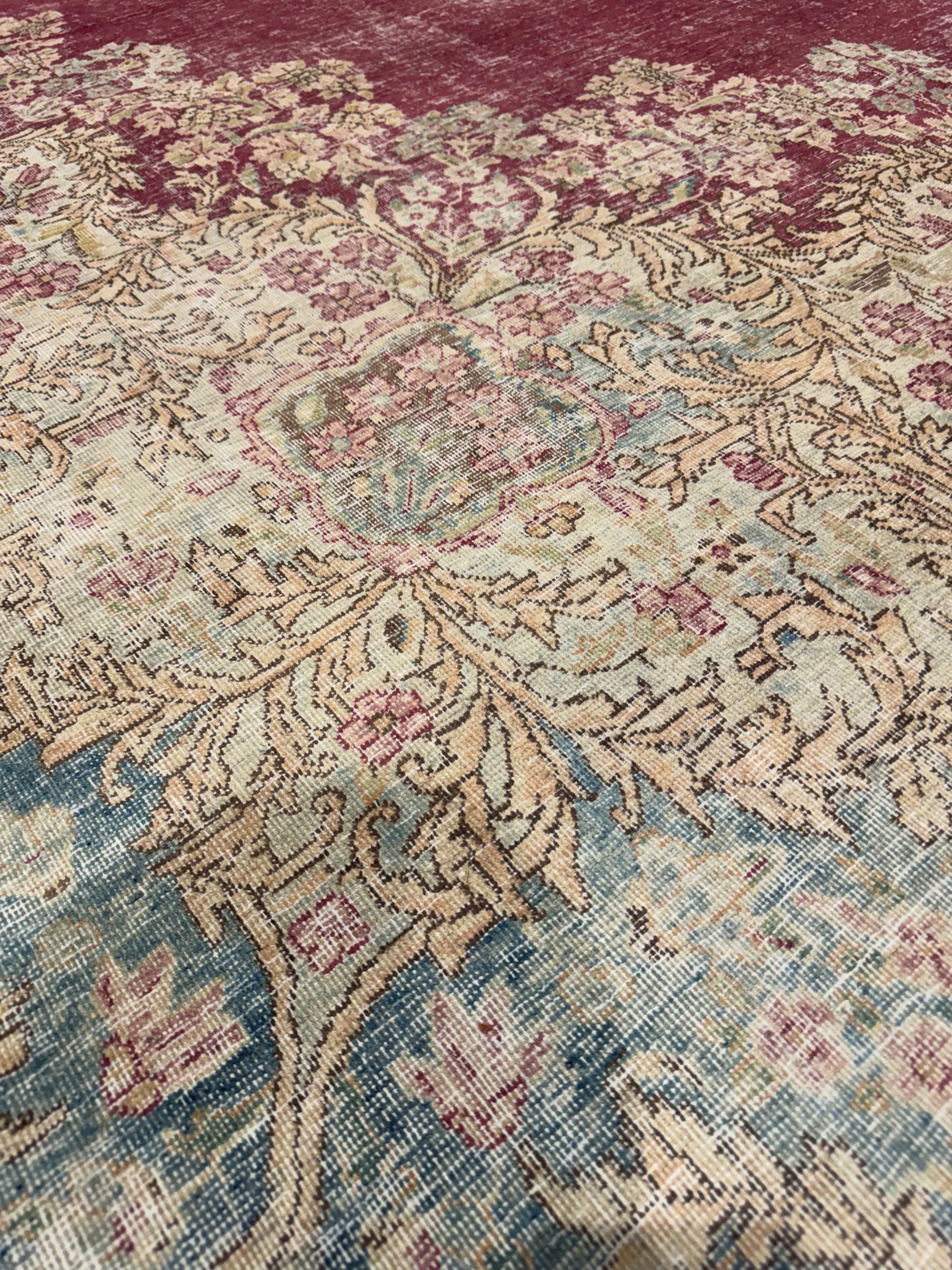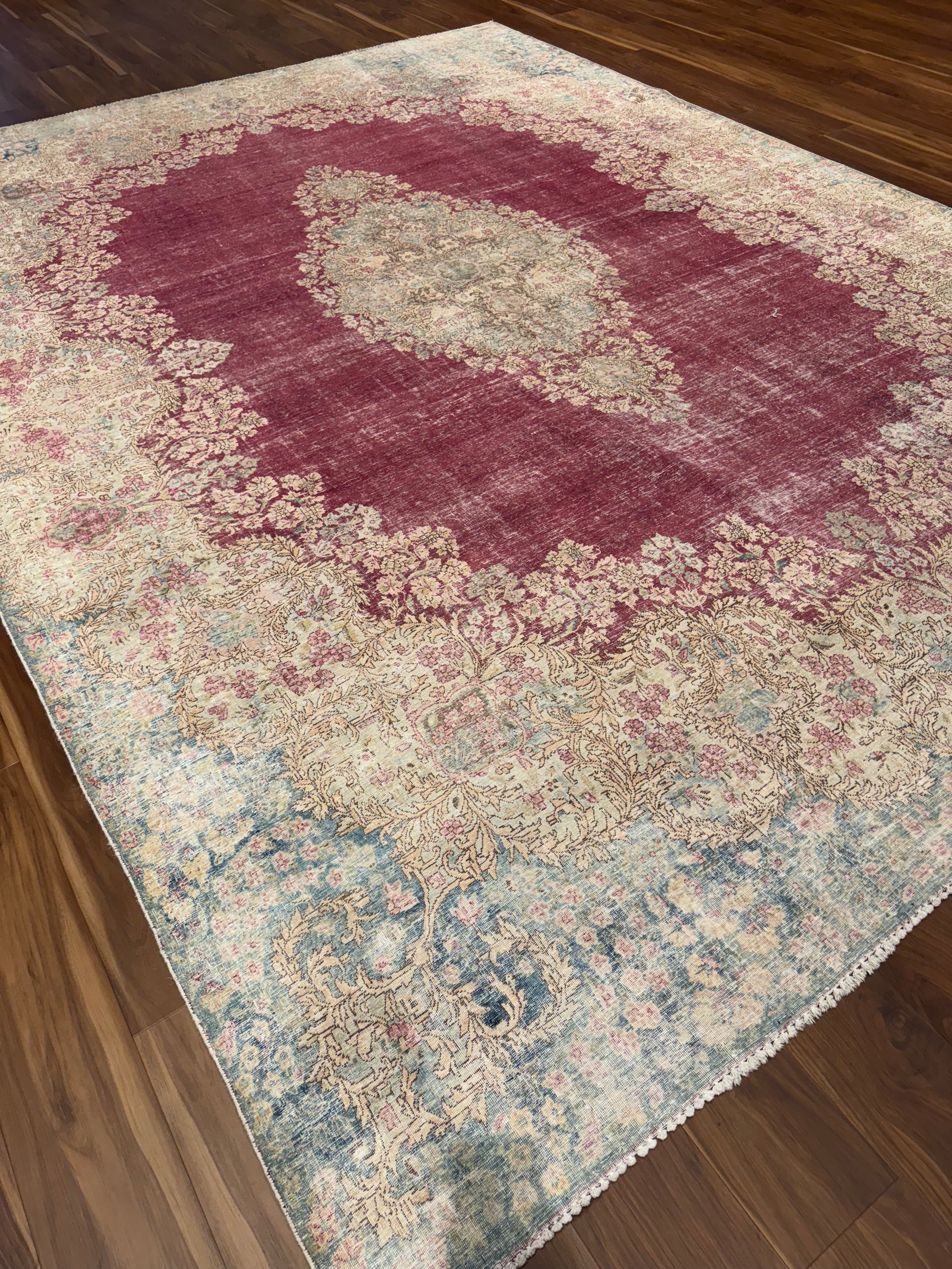 This Vintage Kirman rug is a timeless piece that combines the grandeur of classical design with the unique patina of age. Made of high-quality wool, it features a central medallion in rich burgundy surrounded by intricate floral motifs in golden and beige hues, fading gently into a serene blue edge. The subtle wear effect accentuates the piece's vintage charm, making it an elegant statement for any room.
