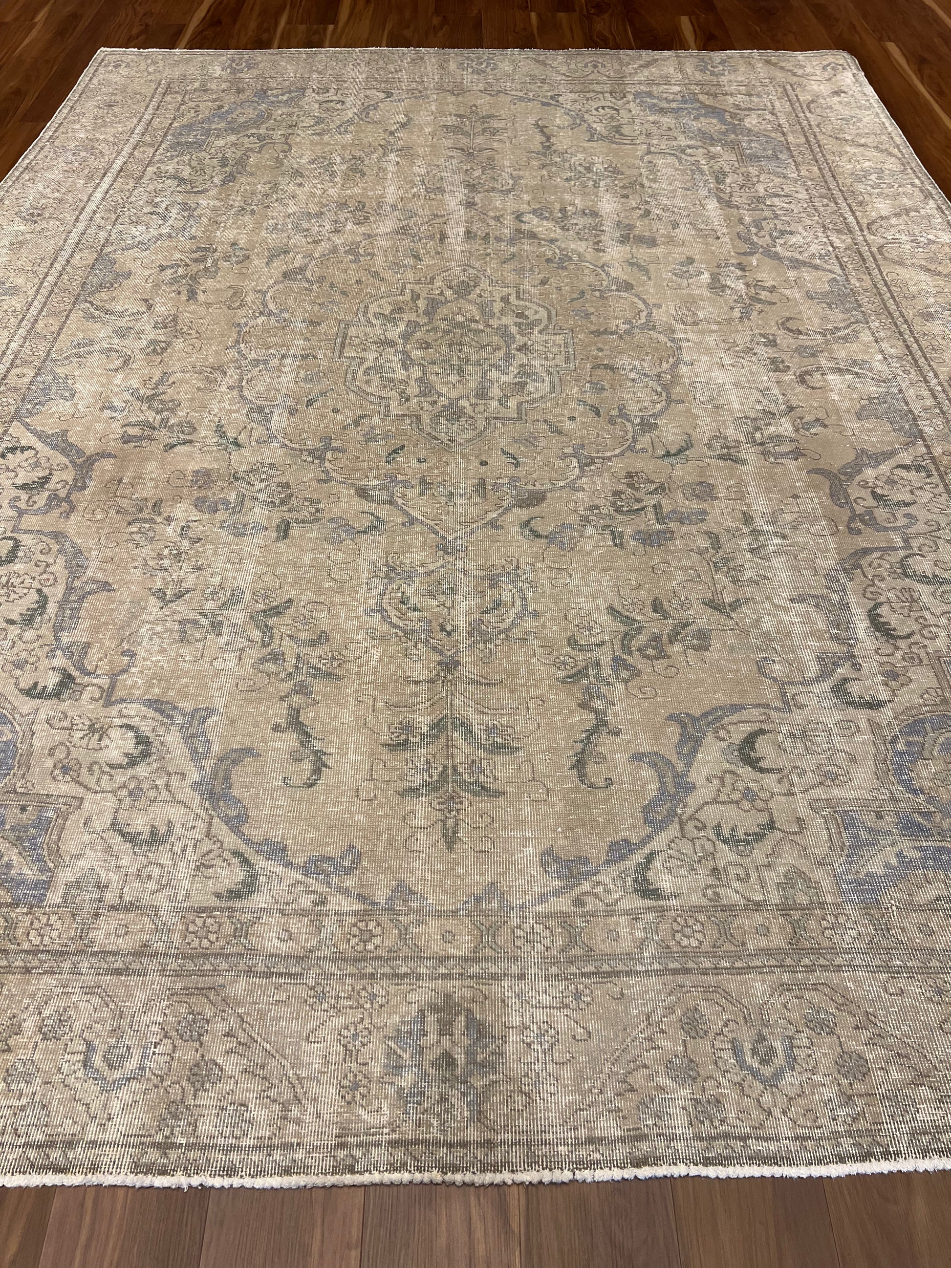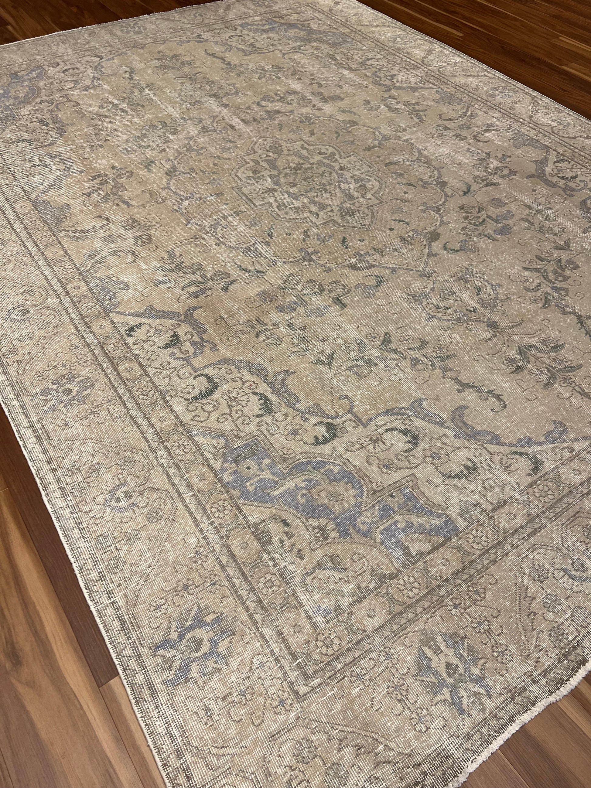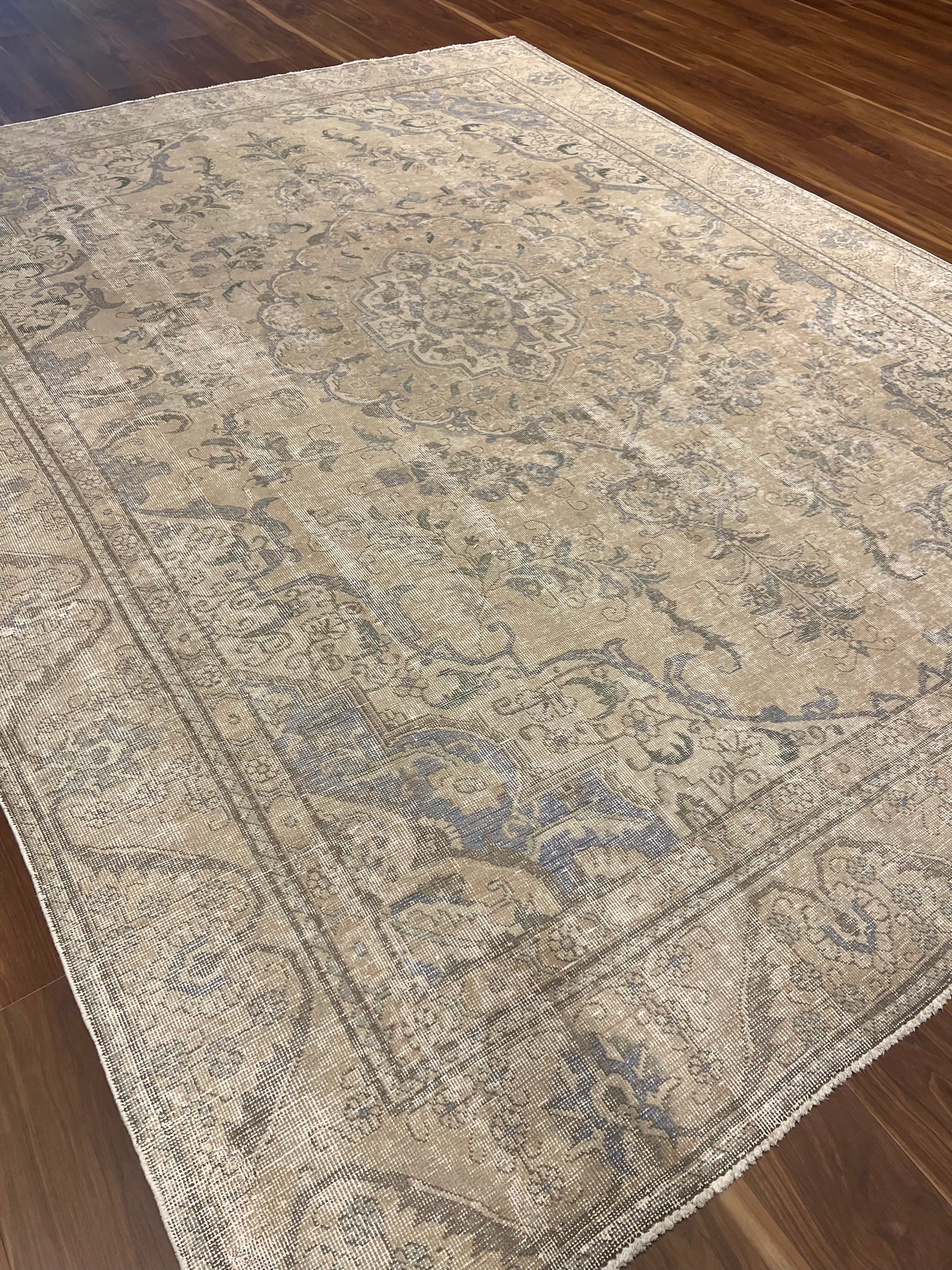 This exquisite Vintage Wool Rug showcases a stunning traditional design, delicately crafted to create an heirloom feel with modern wear. The muted beige and taupe palette is accented with hints of blue, creating an elegant foundation for any room. The intricate patterns and faint floral motifs present a timeless appeal, while the wool construction provides durability and a soft underfoot experience. This rug is ideal for spaces in which you aim to evoke a sense of history and artistry.