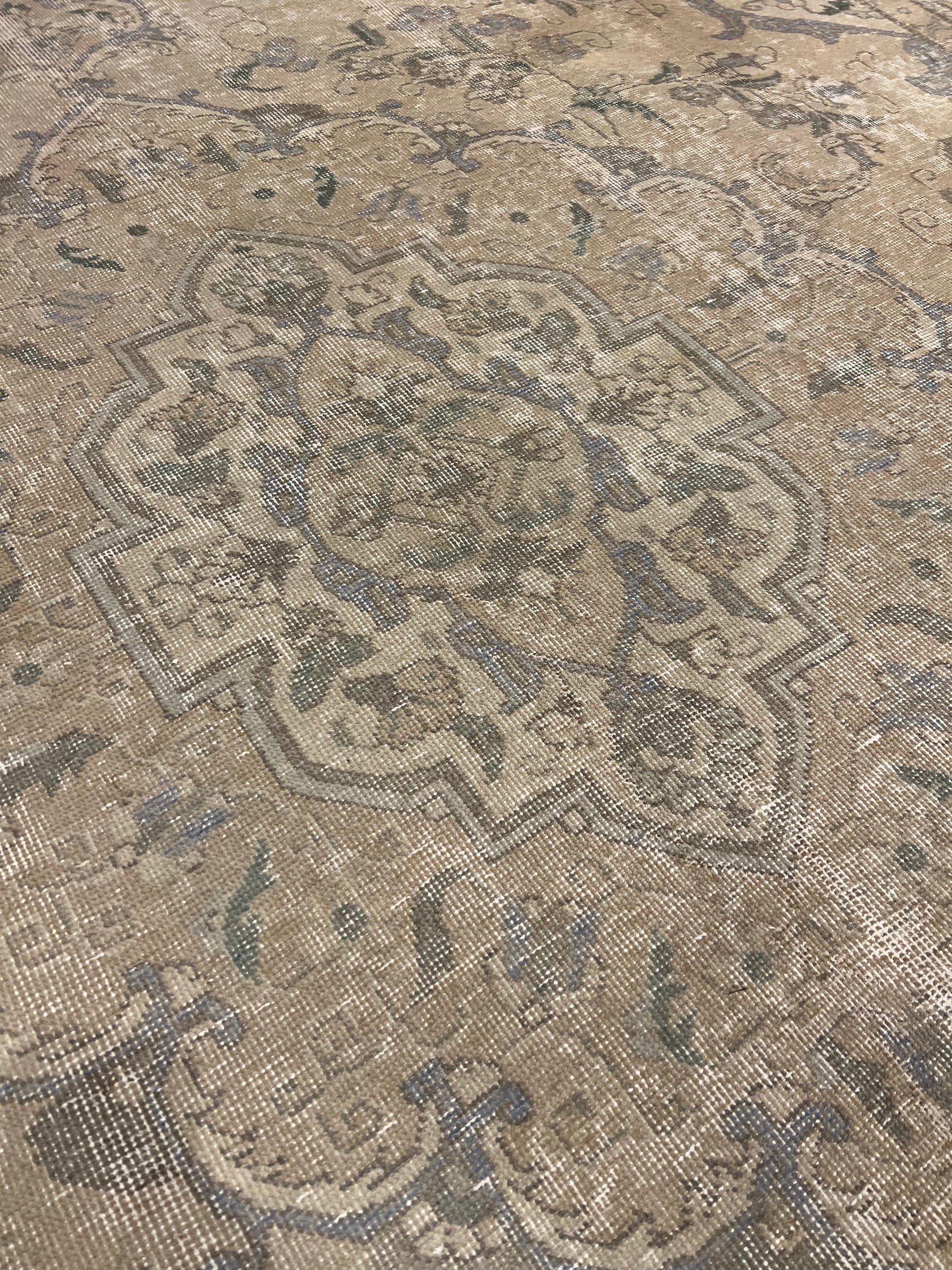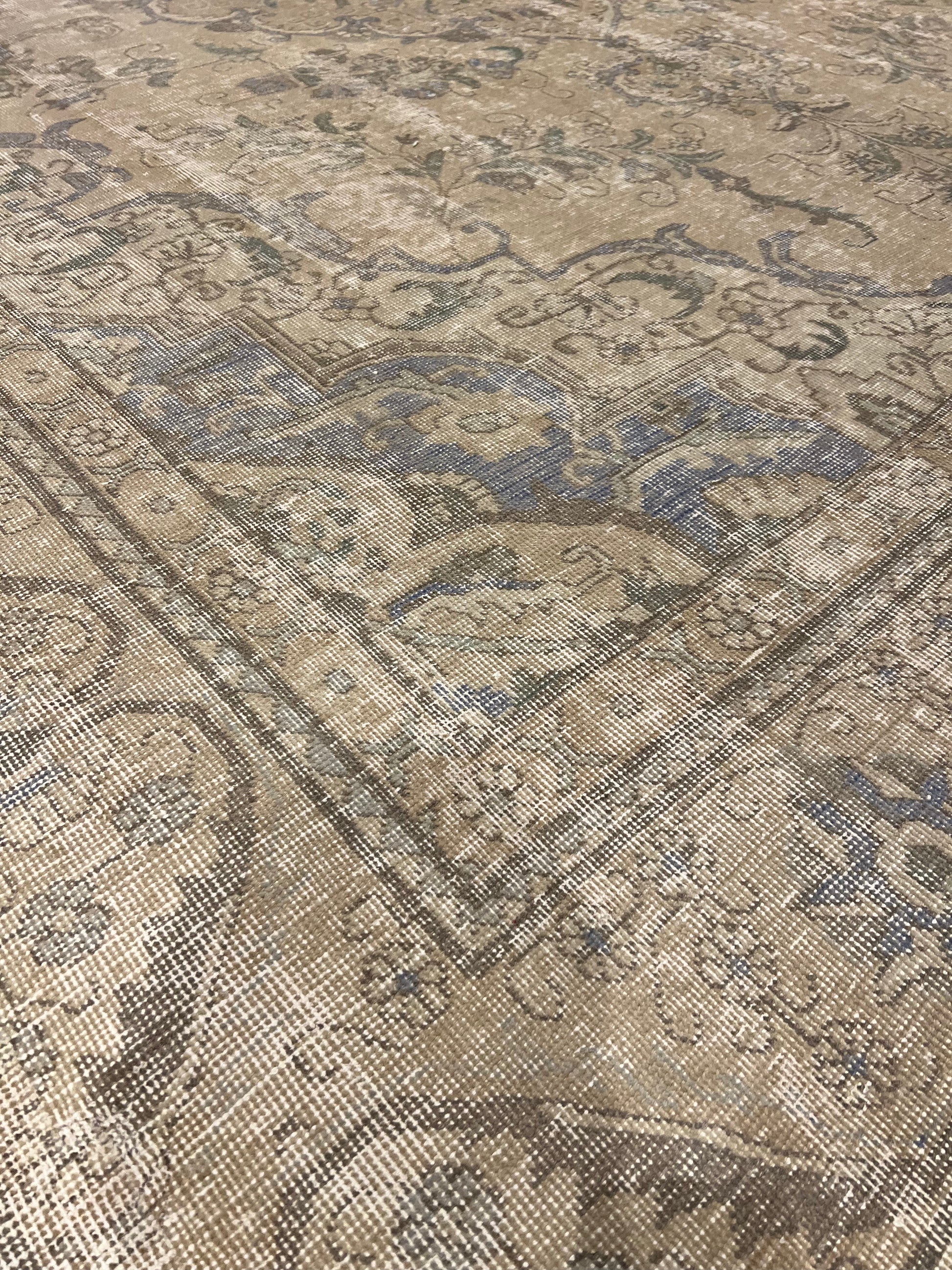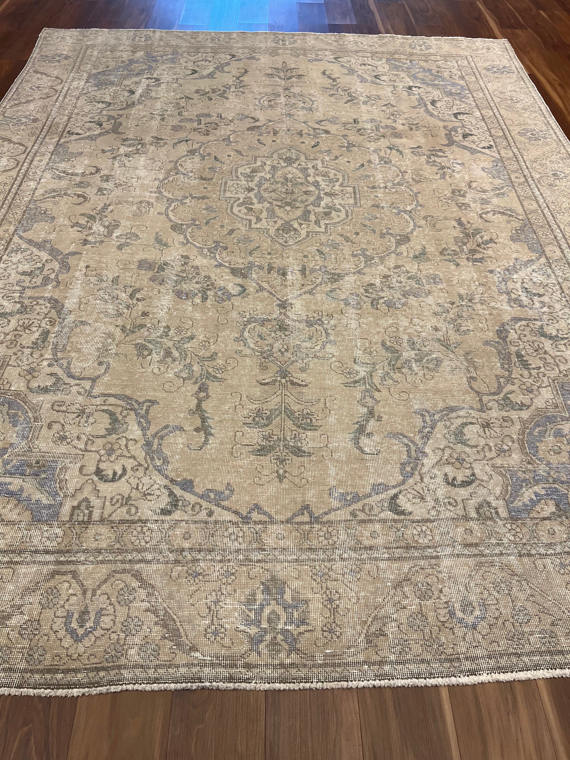 This exquisite Vintage Wool Rug showcases a stunning traditional design, delicately crafted to create an heirloom feel with modern wear. The muted beige and taupe palette is accented with hints of blue, creating an elegant foundation for any room. The intricate patterns and faint floral motifs present a timeless appeal, while the wool construction provides durability and a soft underfoot experience. This rug is ideal for spaces in which you aim to evoke a sense of history and artistry.