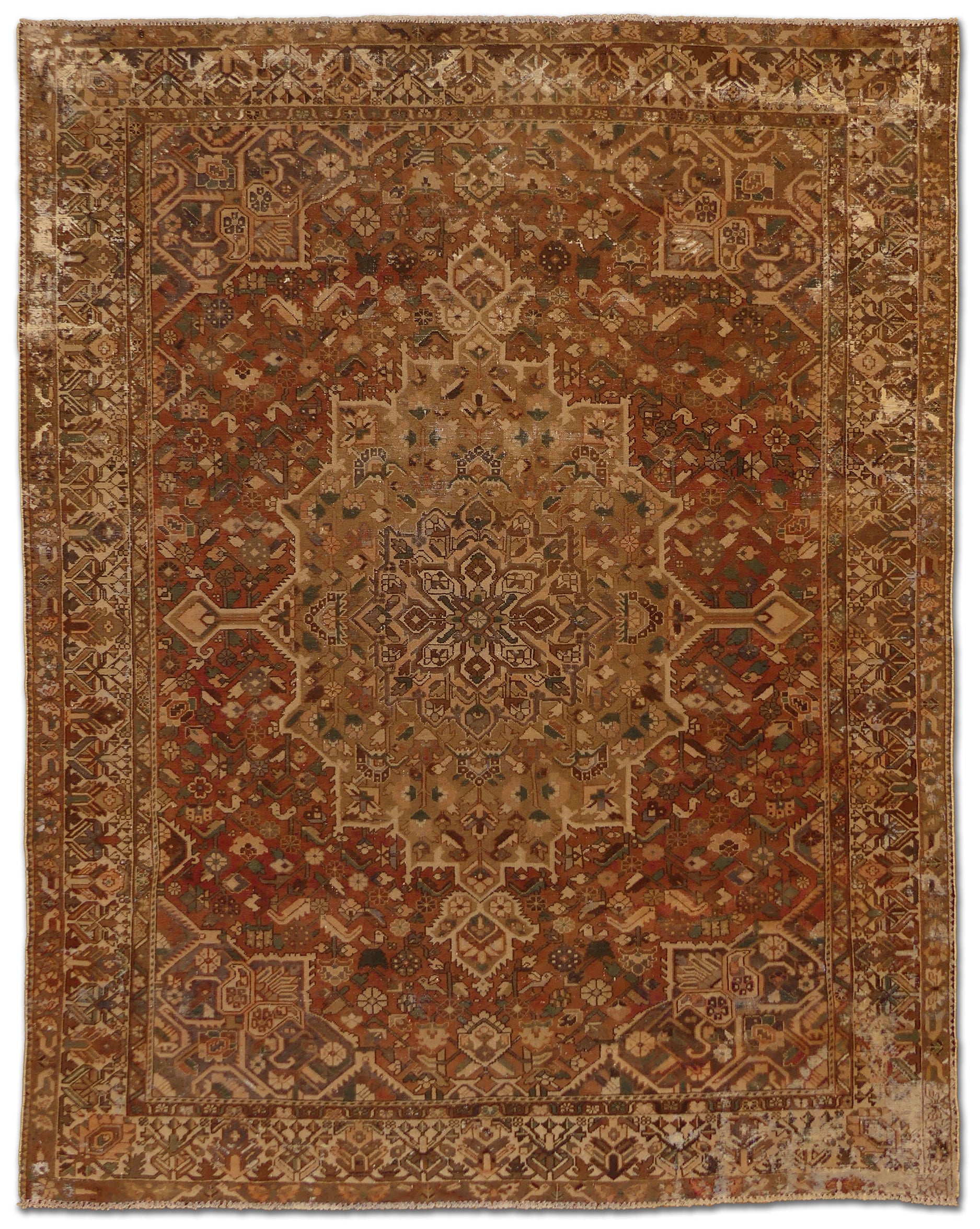 This exquisite Vintage Serapi/Heriz rug features a rich weave of rust, beige, brown, ivory, and a hint of green, making it a magnificent centerpiece for any room. Crafted from high-quality wool, the rug boasts traditional motifs and intricate patterns that evoke the grandeur of the past. Resonating with the elegance of ancient hand-knotted techniques, its geometric precision suggests a deep cultural heritage, ideal for bringing warmth and historical charm to your living space.